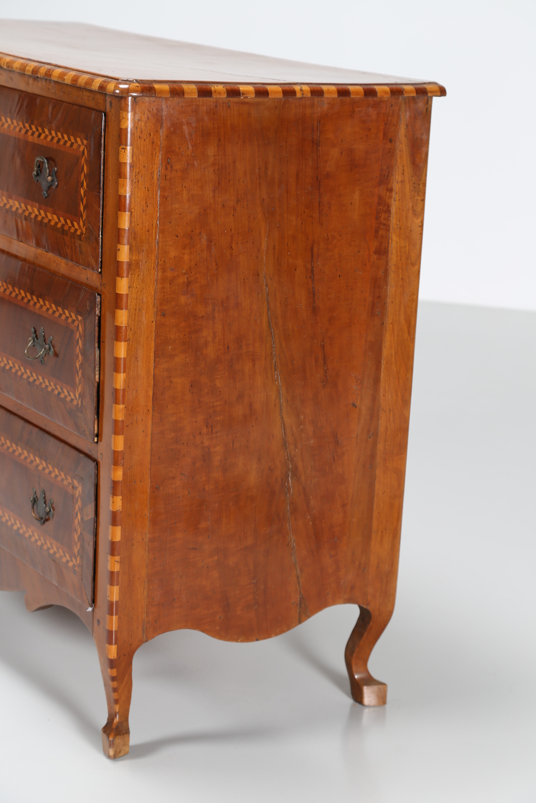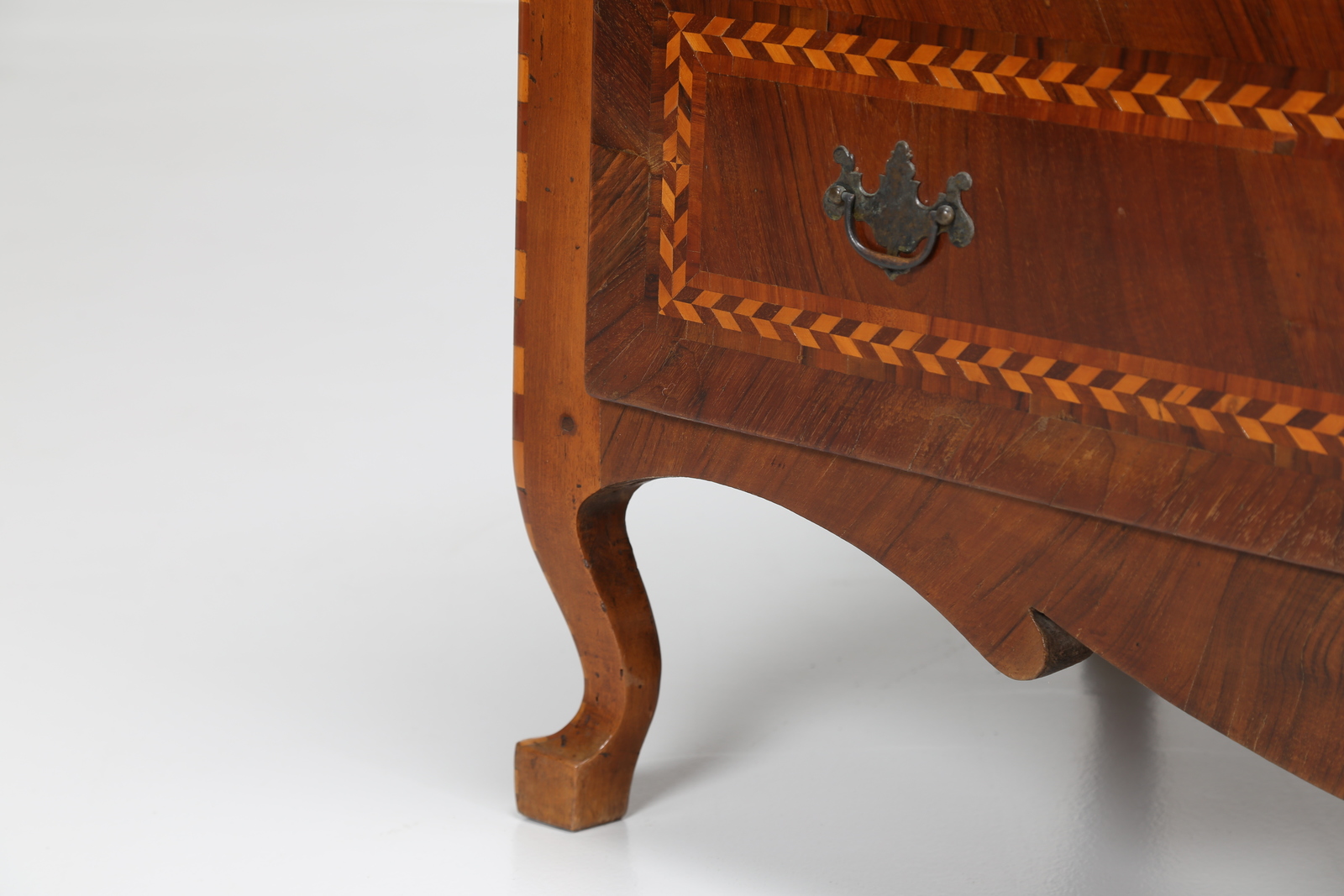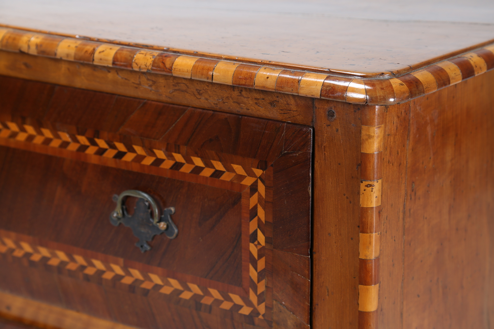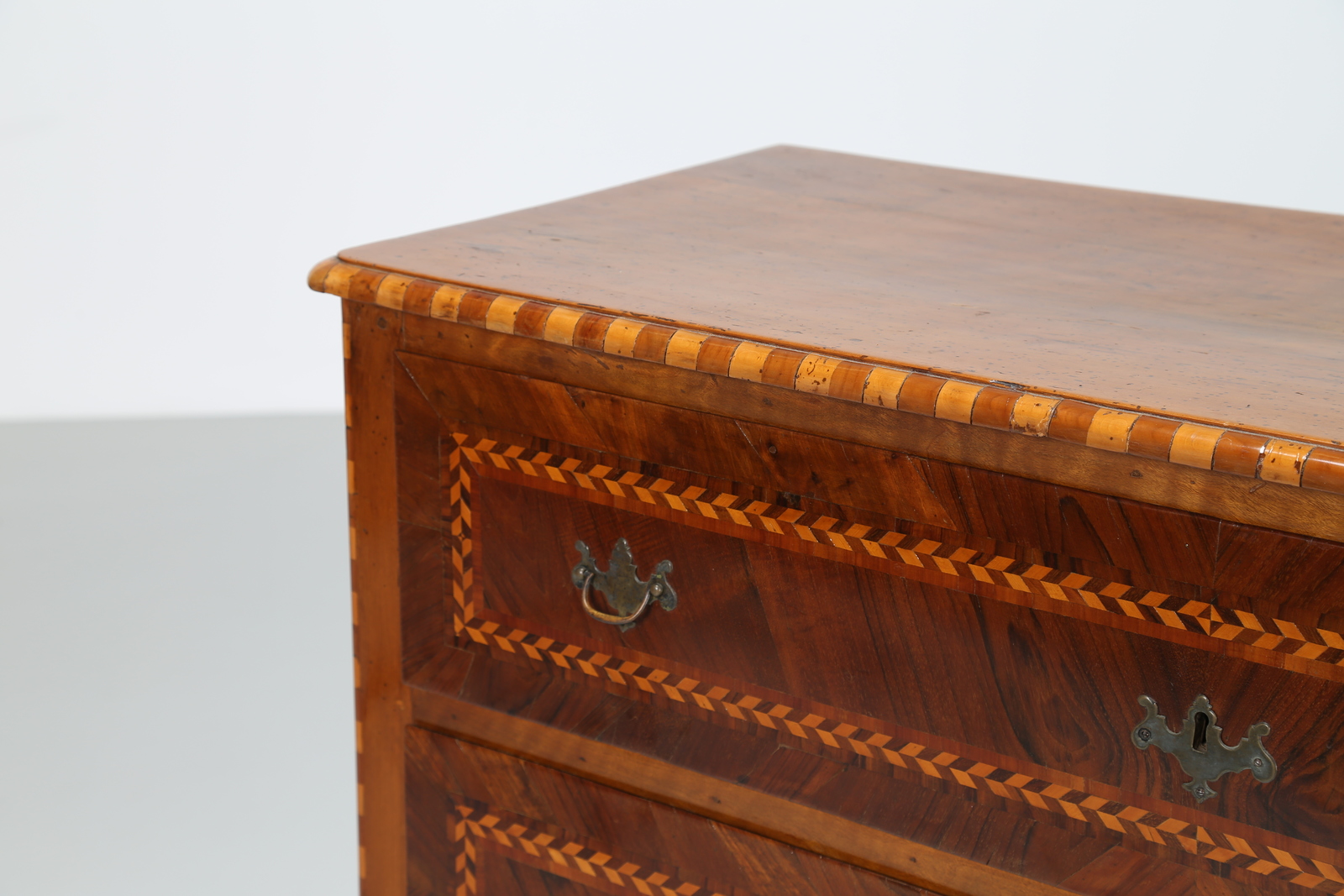 MANIFATTURA DEL XVIII SECOLO Cassettone lastronato e filettato a motivi geometrici. . Cm 128,50 x 105,00 x 55,00.