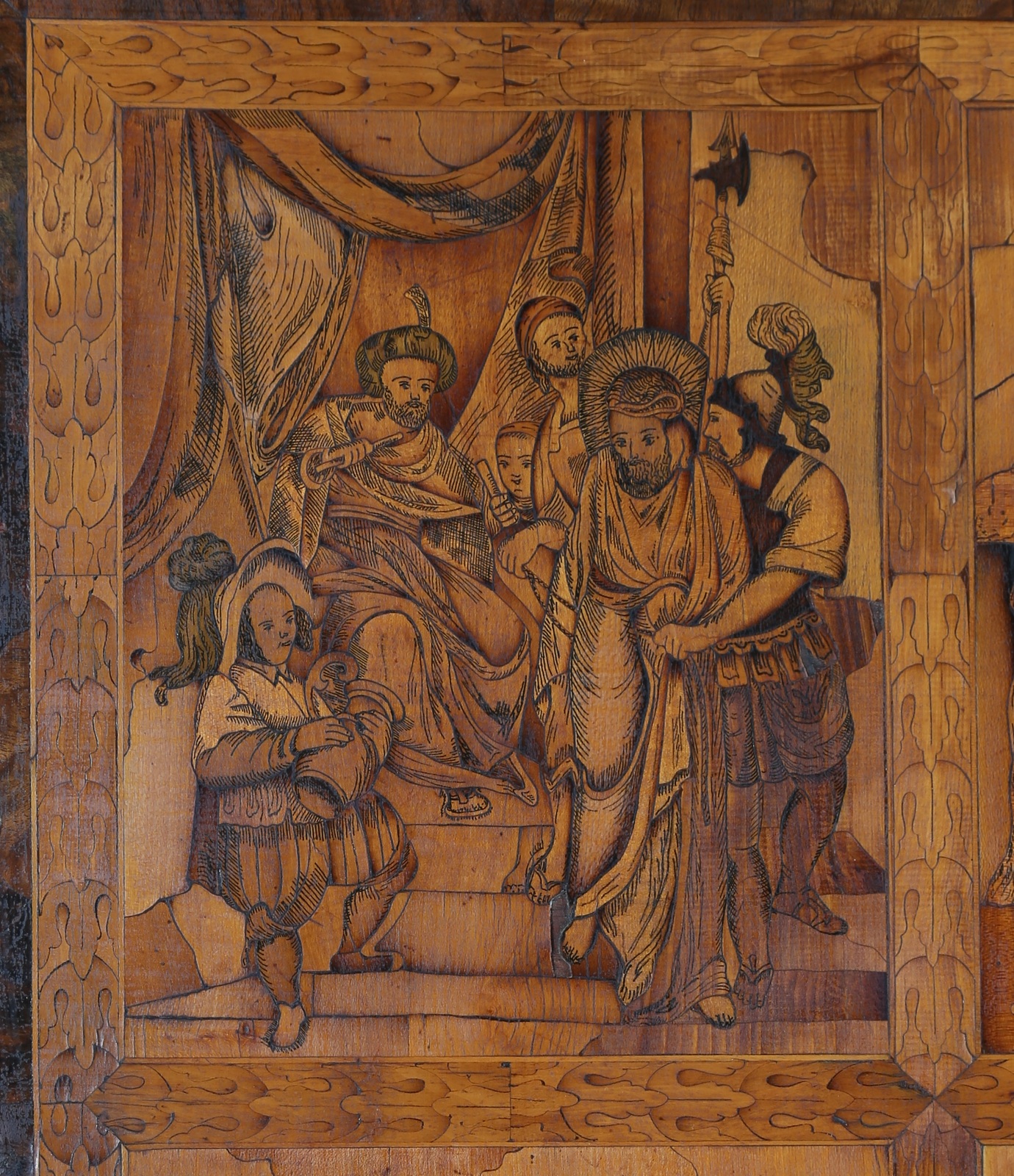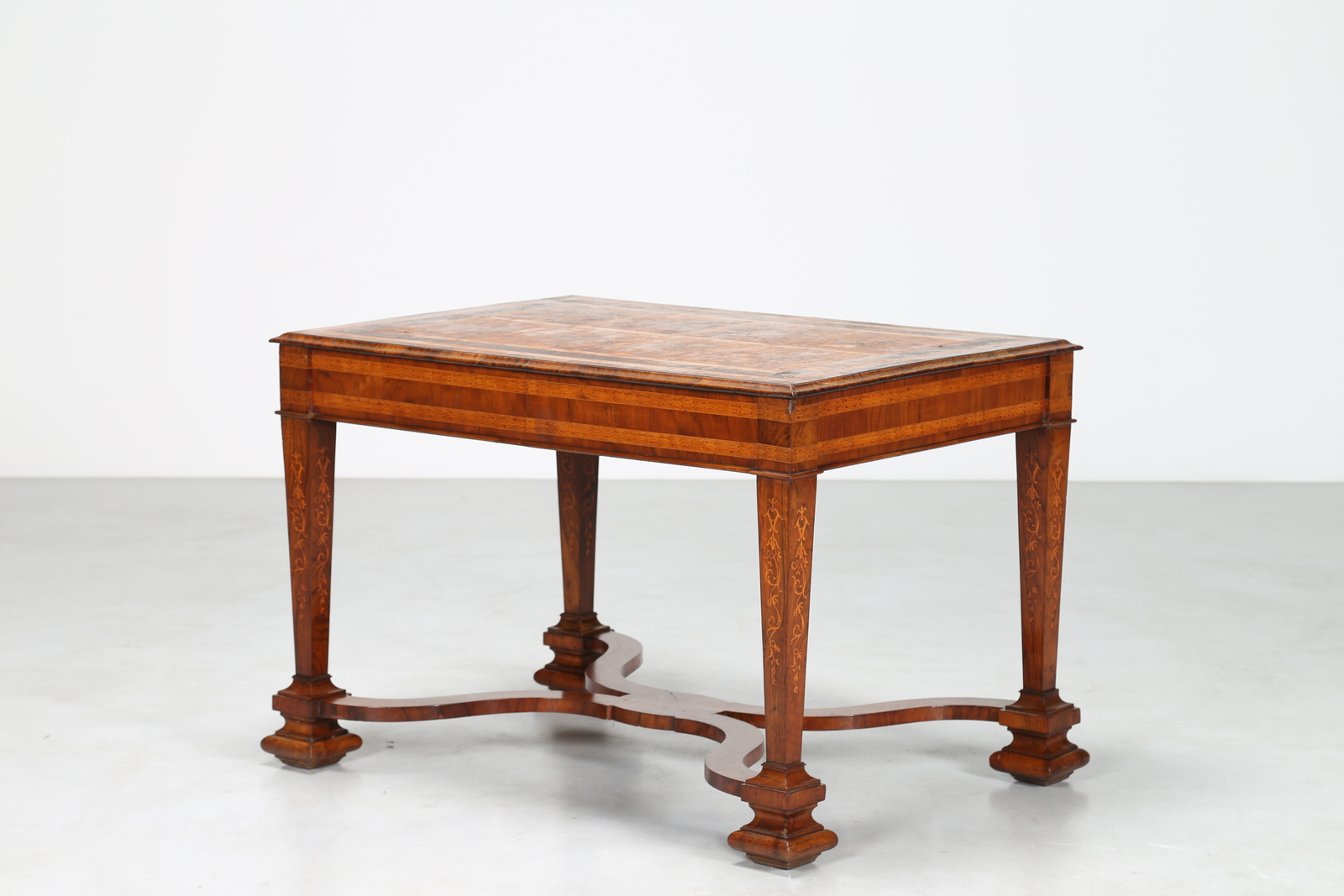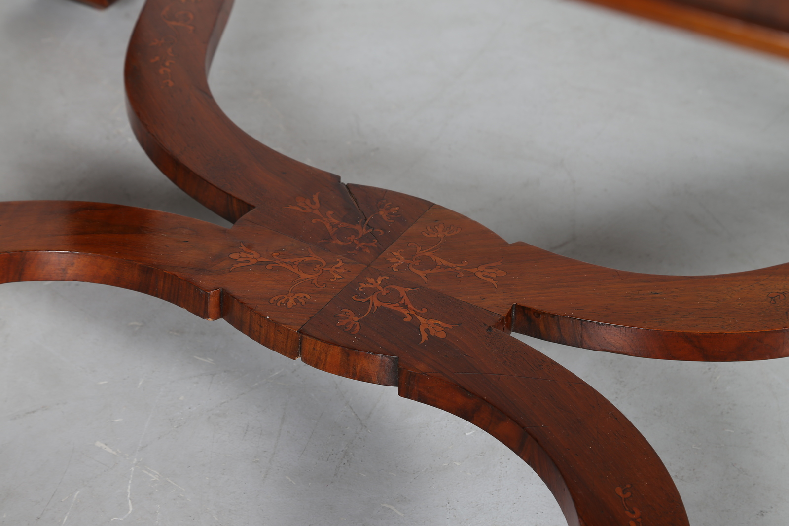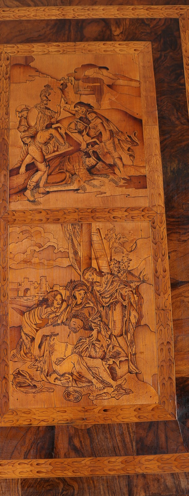 MANIFATTURA OLANDESE DEL XIX SECOLO Tavolo lastronato e intarsiato con scene della Via Crucis, gambe unite da raccordi sagomati. . Cm 111,00 x 74,00 x 77,00.