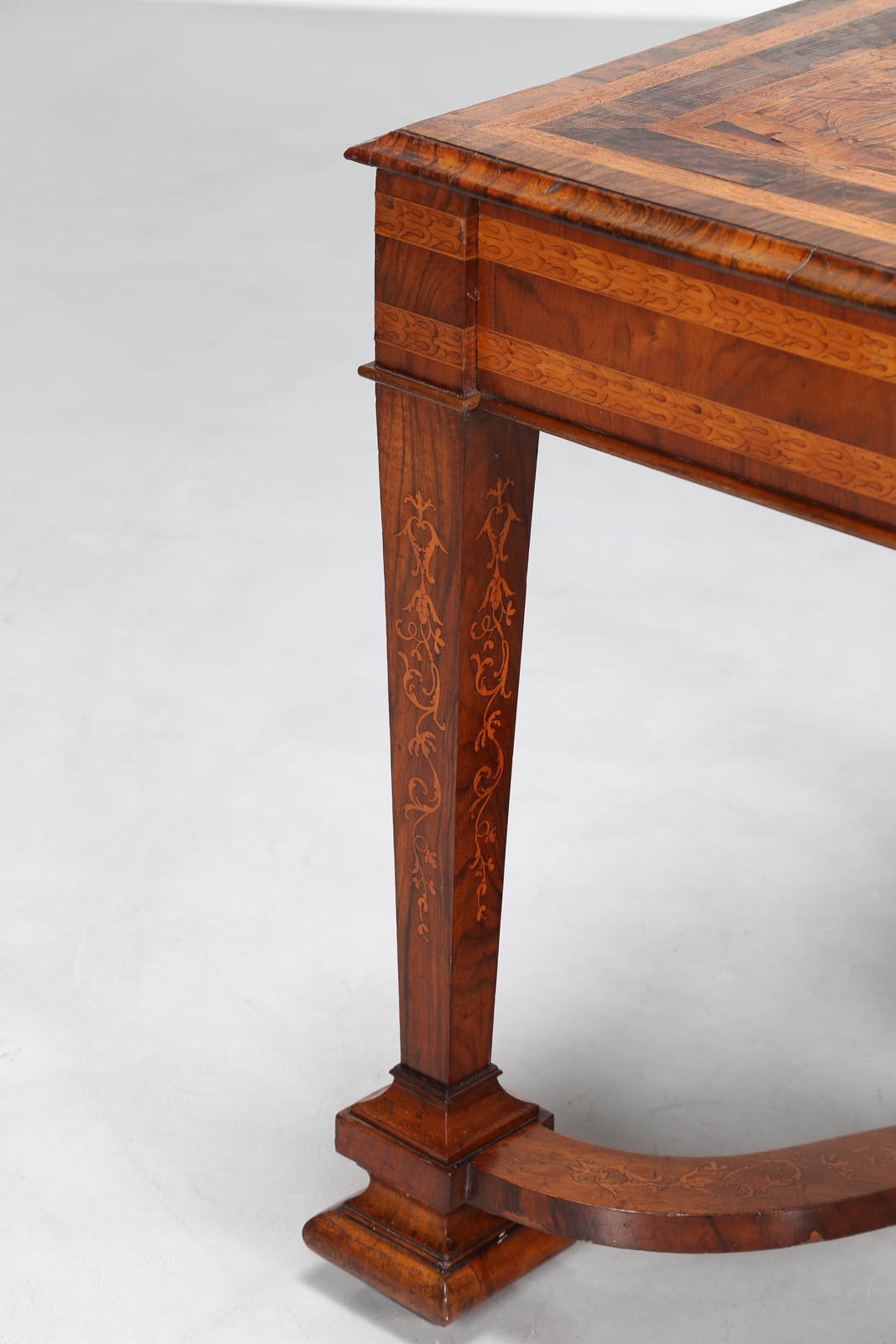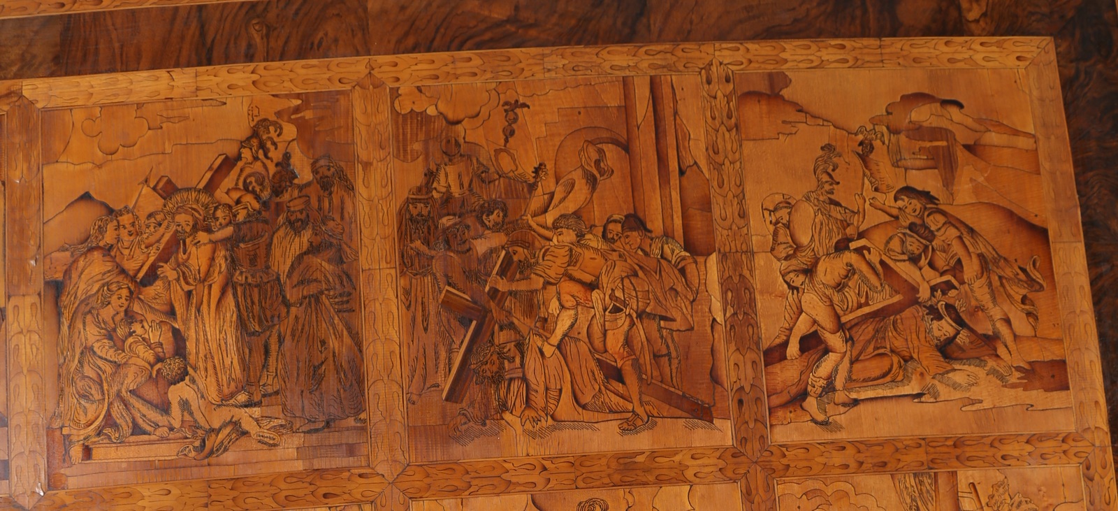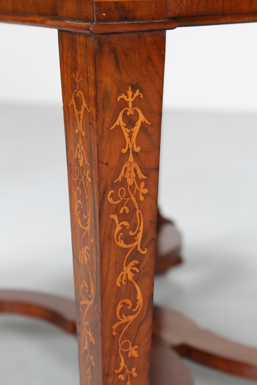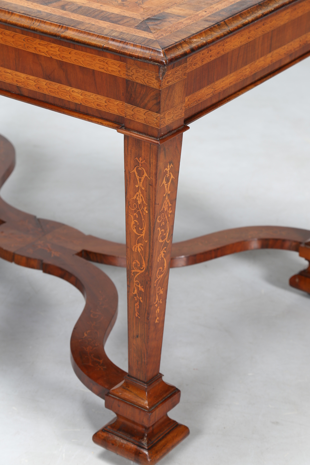 MANIFATTURA OLANDESE DEL XIX SECOLO Tavolo lastronato e intarsiato con scene della Via Crucis, gambe unite da raccordi sagomati. . Cm 111,00 x 74,00 x 77,00.
