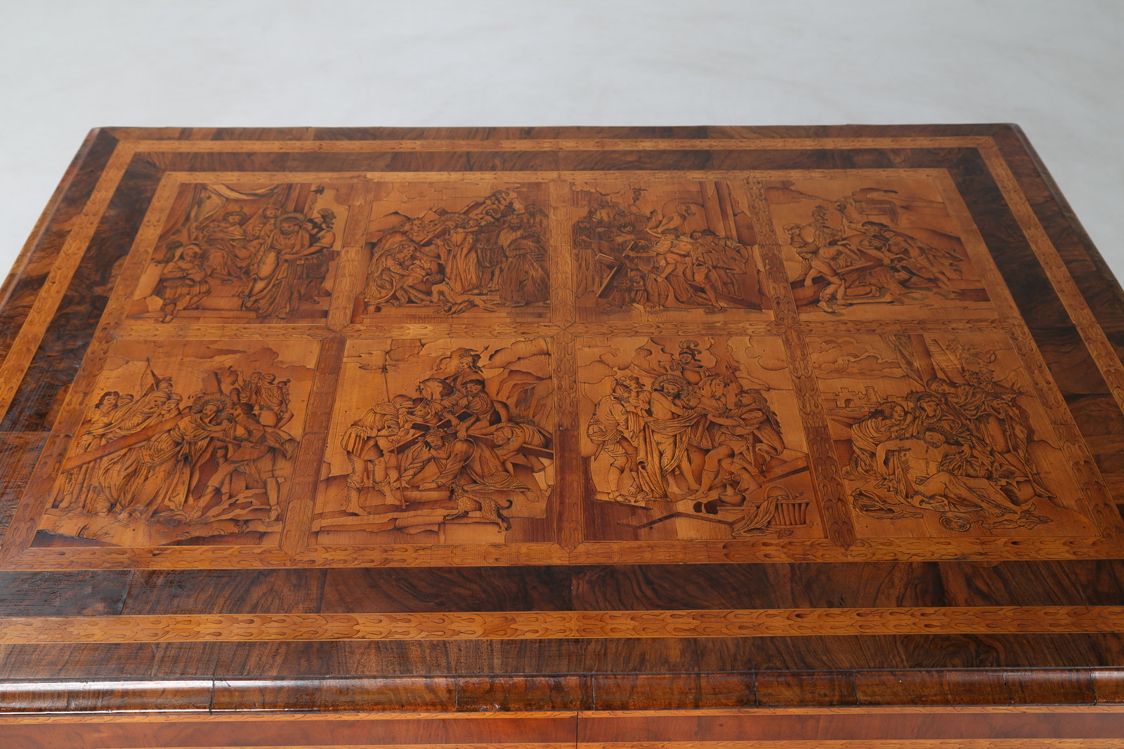 MANIFATTURA OLANDESE DEL XIX SECOLO Tavolo lastronato e intarsiato con scene...