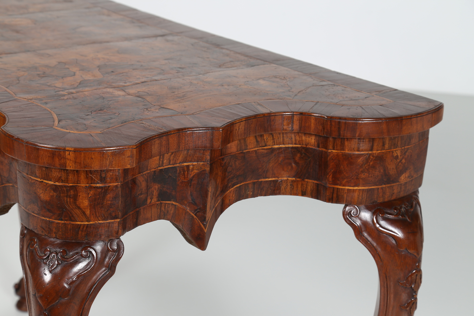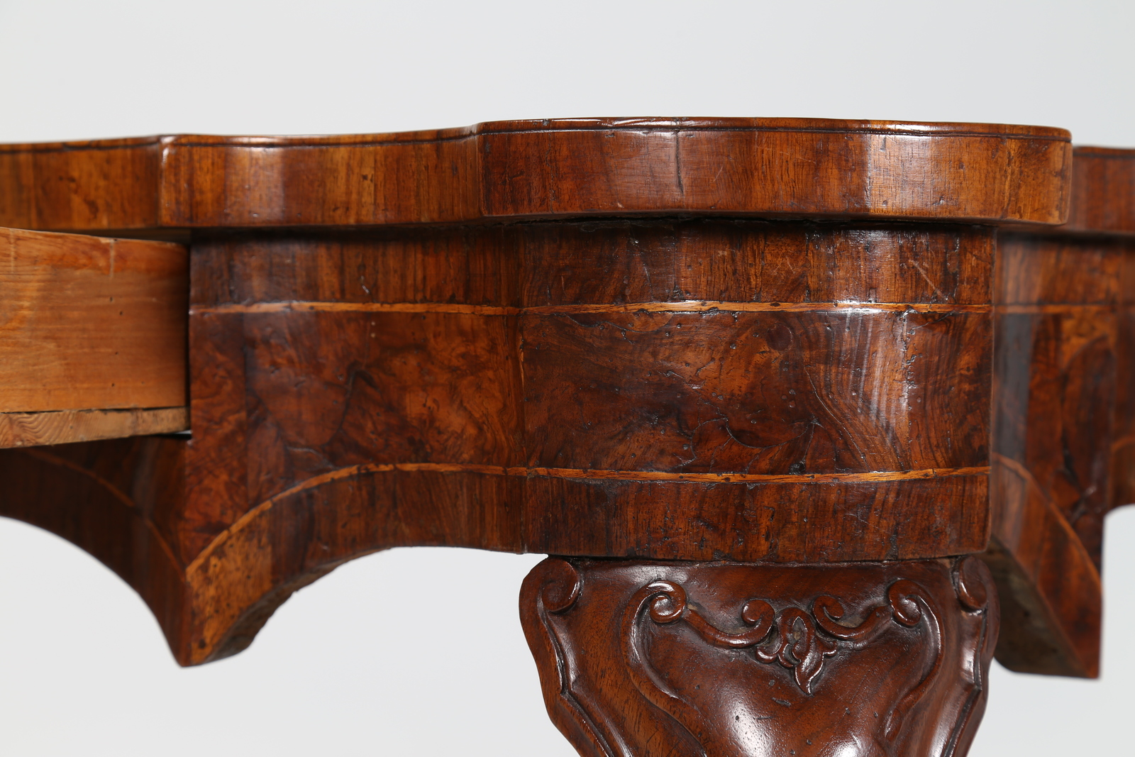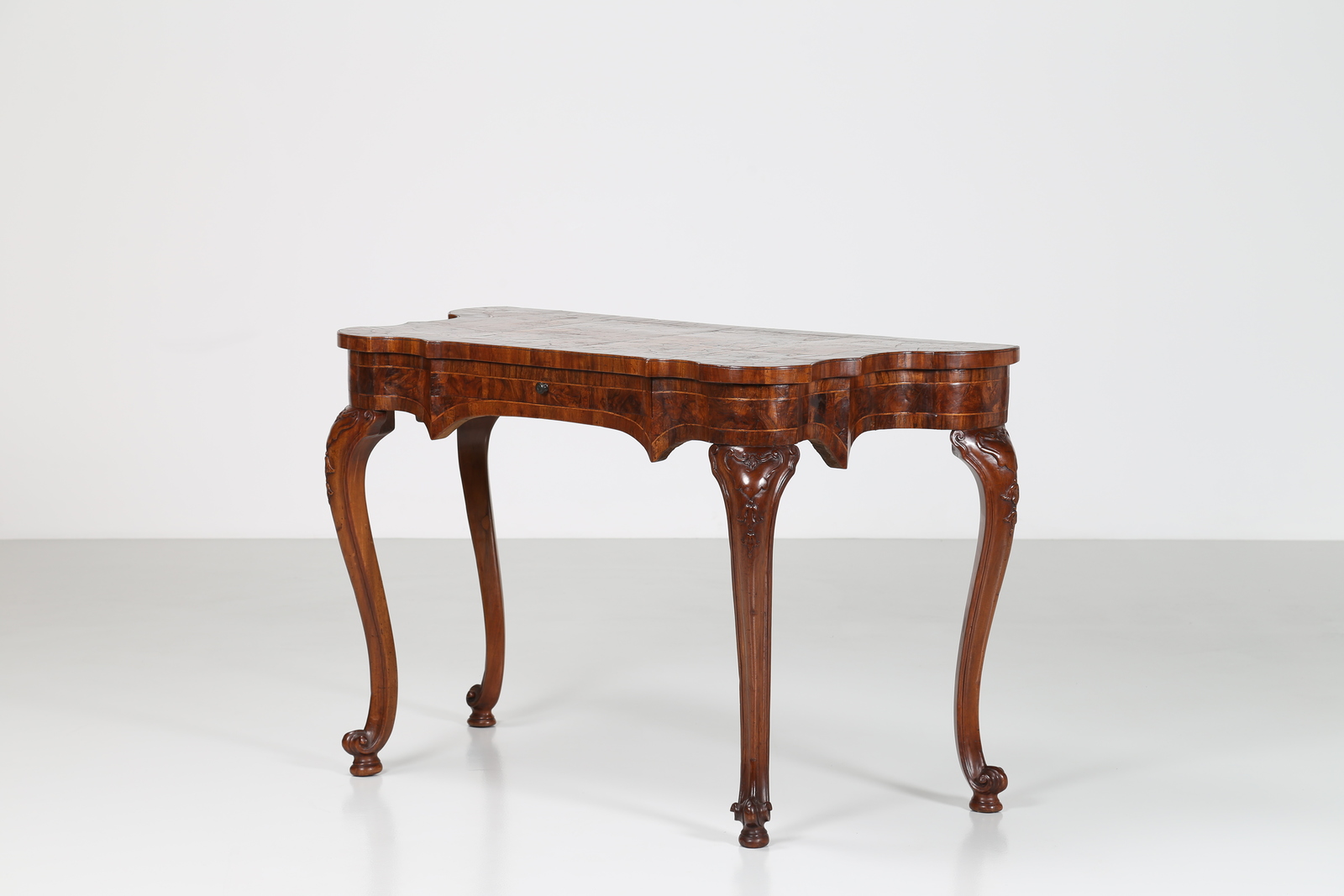 MANIFATTURA VENEZIANA DEL XVIII SECOLO Consolle in noce e radica di noce, piano sagomato, gambe mosse, piedi a ricciolo. . Cm 130,00 x 85,00 x 64,00.