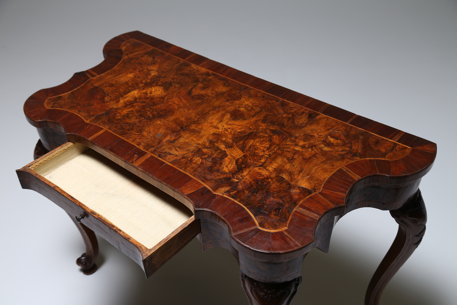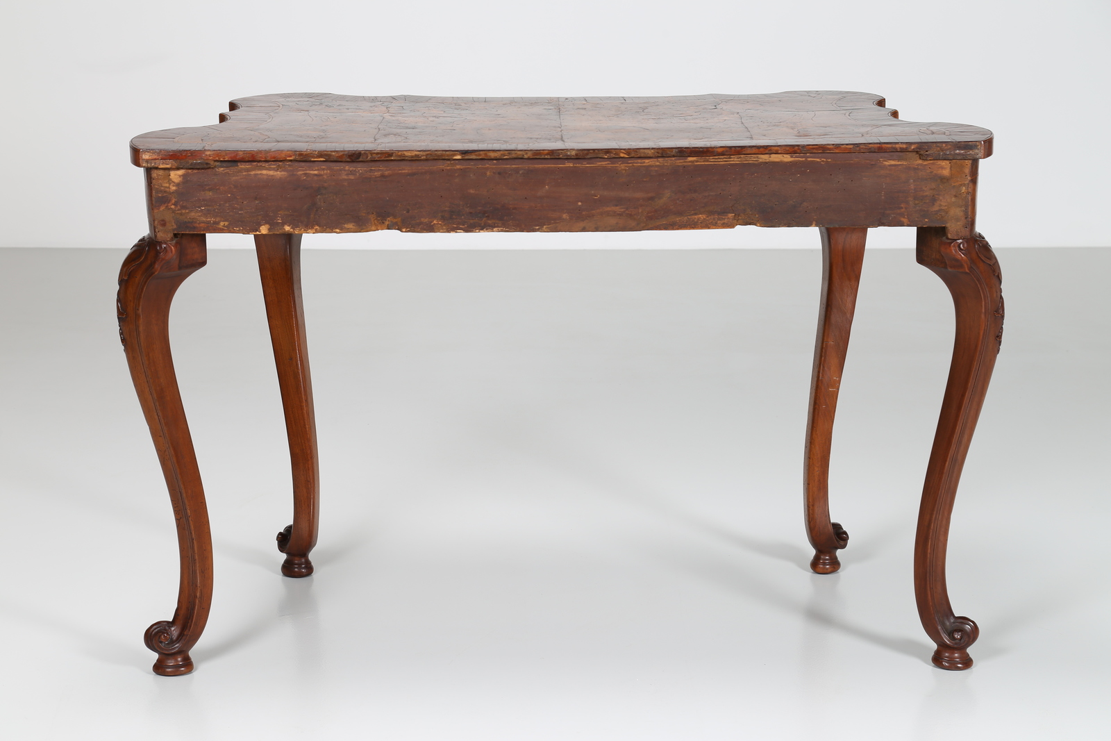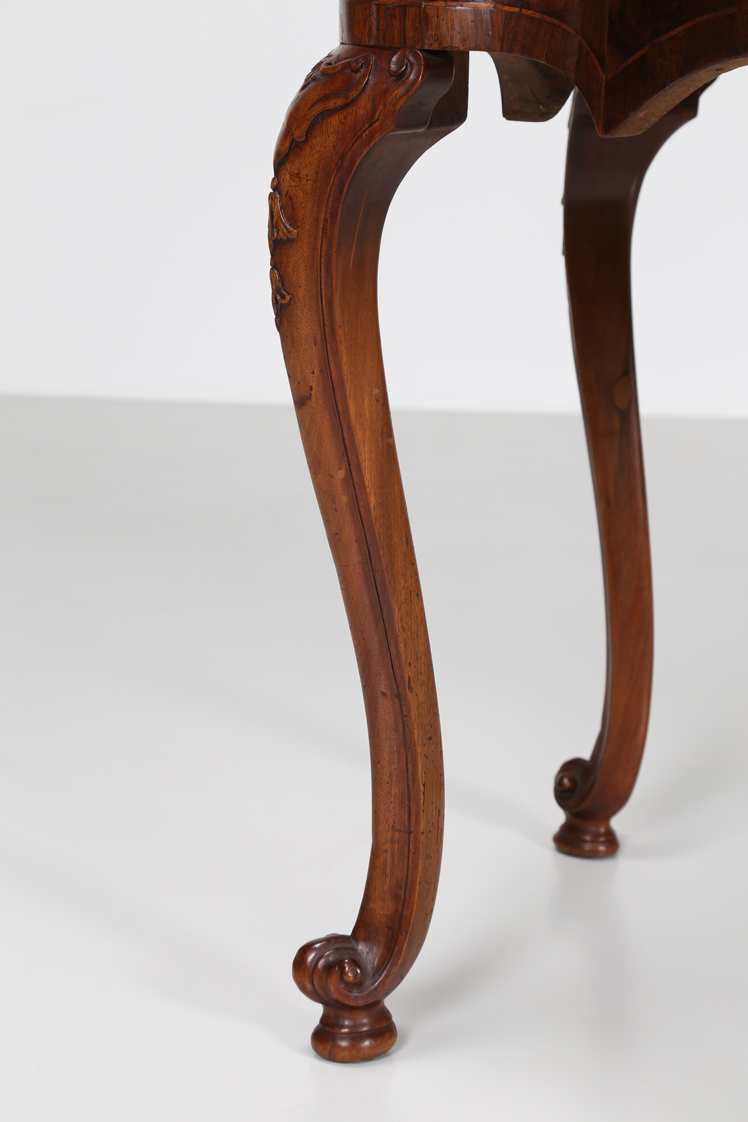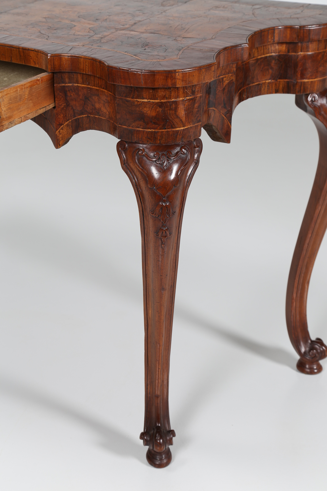 MANIFATTURA VENEZIANA DEL XVIII SECOLO Consolle in noce e radica di noce, piano sagomato, gambe mosse, piedi a ricciolo. . Cm 130,00 x 85,00 x 64,00.