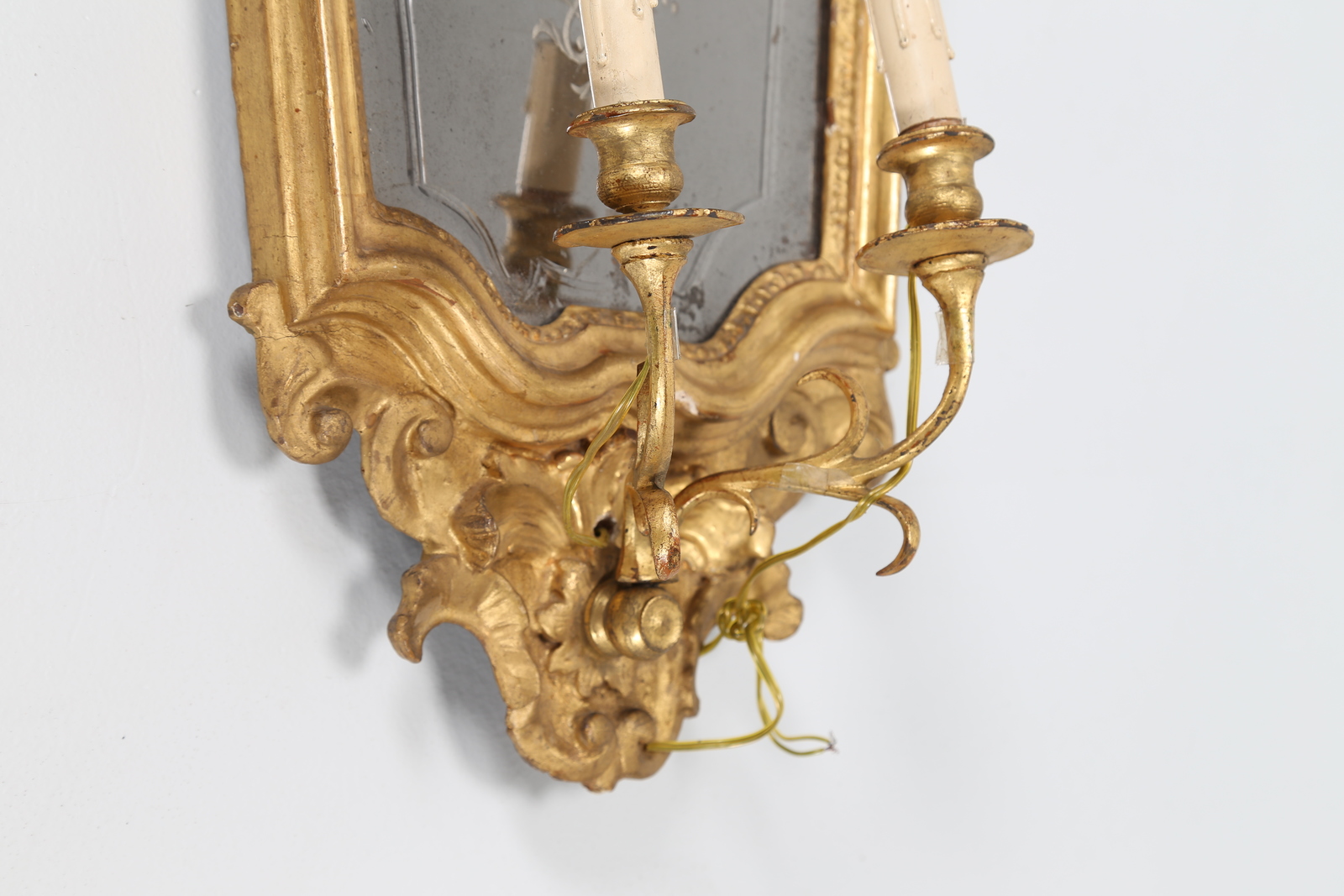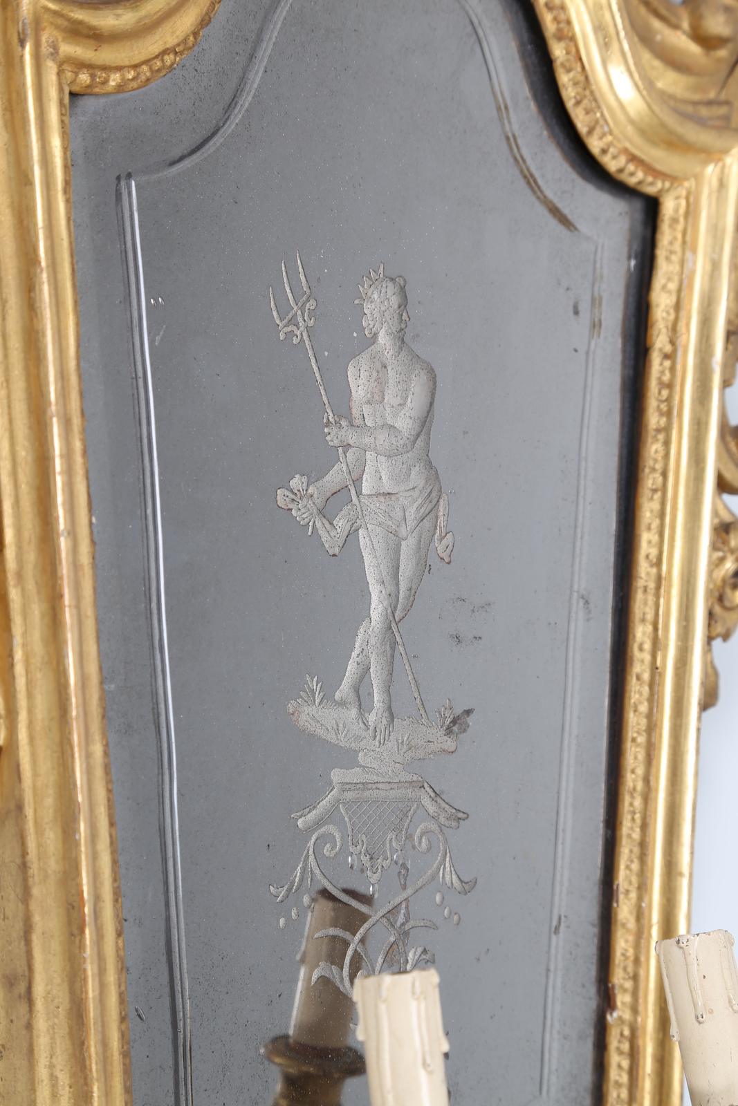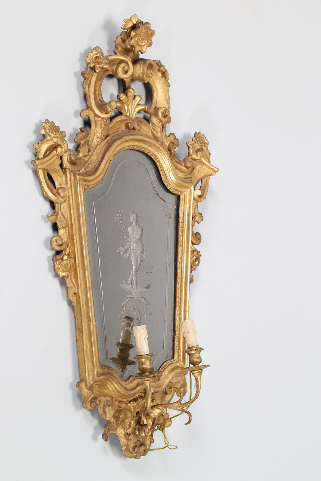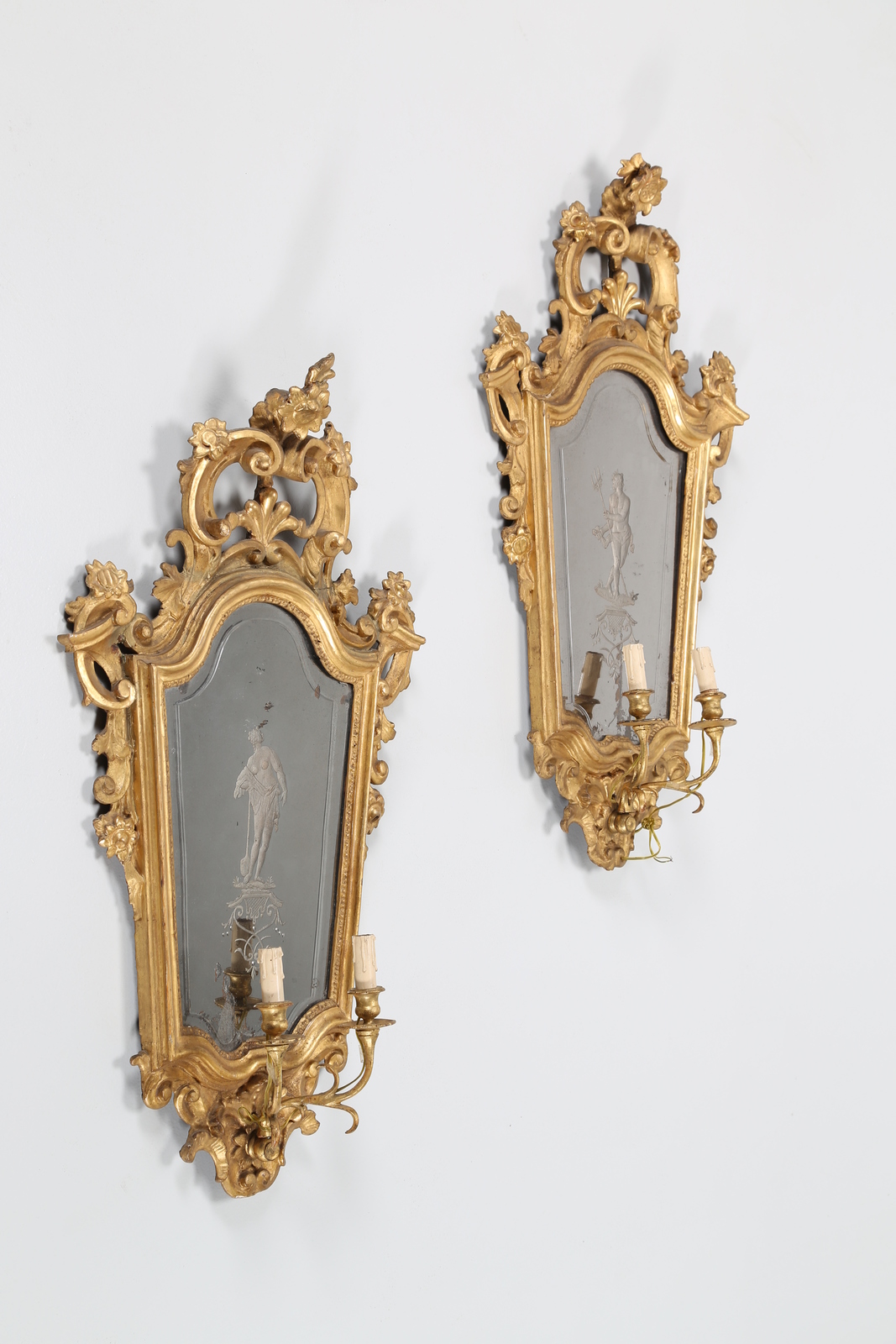 MANIFATTURA VENETA DEL XVIII SECOLO Coppia di lumiere a due fiamme intagliate a motivi rocaille e dorate, specchi decorati con figure classiche. . Cm 45,00 x 80,00.