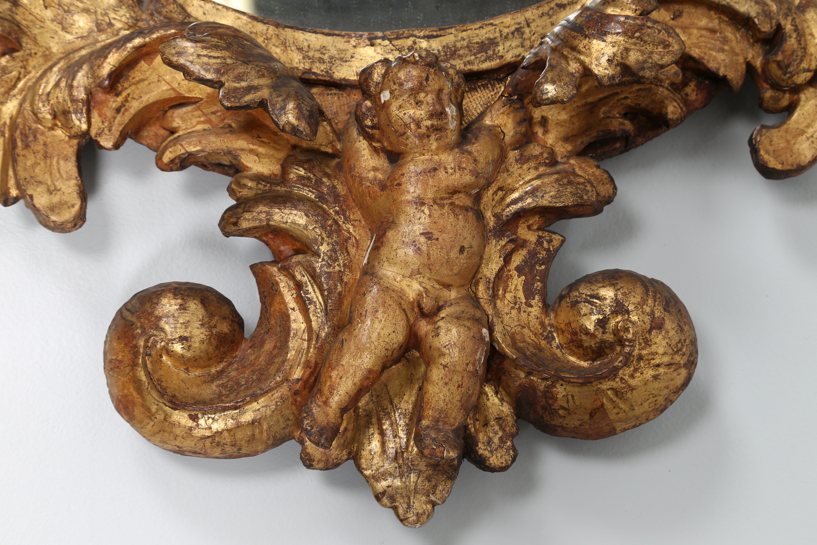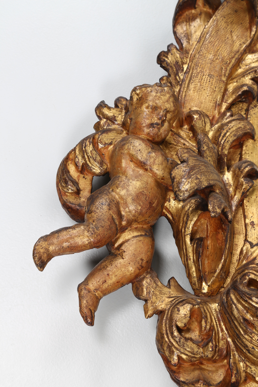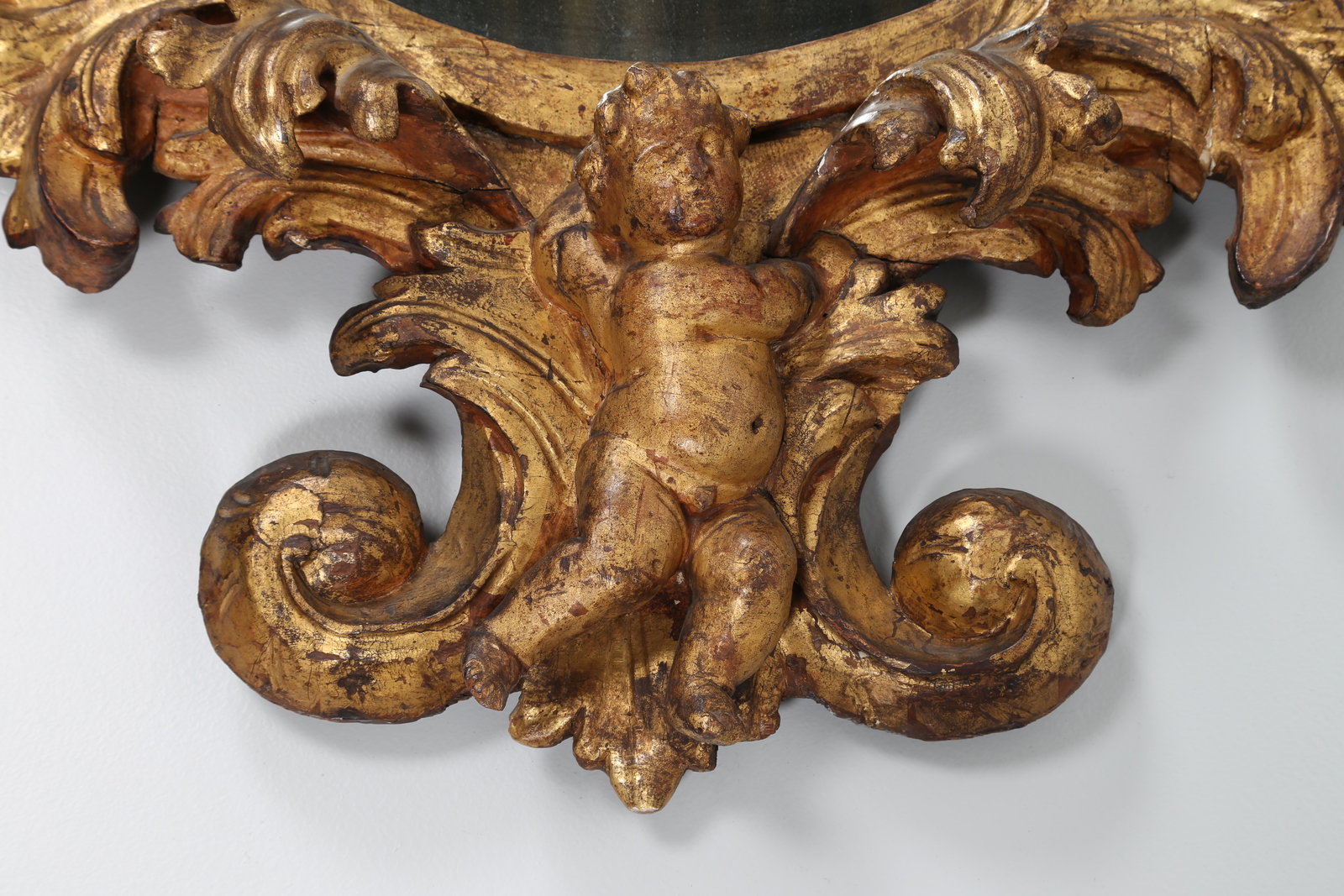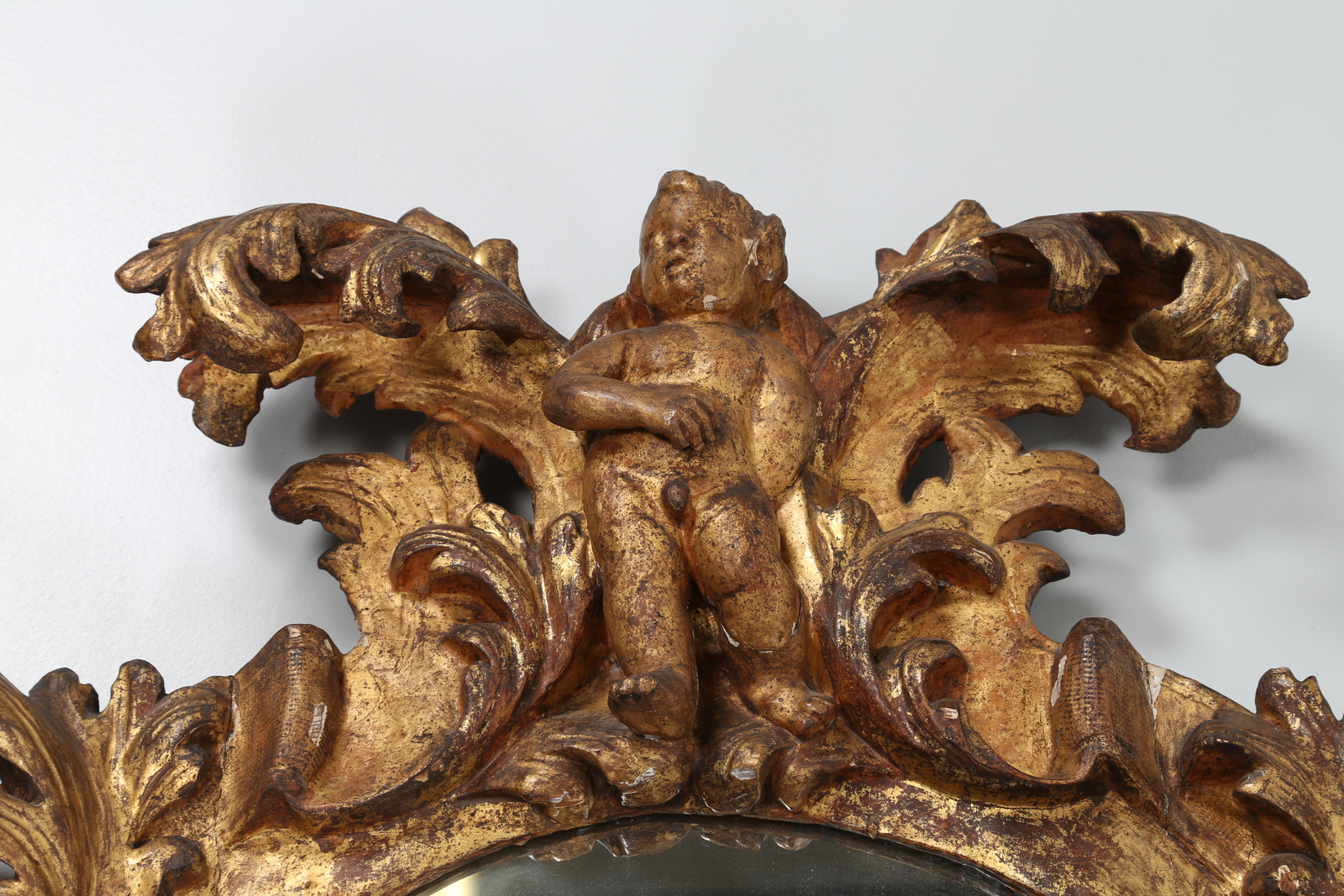 MANIFATTURA LOMBARDA DEL XVII SECOLO Coppia di imponenti specchiere dorate e scolpite a motivi fogliacei, decorati alle estremità con putti alati. . . Cm 120,00 x 137,00. Difetti e restauri.