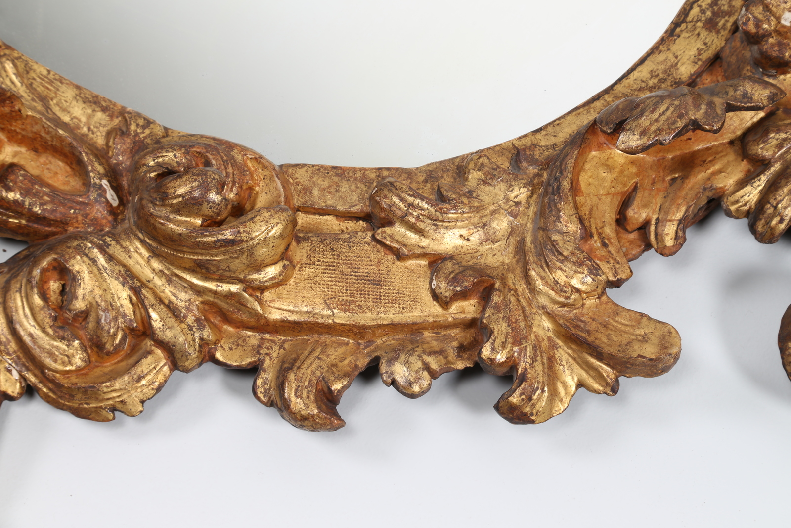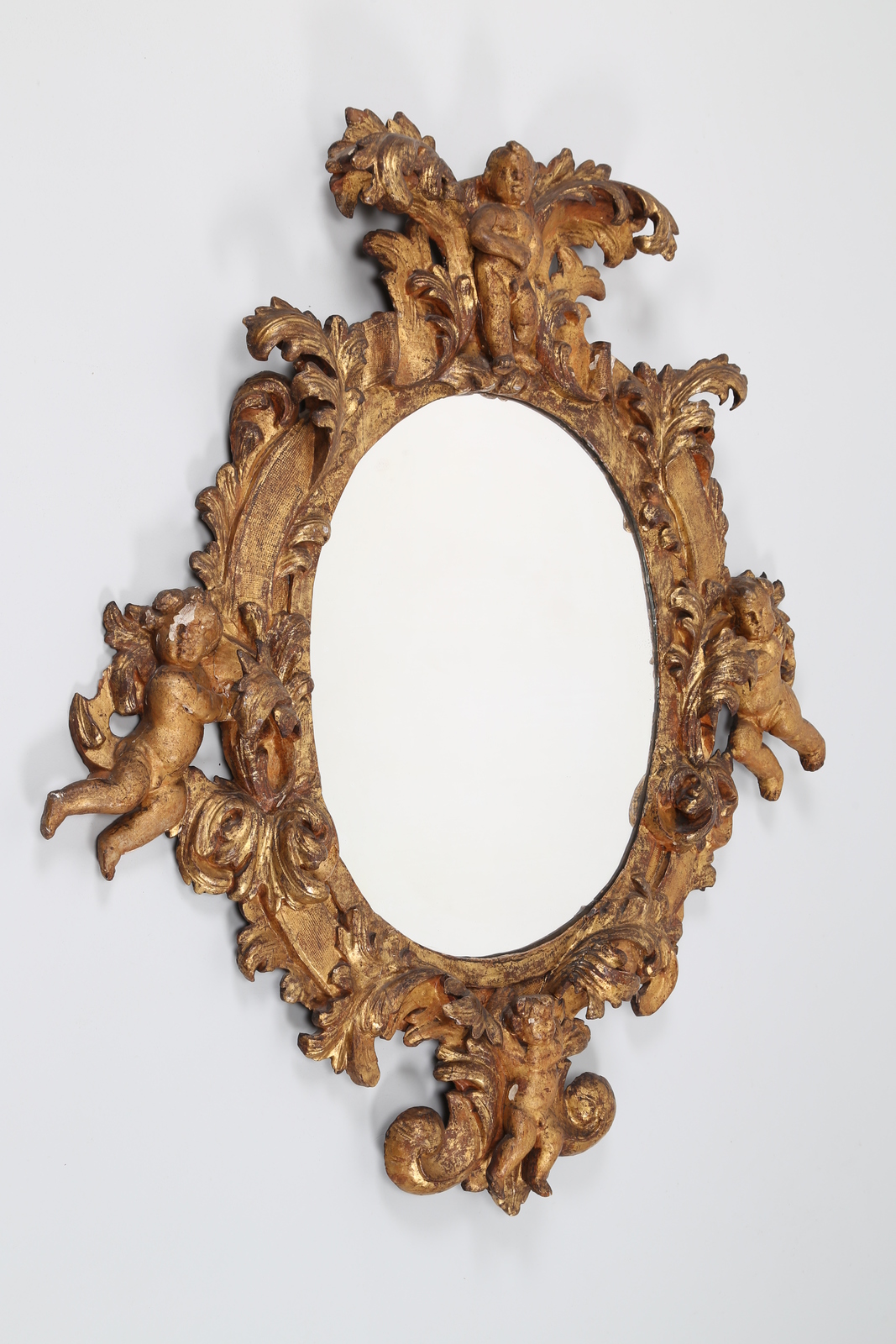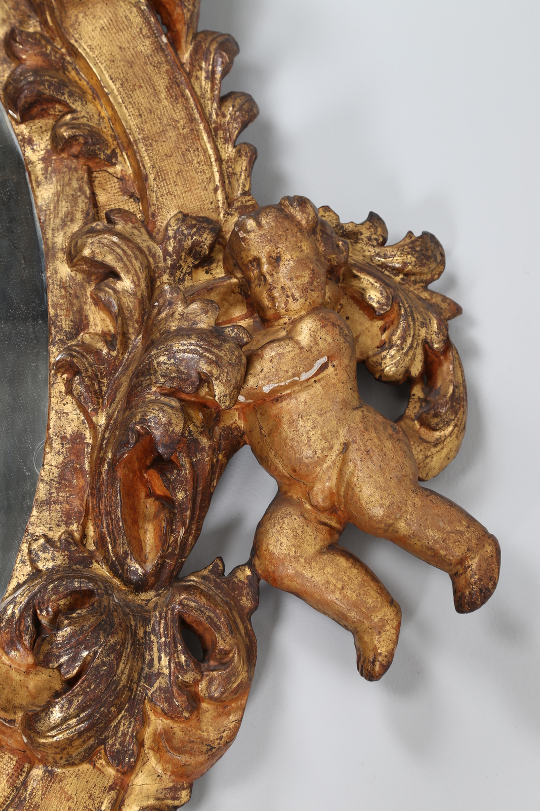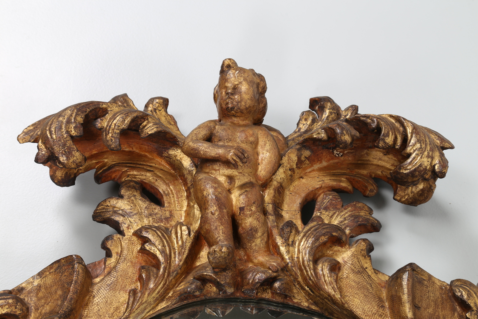 MANIFATTURA LOMBARDA DEL XVII SECOLO Coppia di imponenti specchiere dorate e scolpite a motivi fogliacei, decorati alle estremità con putti alati. . . Cm 120,00 x 137,00. Difetti e restauri.