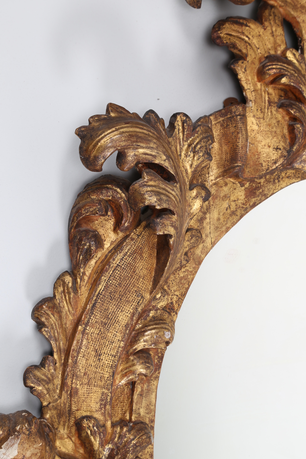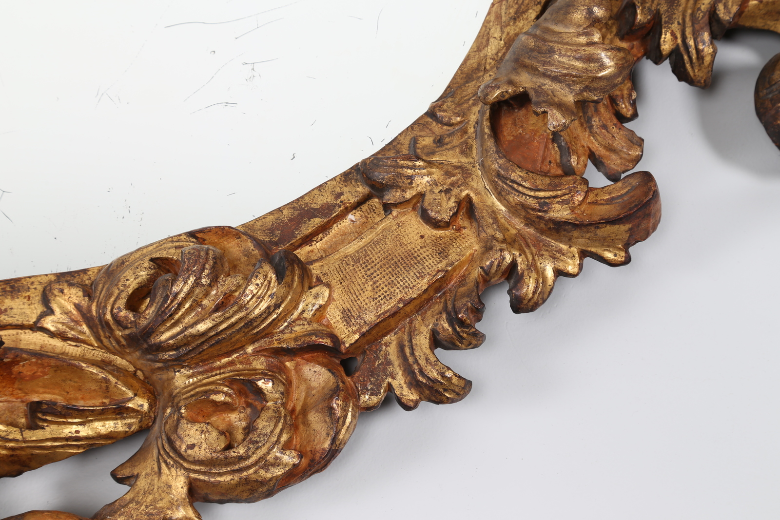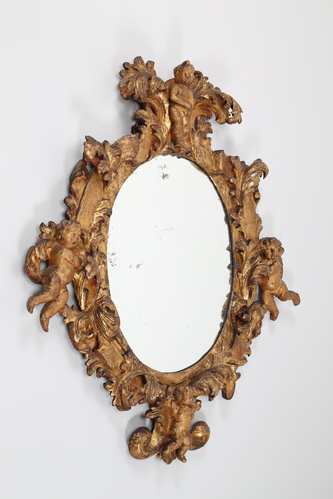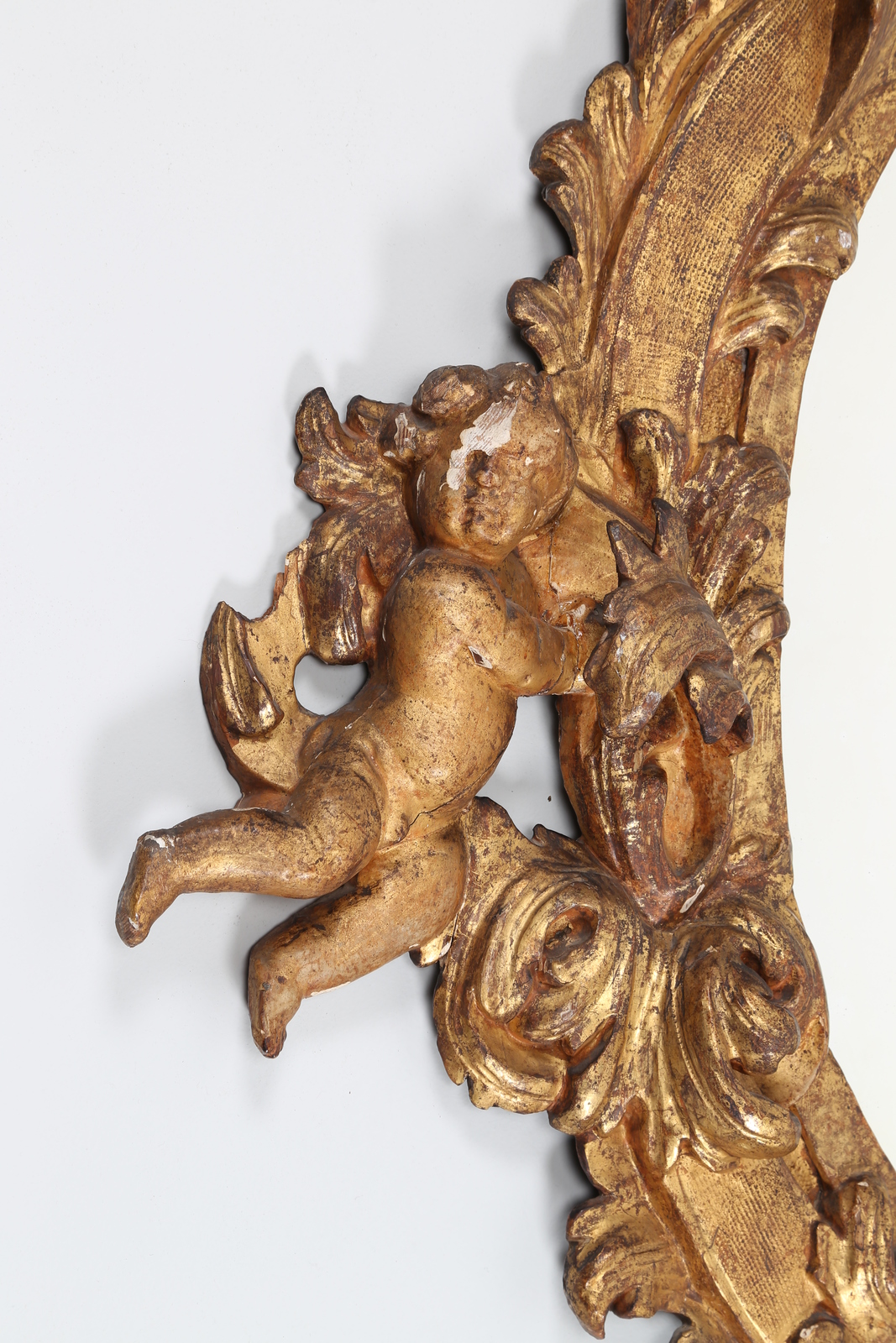 MANIFATTURA LOMBARDA DEL XVII SECOLO Coppia di imponenti specchiere dorate e scolpite a motivi fogliacei, decorati alle estremità con putti alati. . . Cm 120,00 x 137,00. Difetti e restauri.