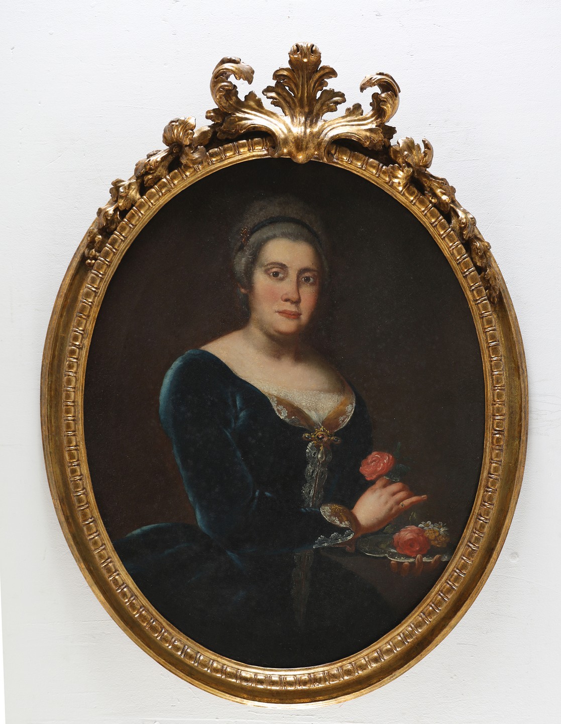 ARTISTA LOMBARDO DEL XVIII SECOLO Coppia di dipinti raffiguranti un nobiluomo con una lettera e una nobildonna con fiori. Olio su tela . Cm 75,00 x 94,00. Nel dipinto del nobiluomo sono presenti delle iscrizioni in alto a destra e sulla lettera. In cornici dorate coeve. Cornice presente