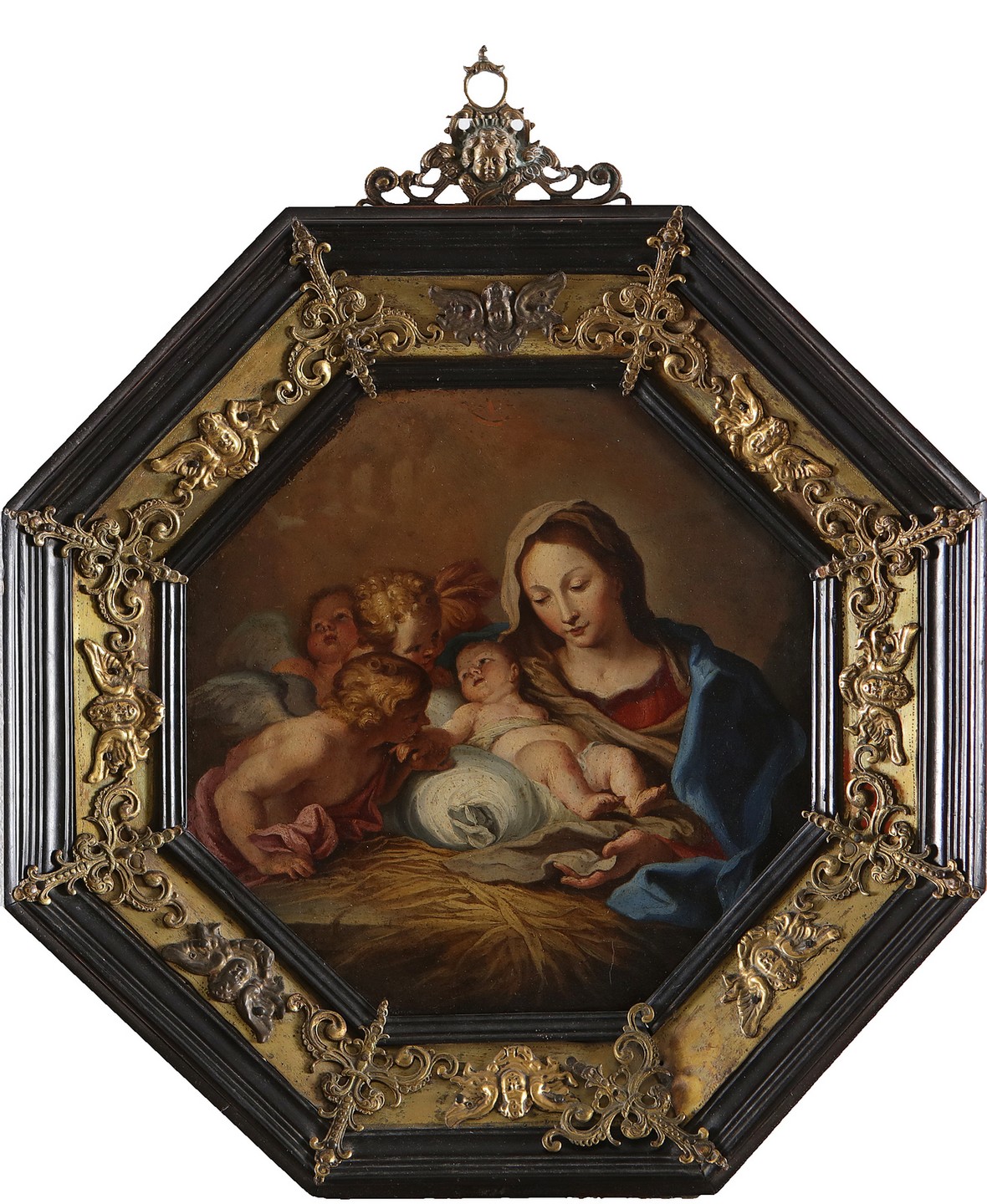 ARTISTA EMILIANO DEL XVII SECOLO Madonna con bambino e angeli. Olio su rame. Cm 24,00 x 23,00. Entro cornice in legno modanato e ebanizzato con fascia in rame dorato e applicazioni in bronzo dorato a foggia di cherubini. . Cornice presente