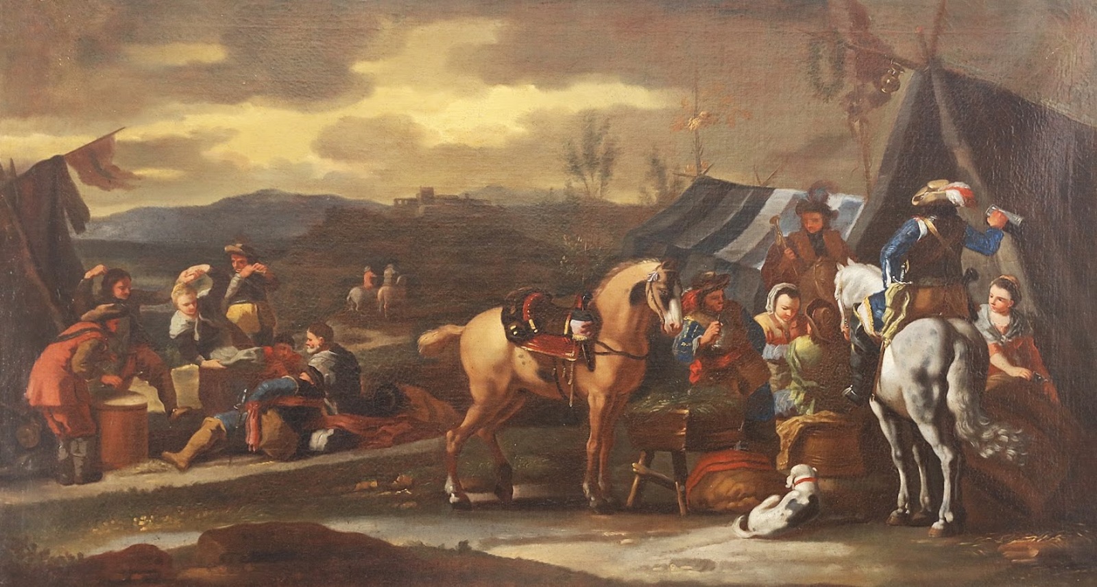 ARTISTA ROMANO DEL XVII SECOLO Sosta di cavalleria. Olio su tela . Cm 103,00 x 55,00.