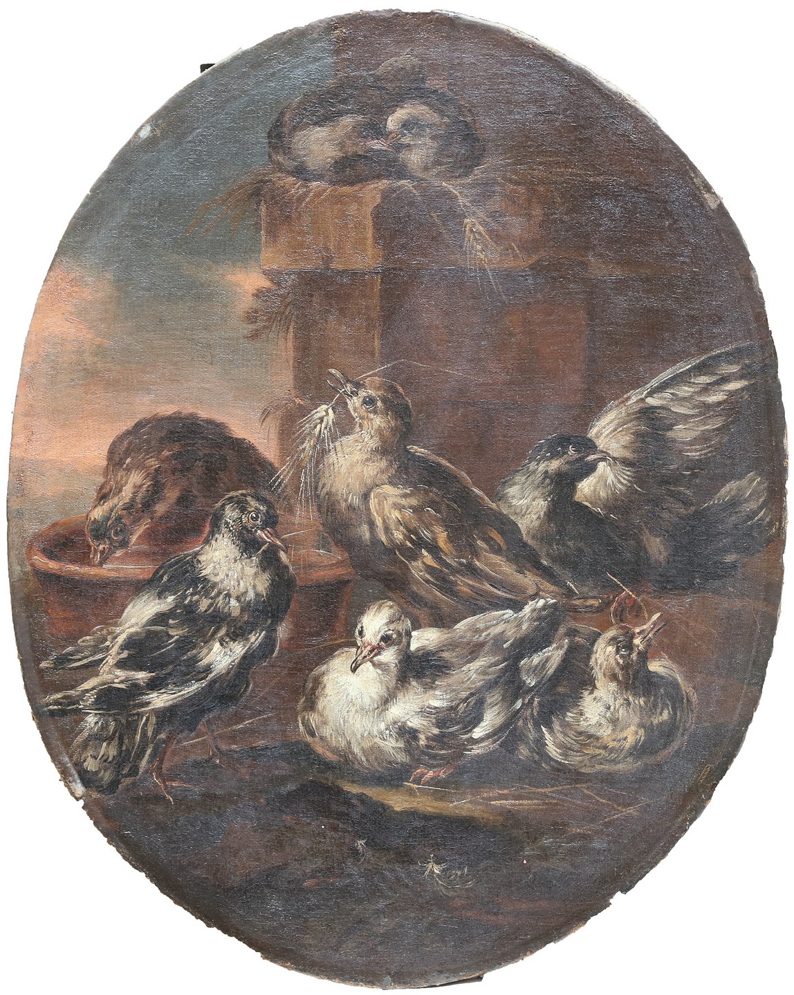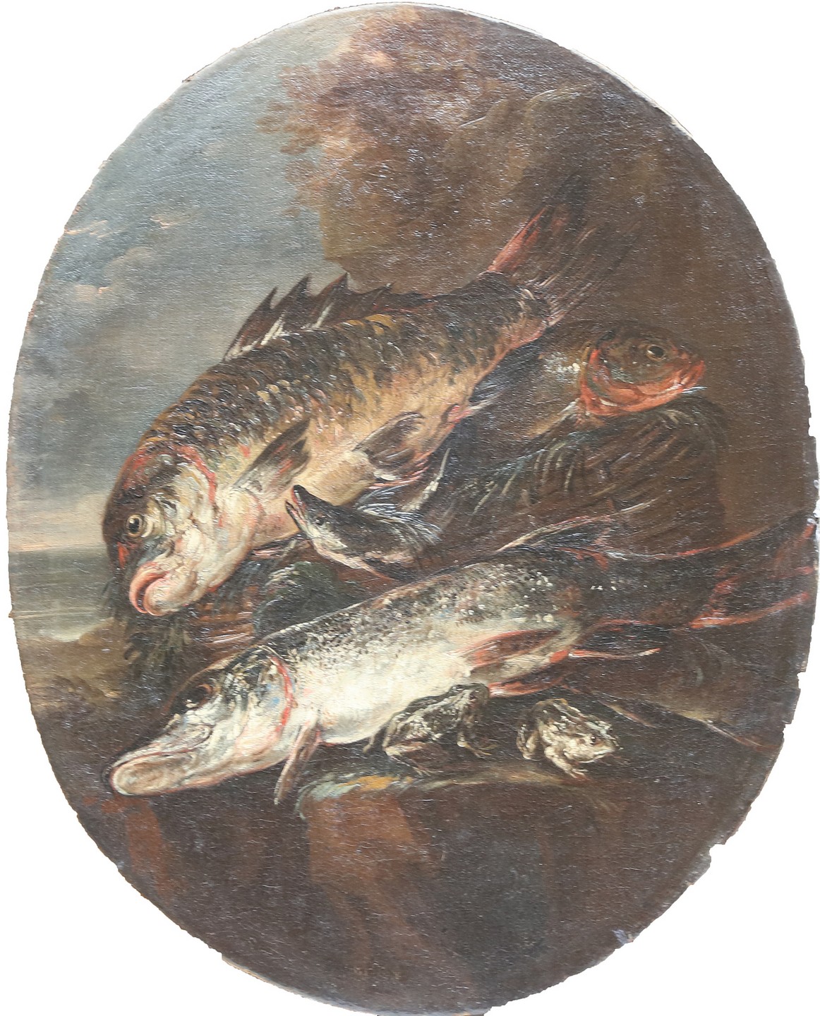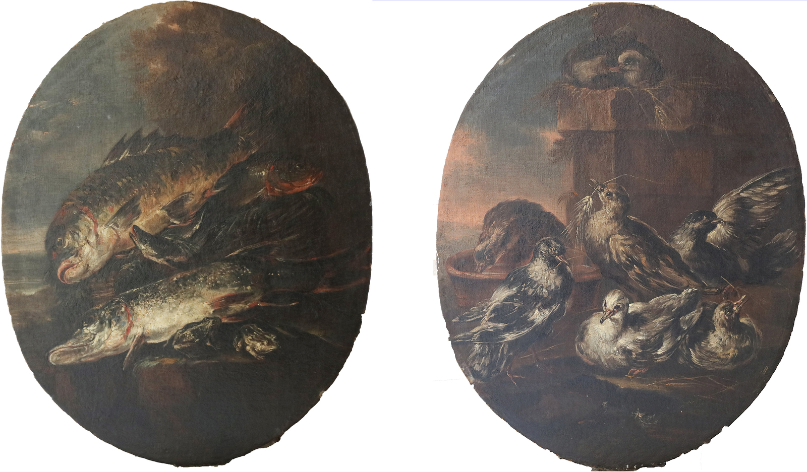 CRIVELLI GIOVANNI DETTO IL CRIVELLINO (1690 - 1750) Natura morta con pesci, piccioni in un nido. Olio su tela ovale. Cm 57,00 x 71,00. I dipinti sono accompagnati da scheda critica di Ferdinando Arisi datata al 1976. Cornice presente