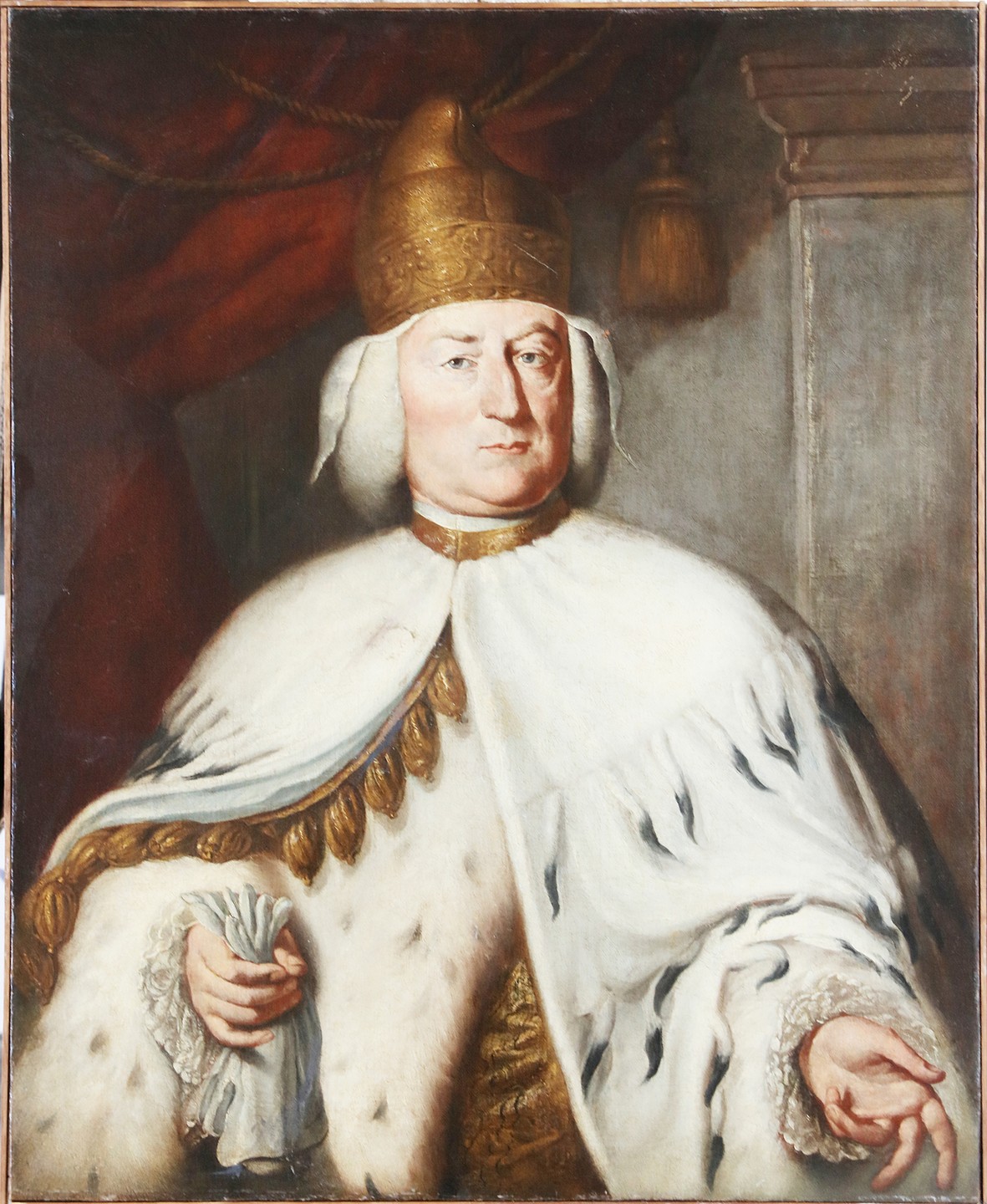 LONGHI ALESSANDRO (1733 - 1813) Attribuito a. Ritratto del Doge Alvise Mocenigo IV. . Olio su tela . Cm 77,00 x 95,50. L'identificazione si basa sul raffronto con un altro ritratto conservato alla Gallerie dell'Accademia di Venezia, attribuito ad Alessandro Longhi in base ad una nota archivistica dell'Accademia di pittura veneziana che segnala come, nel 1767, fosse stato prestato al Longhi un ritratto del precedente Doge, Marco Foscarini, opera di Fortunato Pasquetti, per impiegarlo come modello di quello che avrebbe realizzato del Doge Mocenigo: le due opere avrebbero dovuto costituire pendant nelle sale accademiche. . Cornice presente
