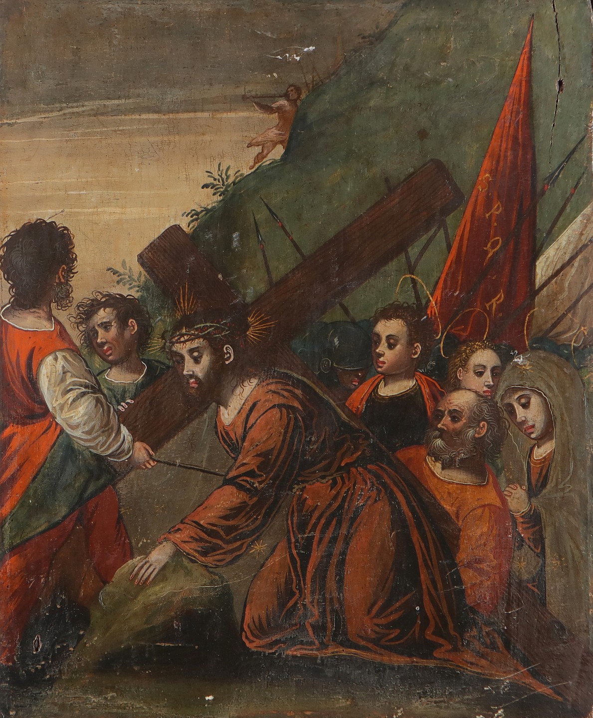 ARTISTA VENETO - CRETESE DEL XVII SECOLO Scena della Via Crucis. Olio su...