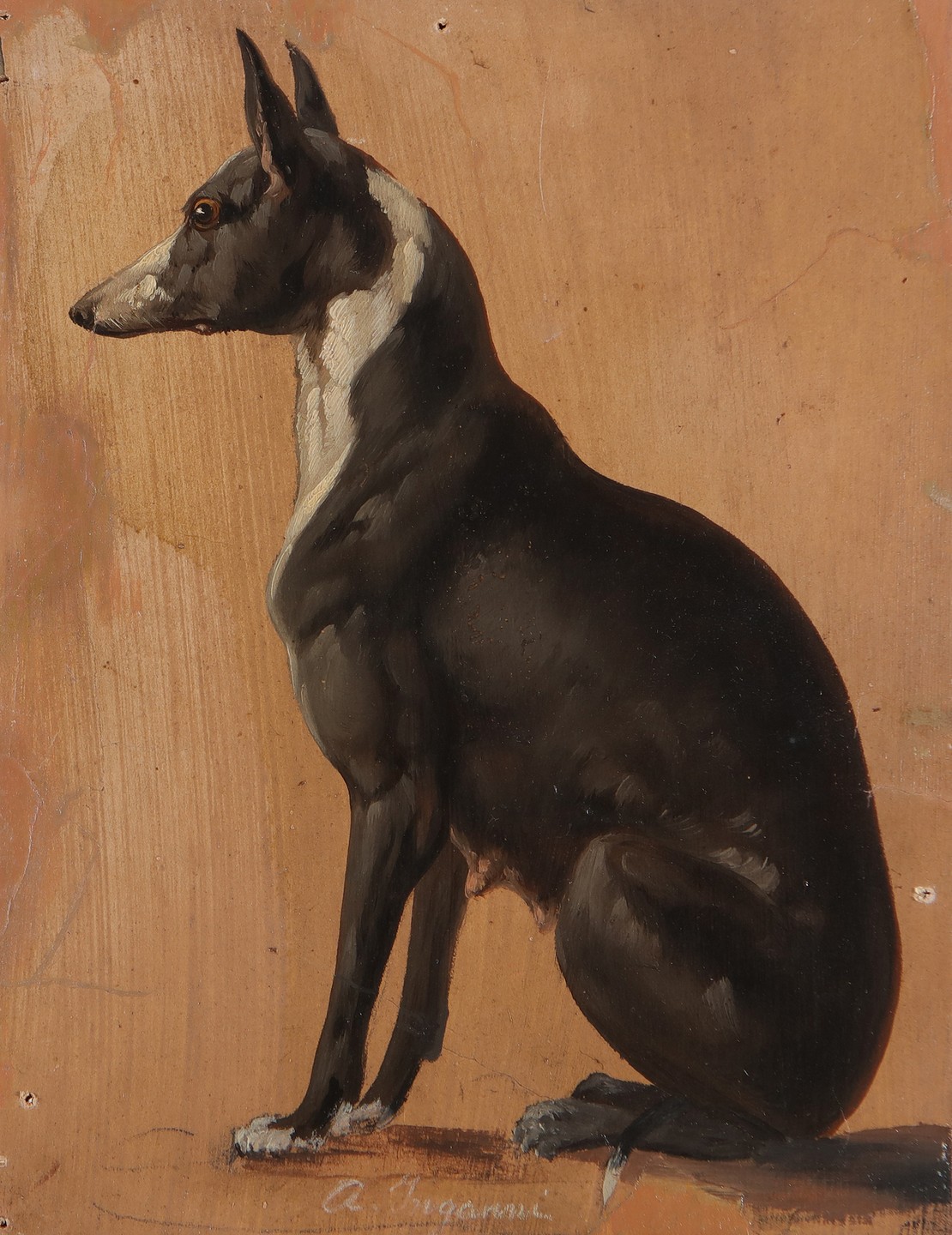 GUERILLOT INGANNI AMANZIA (1828 - 1905) Levriero. Olio su cartoncino. Cm...