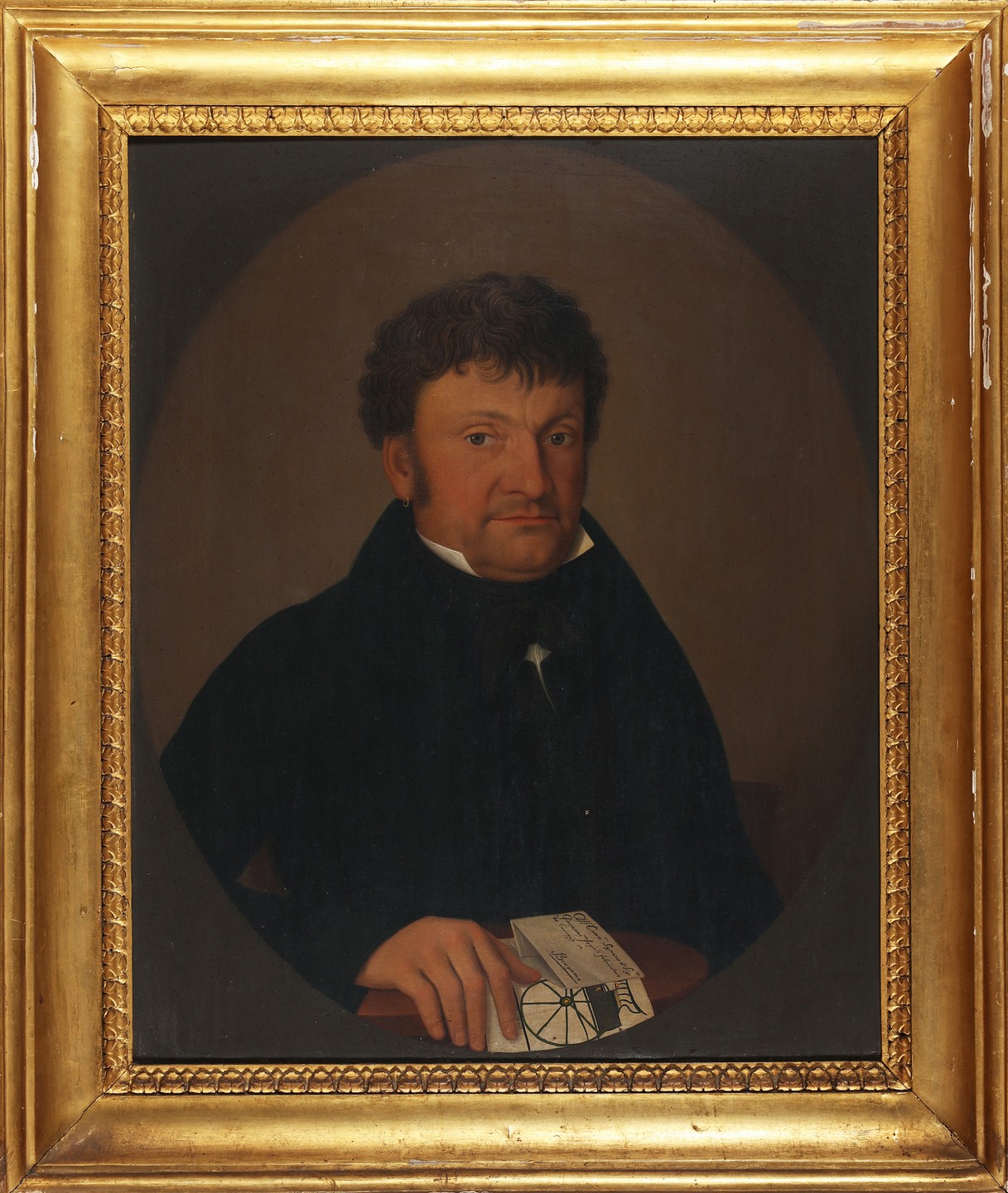 ARTISTA DEL XIX SECOLO Giovanni Fagioli di Bergamo. Olio su tela . Cm 45,00 x 55,00. Nome dell'effigiato sul cartiglio, insieme alla località, Bergamo, e al disegno di una carrozza.
