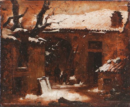 INGANNI ANGELO (1807 - 1880) Paesaggio invernale. Olio su tela . Cm 28,00 x 23,00. Firma in basso a destra. Al retro cartiglio espositivo a cura del Comune di Gussago Mostra dei dipinti di Angelo Inganni, Gussago 25 aprile - 2 giugno 1975. Pubblicazioni: Angelo Inganni, Chiesa di S. Lorenzo, Gussago, dal 25 Aprile al 2 Giugno 1975, pag.159 -160. Collezione privata, Castenedolo (Bs). Cornice presente