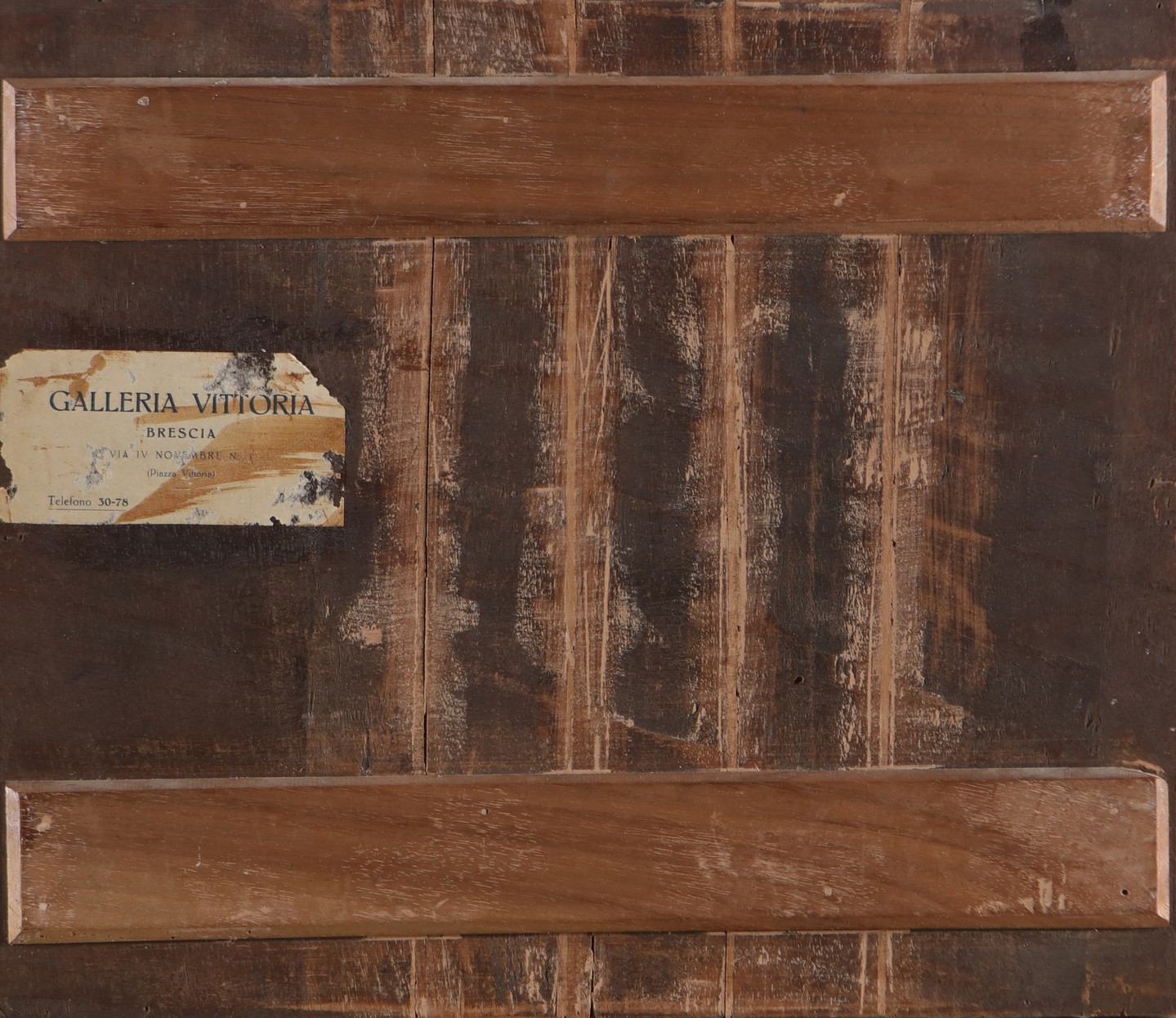 PELLICCIOTTI TITO (1871 - 1950) Suonatori ambulanti. . Olio su tavola. Cm 35,00 x 30,00. Al retro cartiglio provenienza Galleria Vittoria, Brescia. La tavola presenta una rottura. Cornice presente