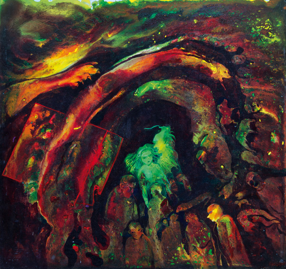 ROBERT CARROLL Painesville (U.S.A.) 09/08/1934 Il libro rosso di Jung, 2010 acrilici su tavola cm. 59x62,7; firma in basso a destra, firma, titolo, anno e archivio dell'artista al retro, dichiarazione d'autenticità dell'artista su certificato allegato, pubblicato (particolare) sull'invito della mostra "Robert Carroll, le avventure di Charles Darwin nel bosco sacro", tenutasi dal 28 febbraio al 12 marzo 2010 presso il Comune di Nemi, Palazzo Ruspoli, Sala dello Stallone.