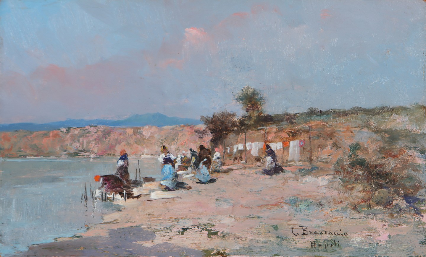 Lotto 389 | BRANCACCIO CARLO (1861 - 1920) Lavandaie al fiume. Olio su tavola. Cm 25,00 x...