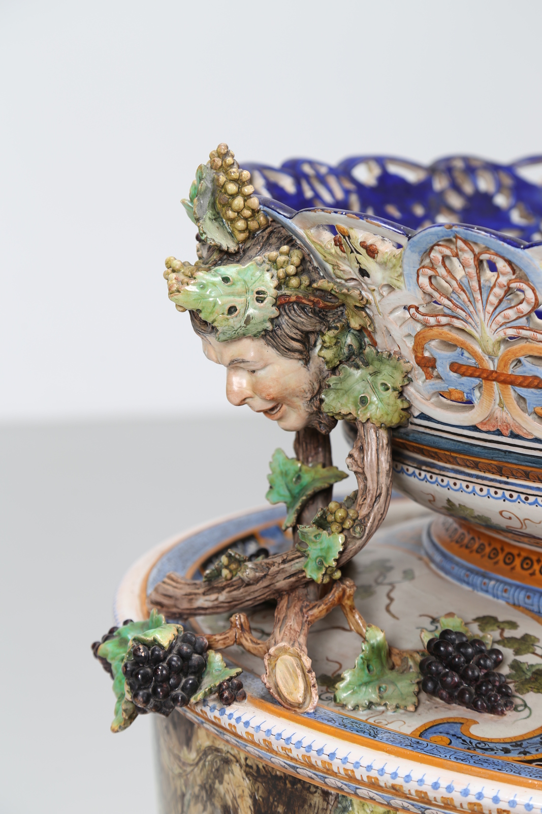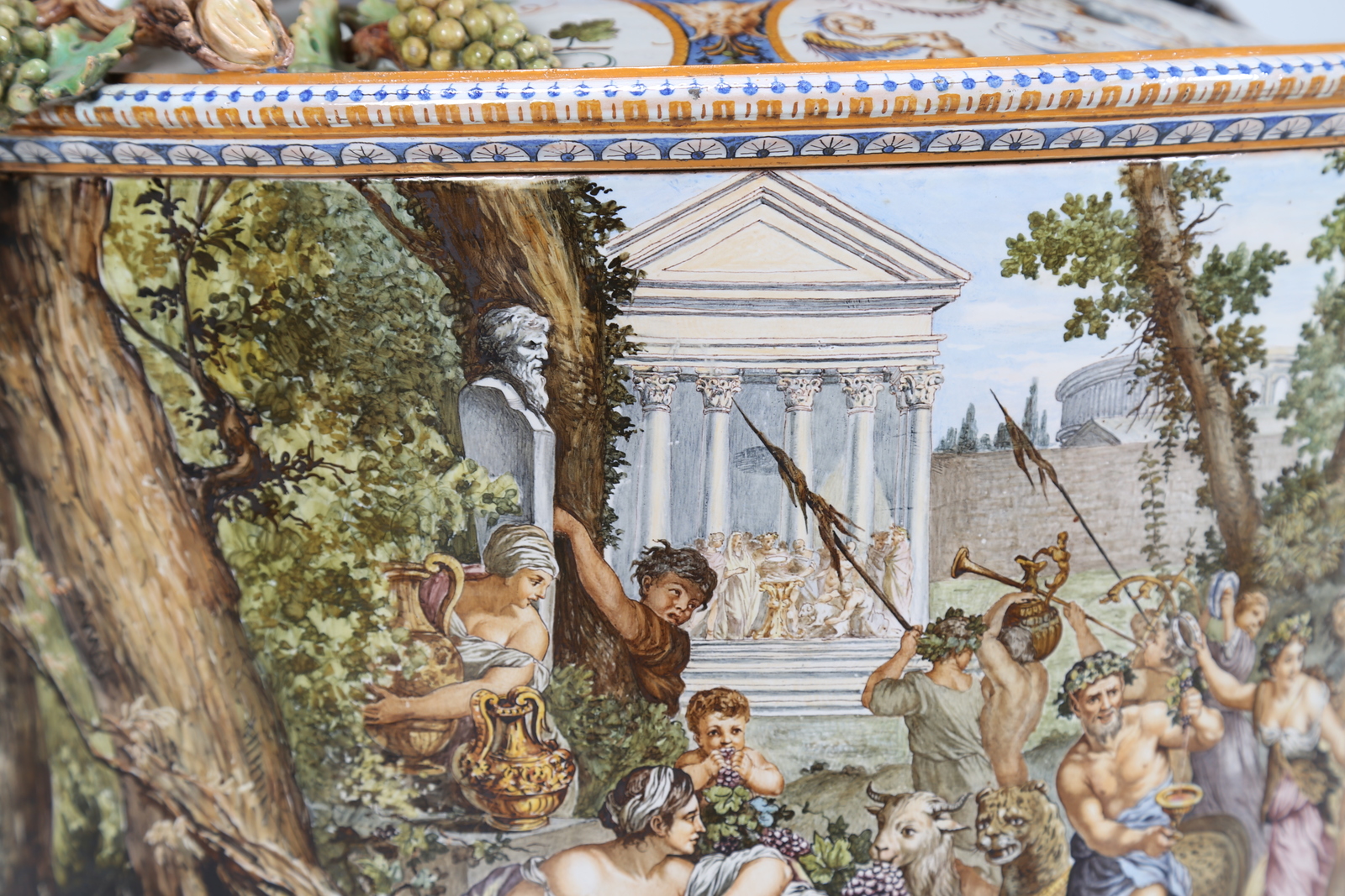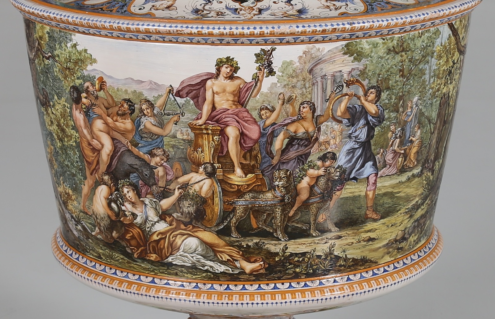 GINORI A DOCCIA (XIX SECOLO) Imponente Vaso Ginori, in maiolica policroma decorato con il "Trionfo di Bacco" tratto dal dipinto di Pietro da Cortonai, seconda metà del XIX secolo. . . Cm 68,00 x 89,00 x 65,00. Stampiglia Ginori alla base.