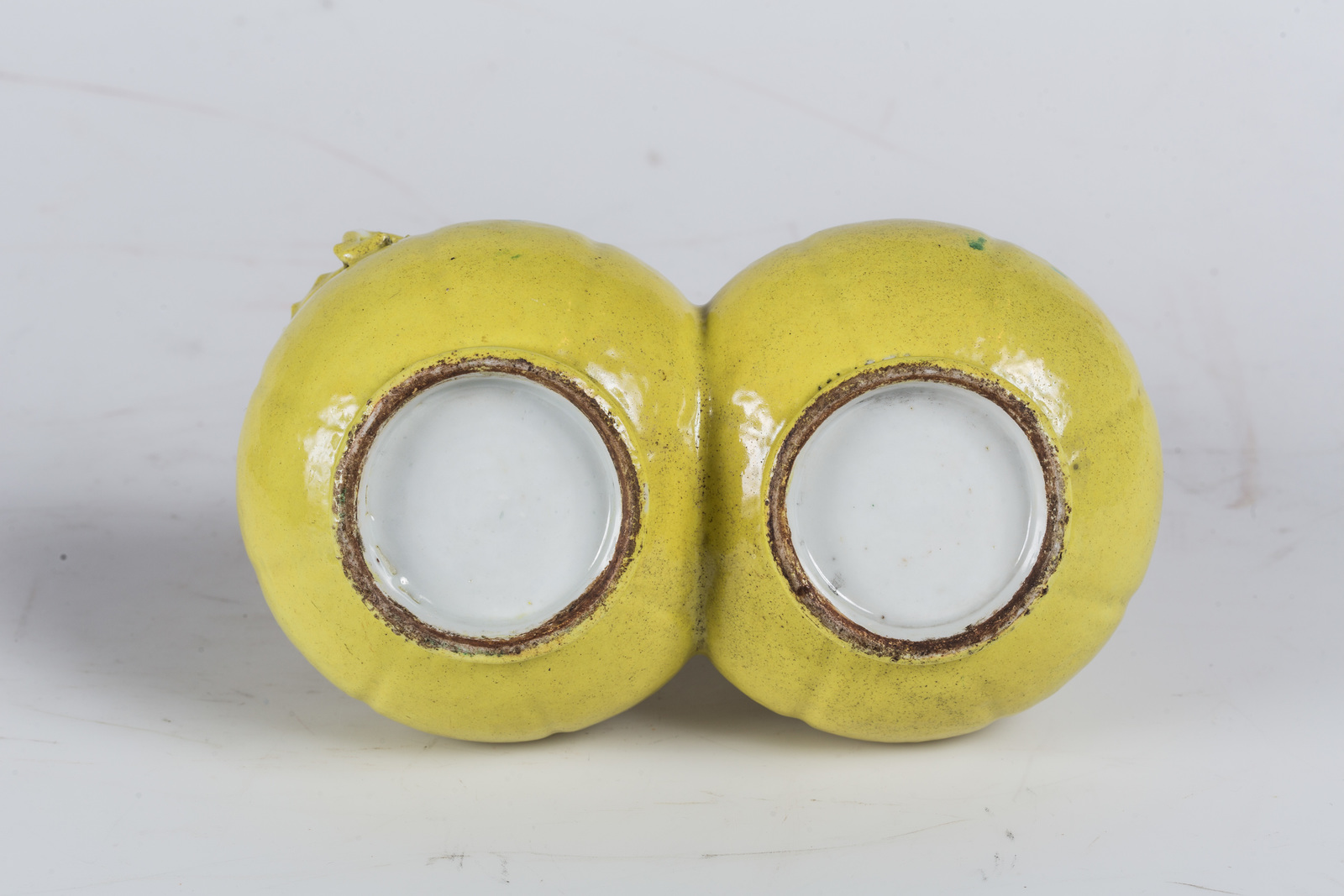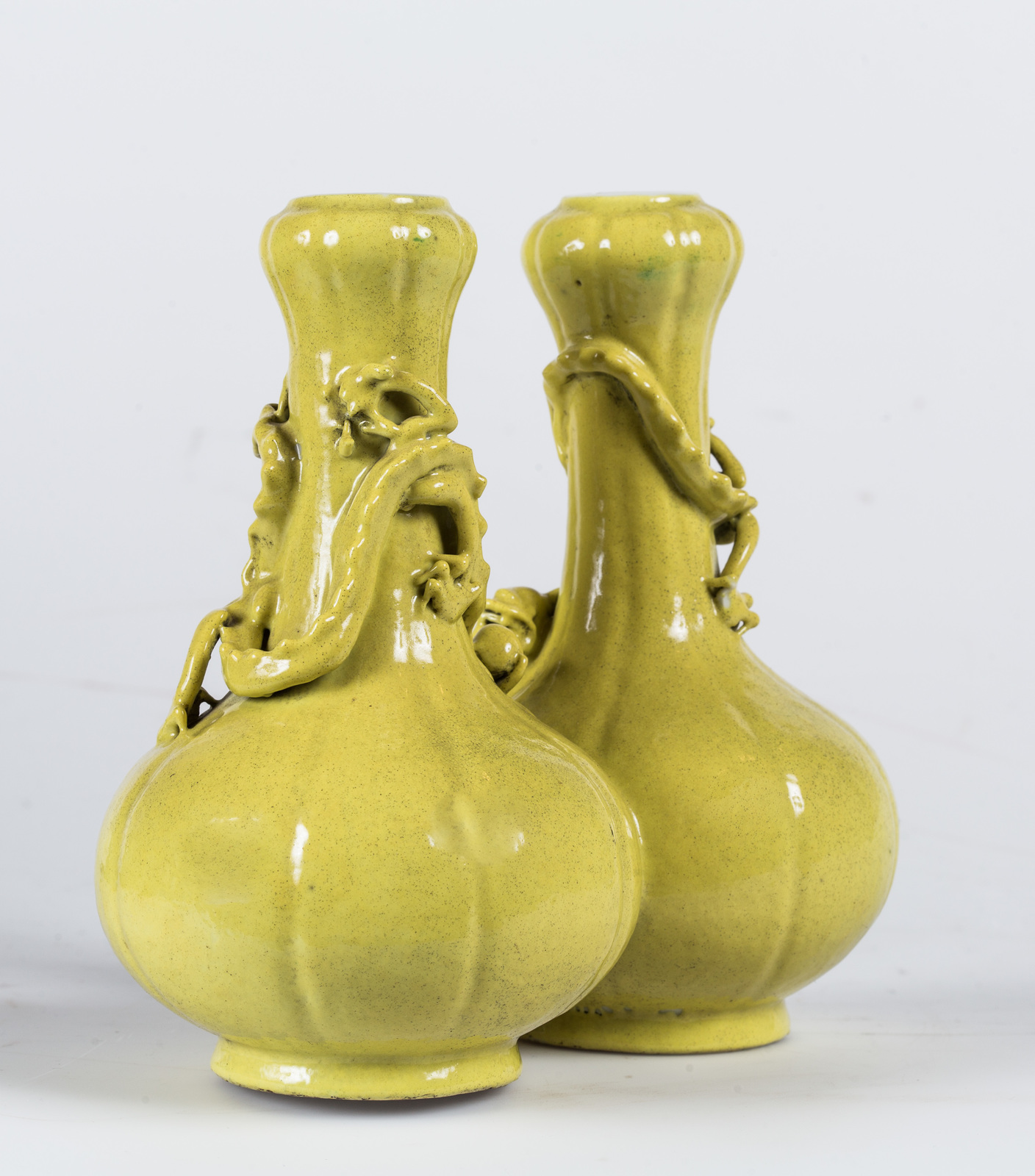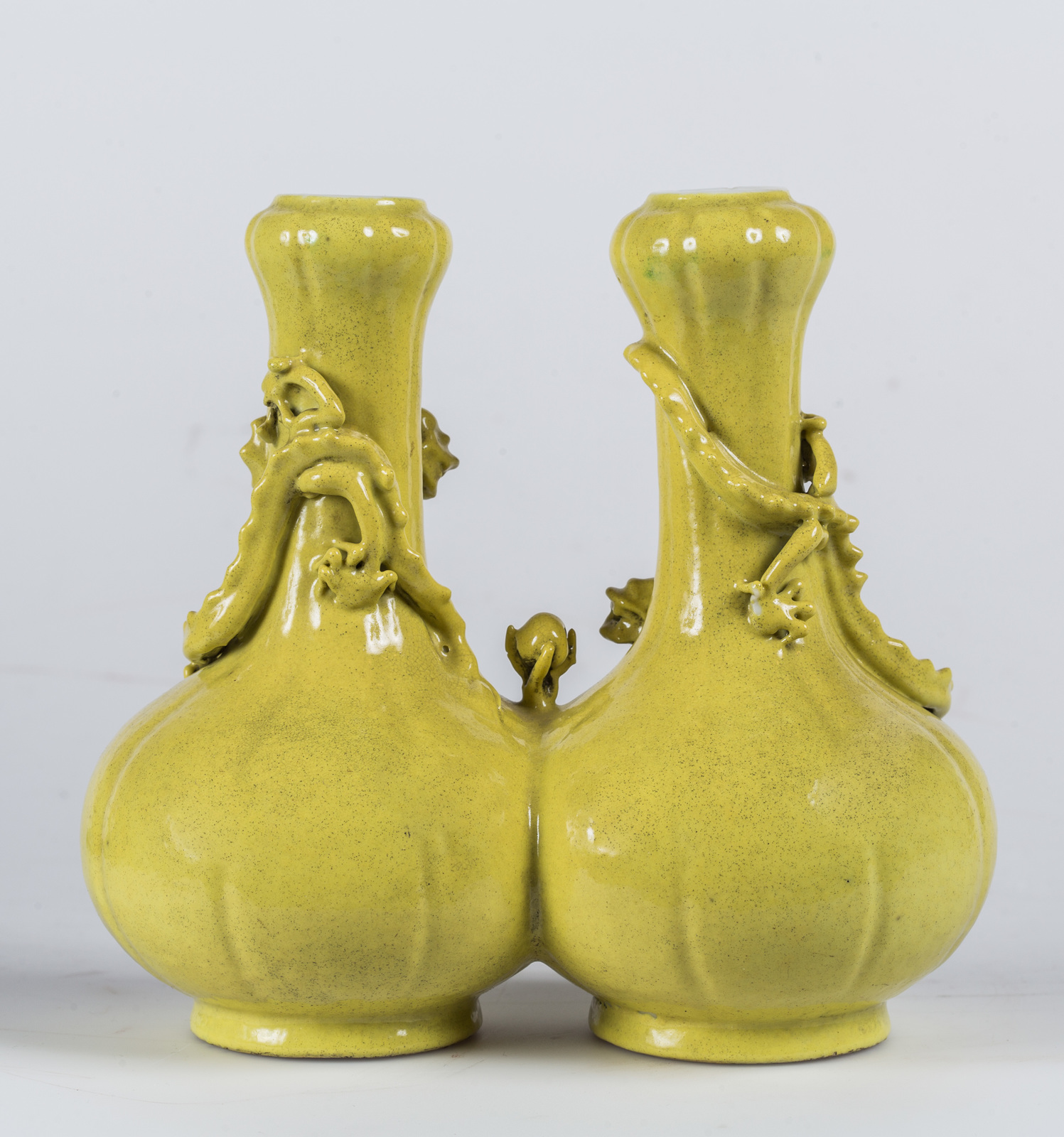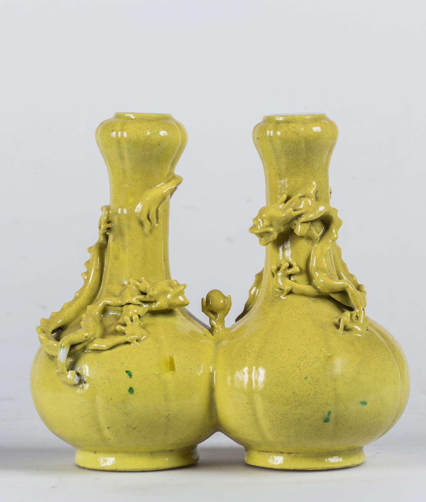 Cina, dinastia Qing, inizio XIX secolo . -. Cm 18,00 x 18,00. Doppio vaso a forma di pera con sommità a testa d'aglio, invetriato di giallo, mostra fine decoro stampato sul collo dell'oggetto raffigurante draghi alla ricerca della perla fiammeggiante.