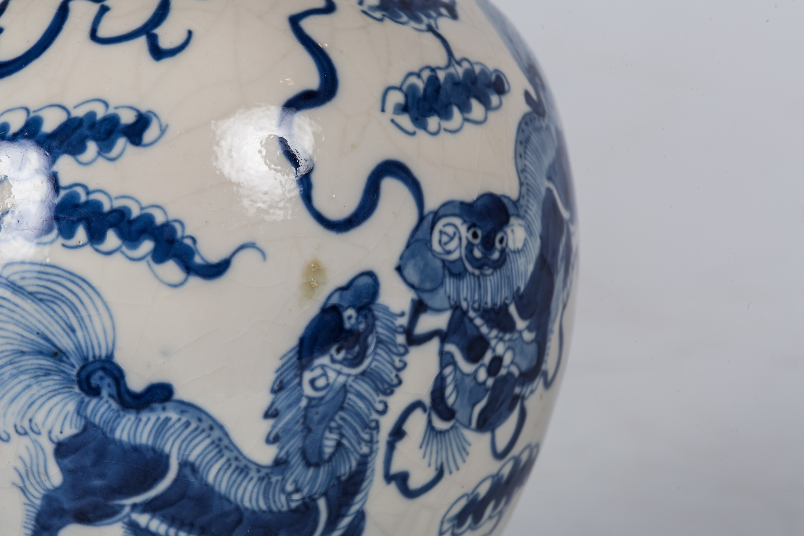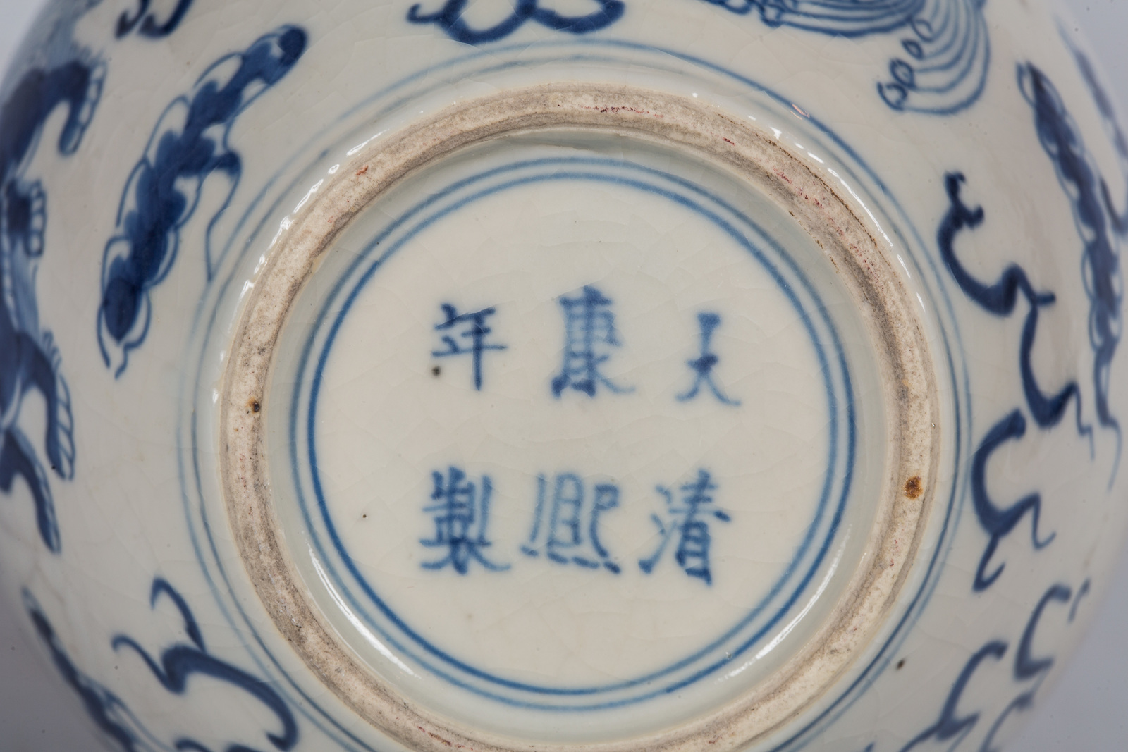 Cina, dinastia Qing, XIX secolo . -. Cm 10,50 x 14,00. Dipinto con cani di pho tra nuvole e recante marchio Kangxi a sei caratteri entro doppio cerchio sulla base.