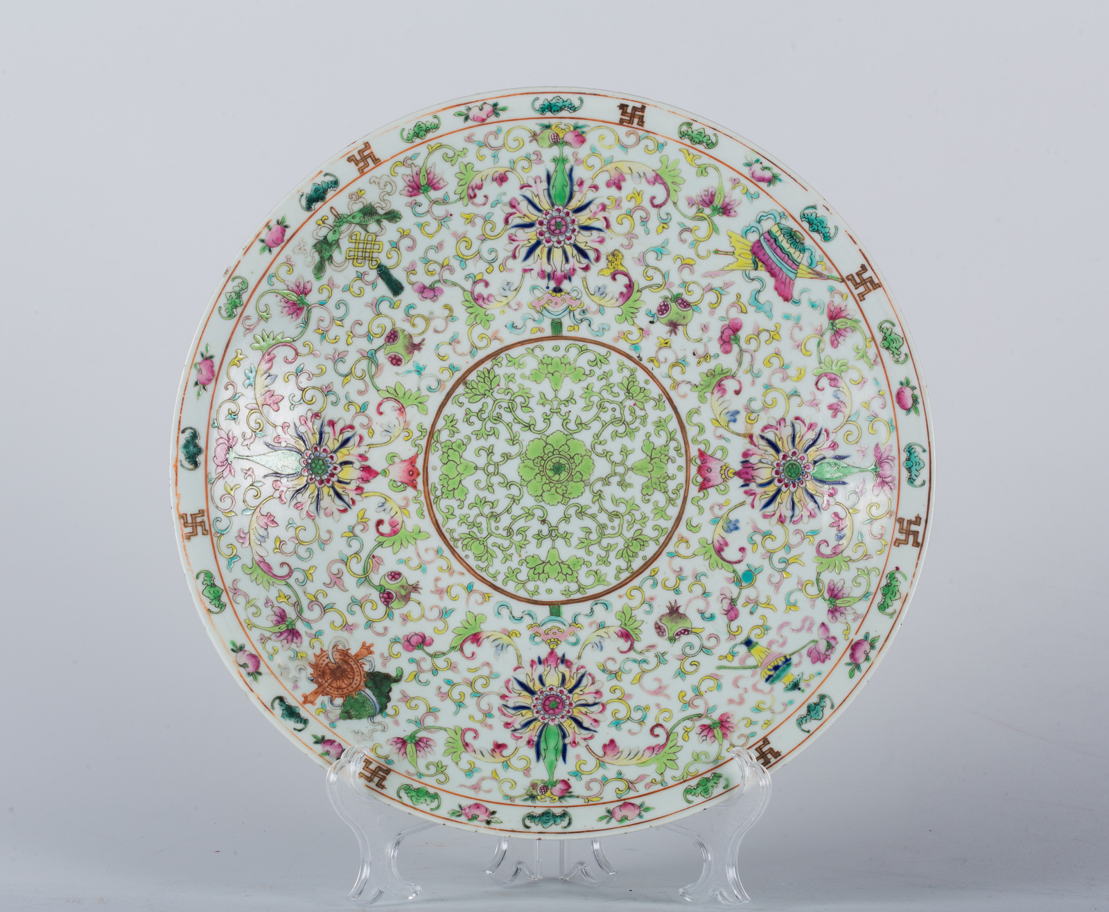 Arte Cinese Piatto in porcellana famiglia rosa dipinto con elementi buddisti...