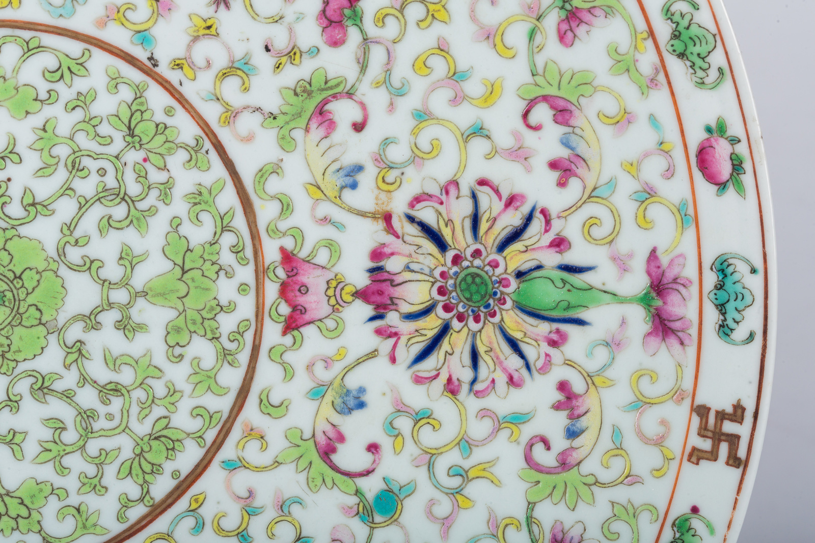 Arte Cinese Piatto in porcellana famiglia rosa dipinto con elementi buddisti