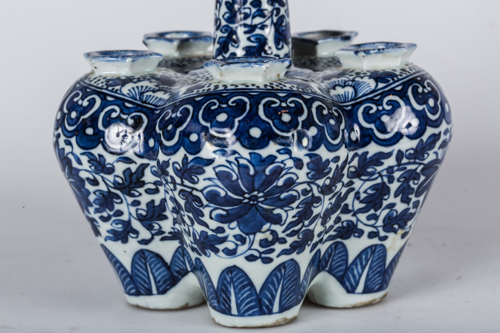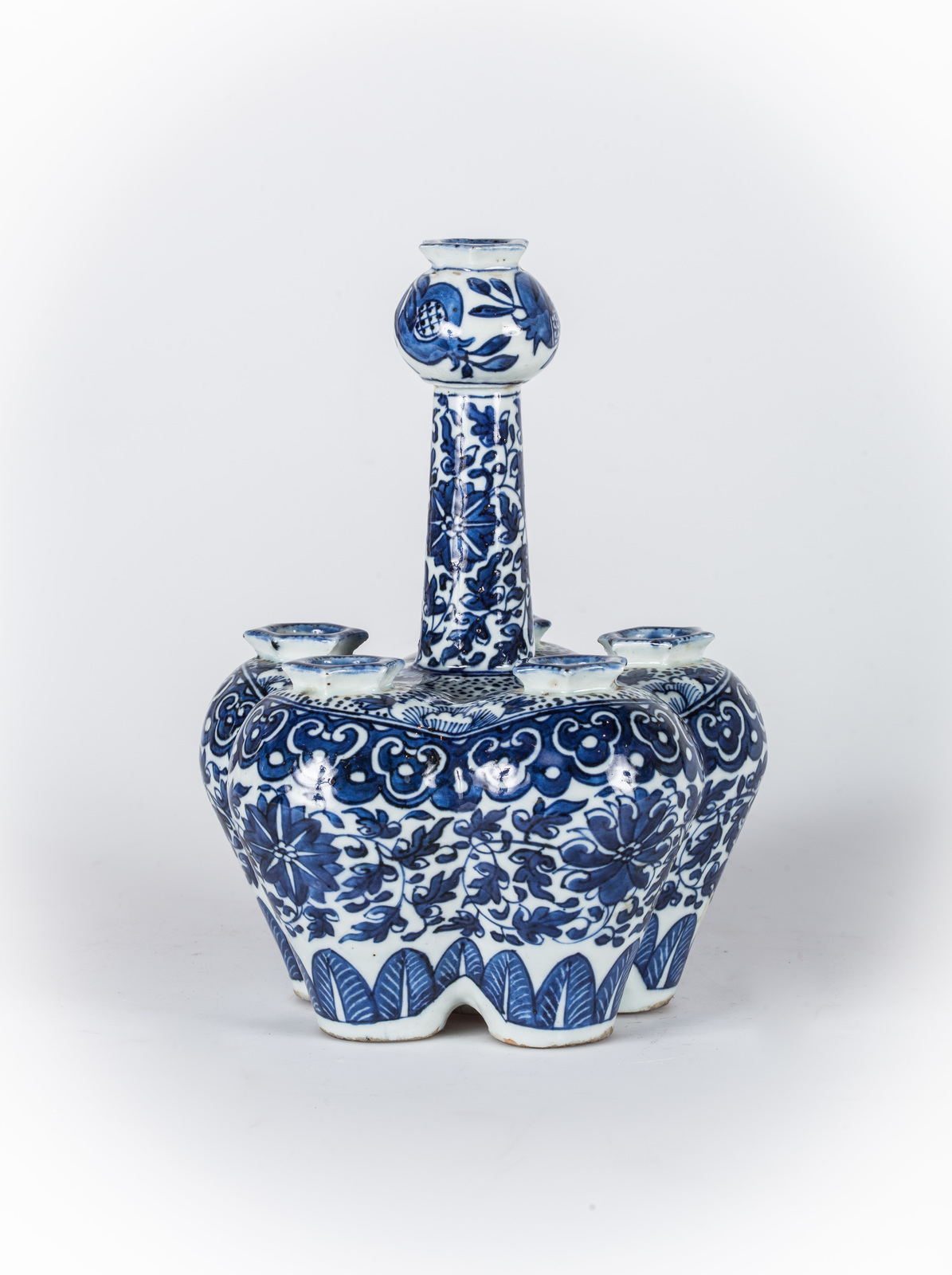 Arte Cinese Porta fiori in porcellana bianco/blu Cina, dinastia Qing, XVIII secolo . -. Cm 17,50 x 26,00. dalla peculiare forma a bulbo con cinque strette aperture sulla spalla ed una sul collo, atte a contenere fiori. La decorazione, in blu cobalto sotto vetrina trasparente, presenta motivi floreali, teste di ruyi e melograni sulla porzione superiore dell'oggetto.