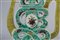 Cina, XX secolo . -. Cm 17,00 x 21,00. Sagomata in forma di nodo, dipinta di giallo e turchese ravvivato da fiori e farfalle bordate di nero.