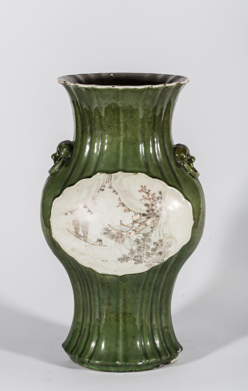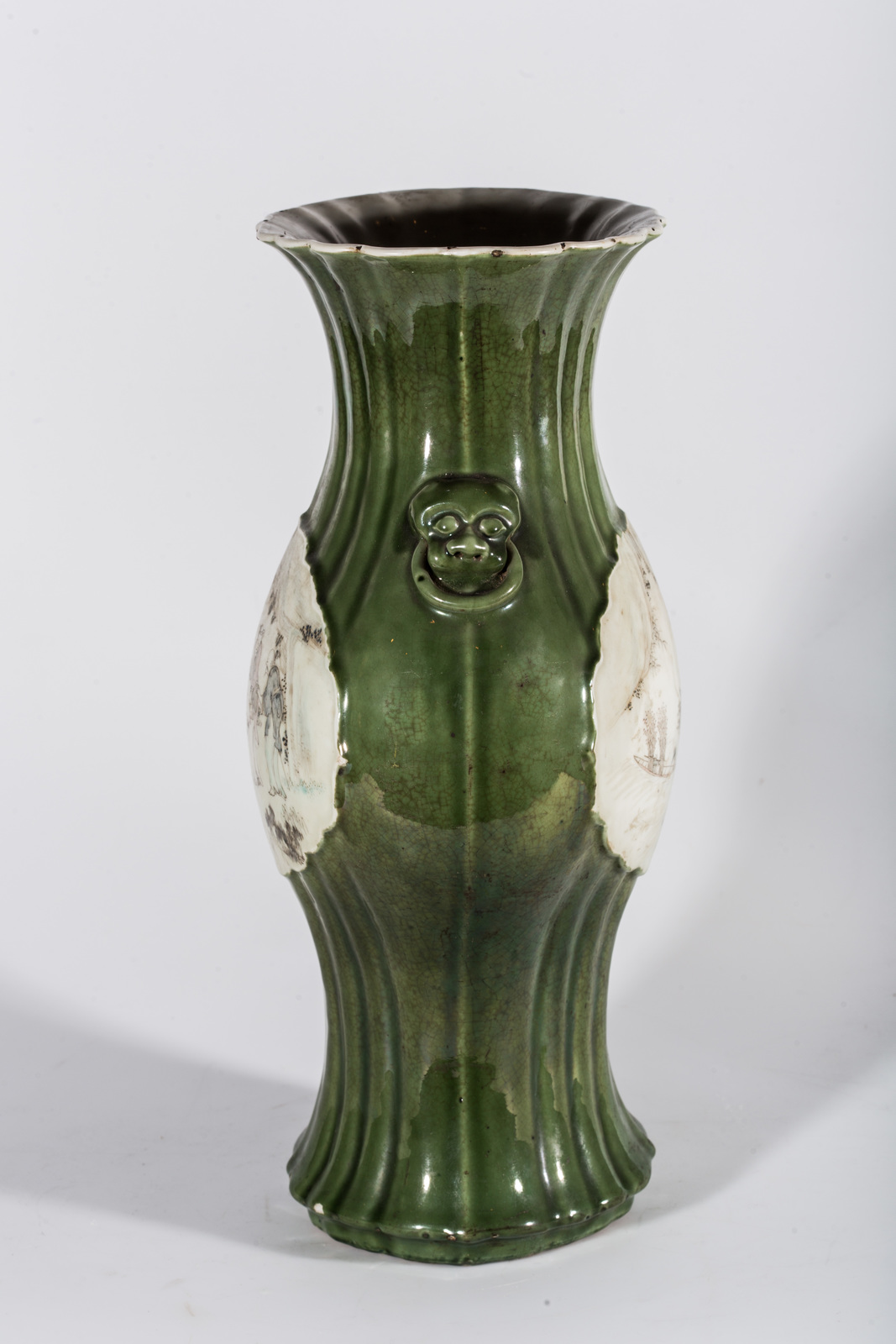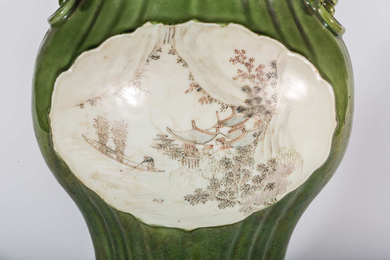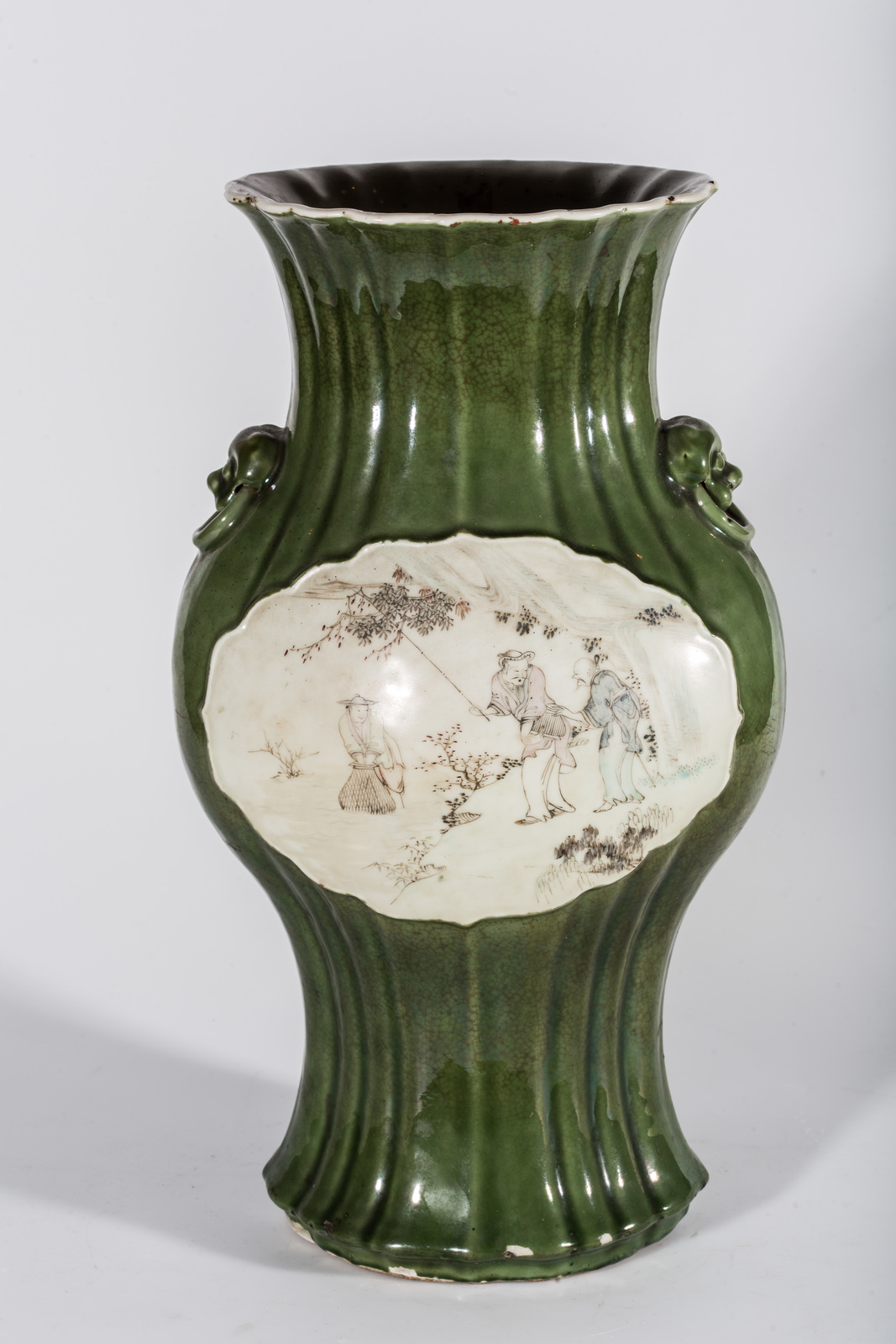 Cina, dinastia Qing, periodo Guangxu, 1875-1908. -. Cm 40,50. poggiante su disco, base e collo svasati e corpo centrale ovale dipinto con due grandi riserve lobate contenenti personaggi in paesaggio. Doppia ansa zoomorfa stampata.