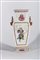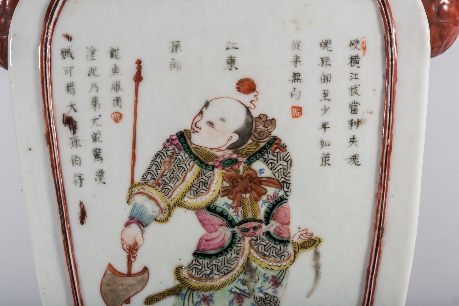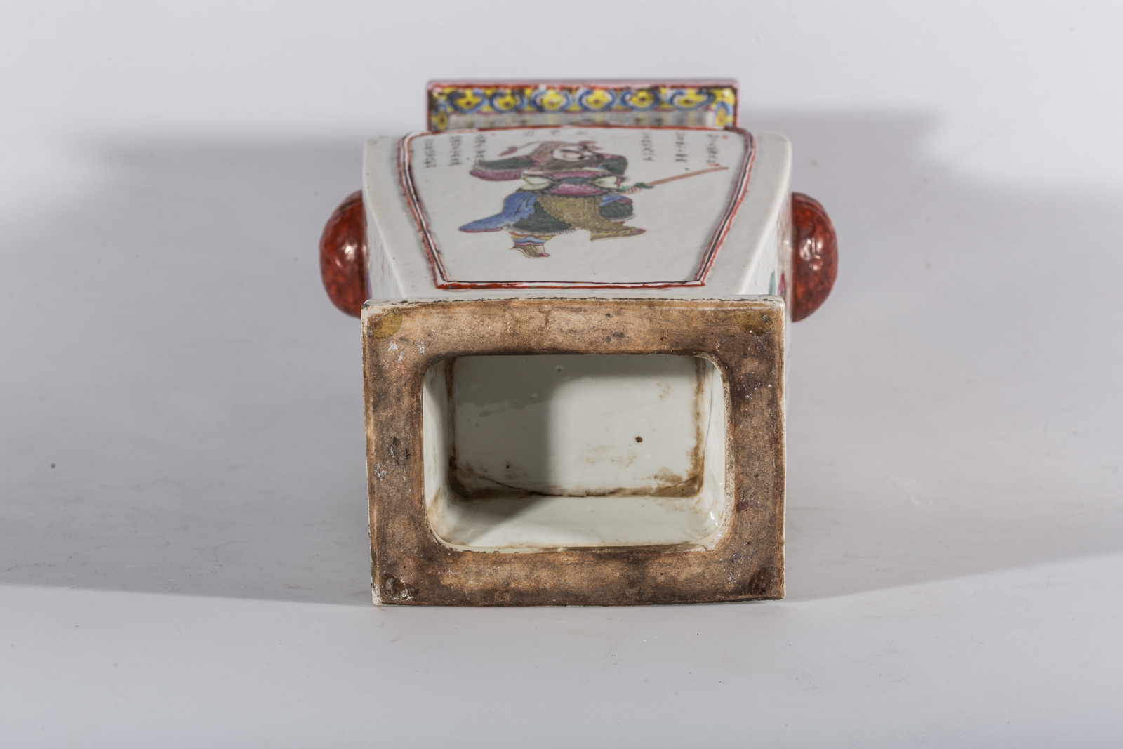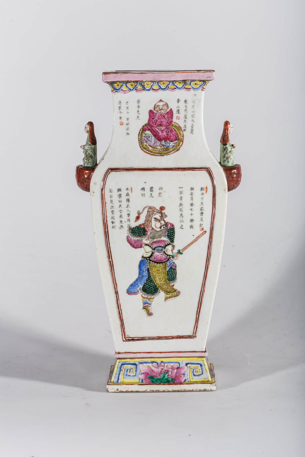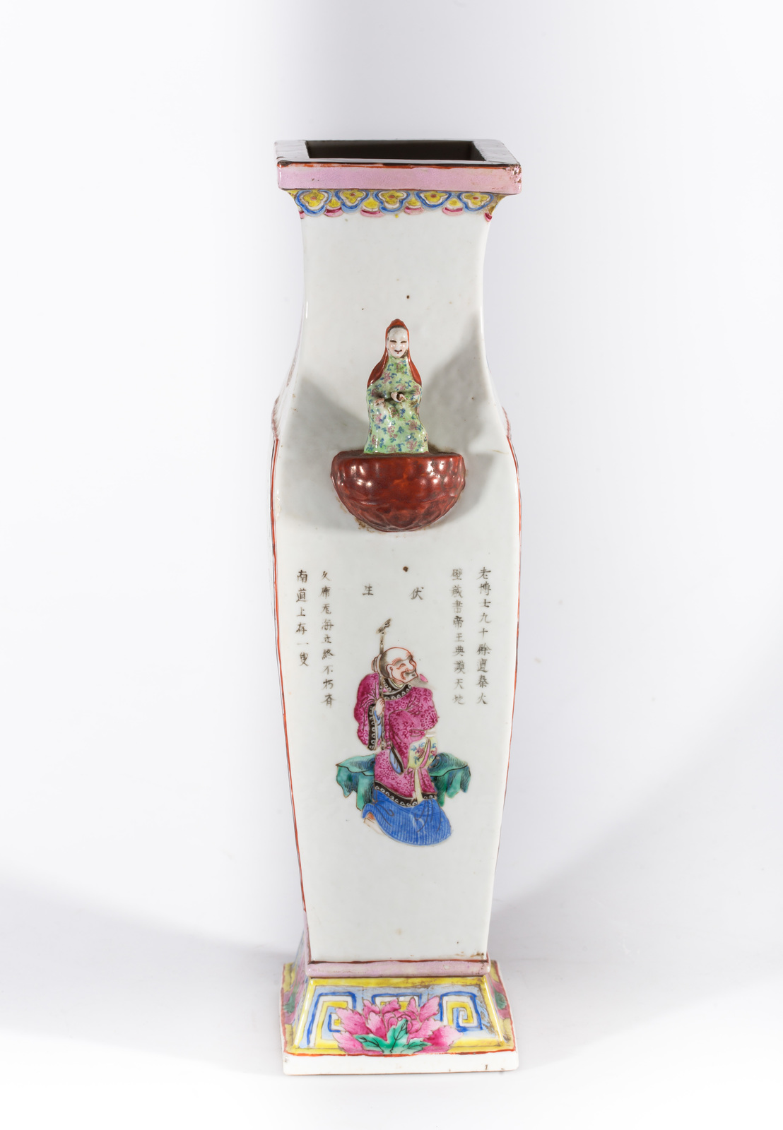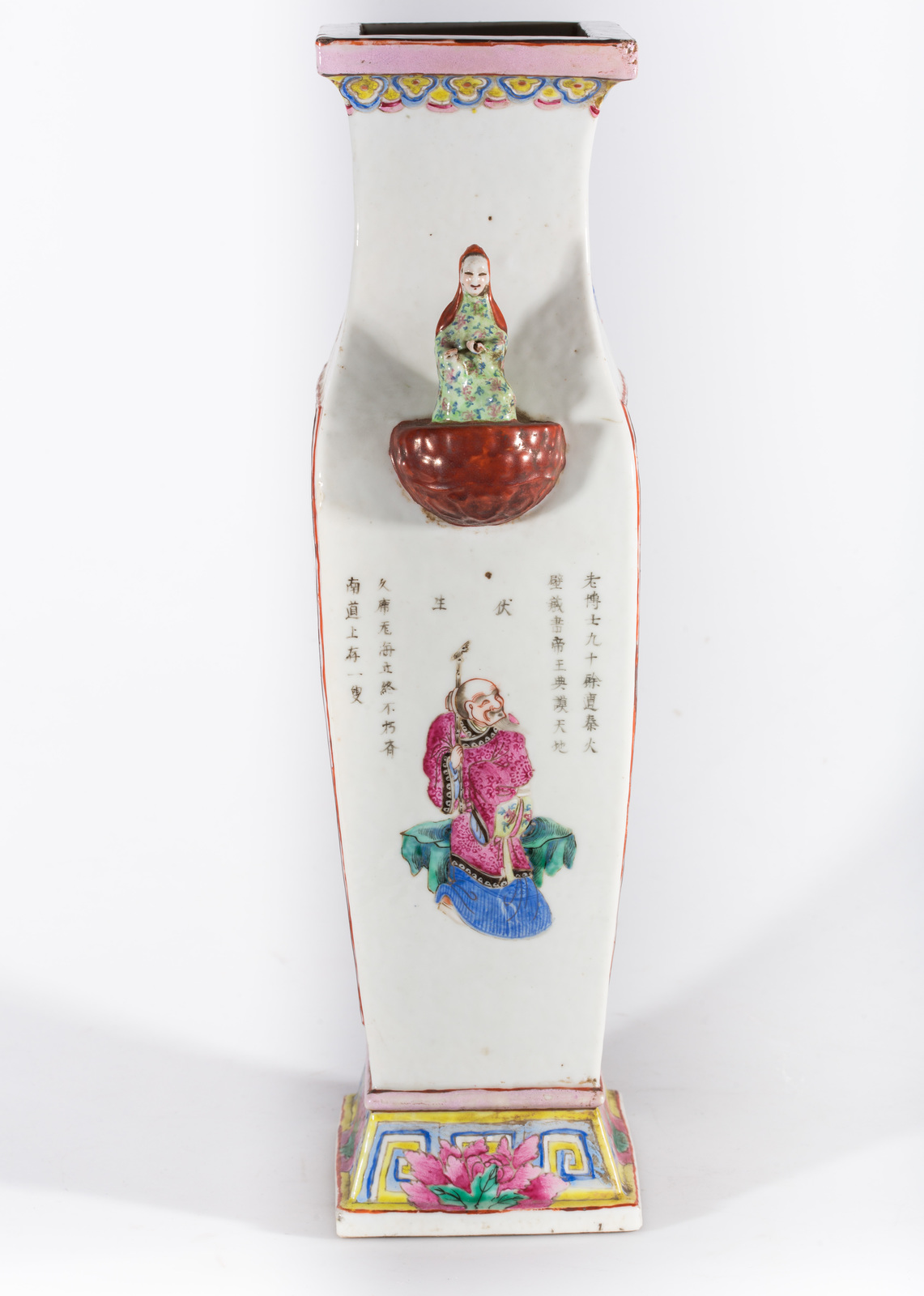 Cina, periodo Repubblica, XX secolo . -. . Vaso sfaccettato a base rettangolare decorata con motivi floreali. Le due facce più grandi dipinte con guerrieri ed iscrizioni; il collo, svasato, dipinto con due immortali ed ulteriori iscrizioni, doppia ansa sagomata in forma di piccoli personaggi femminili.