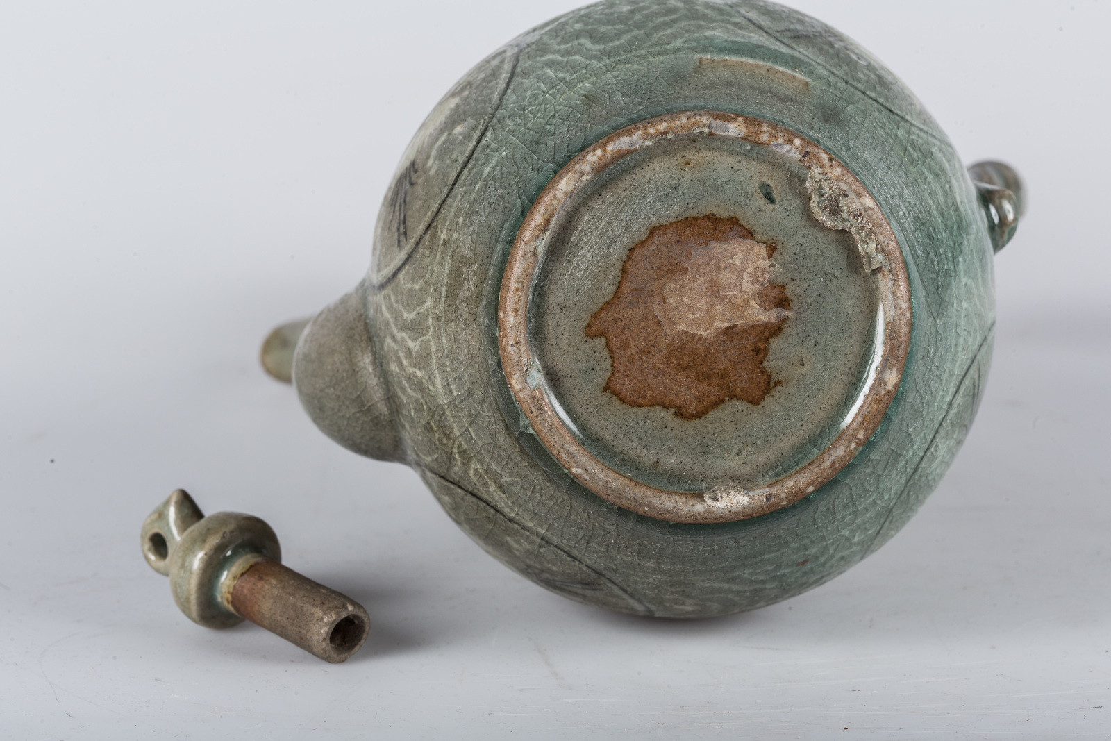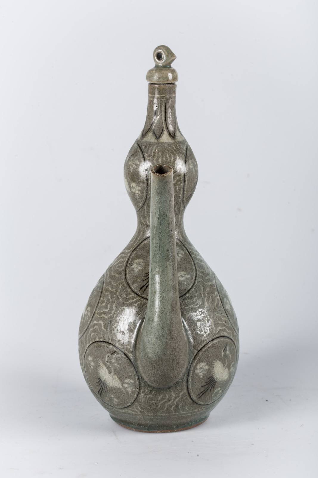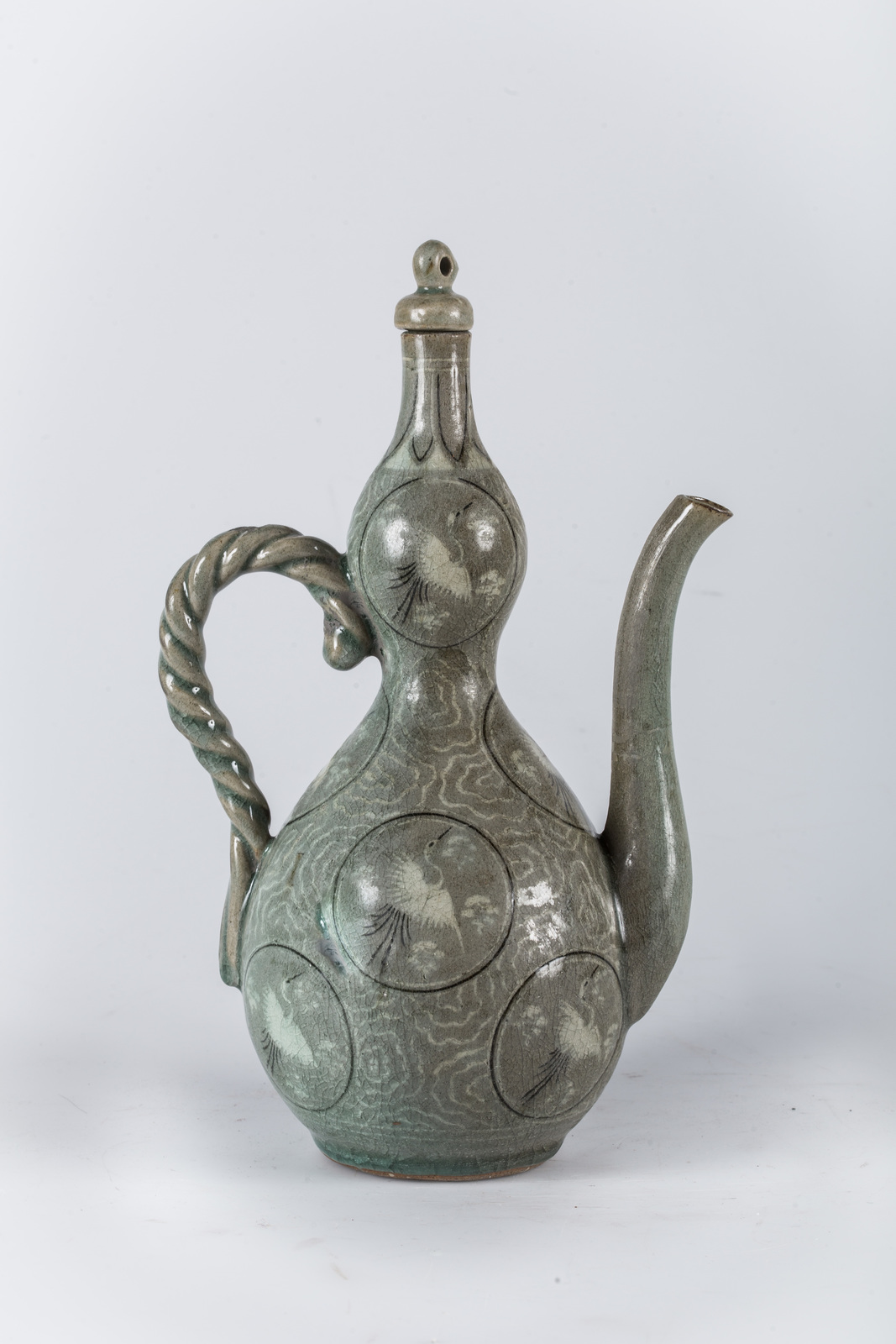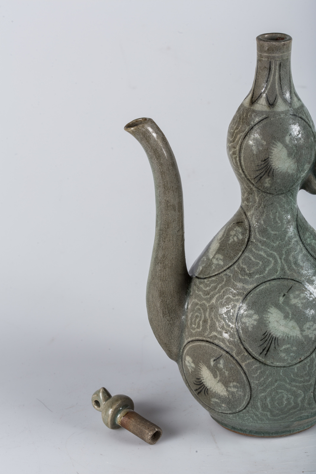 Corea, fine XIX secolo o precedente . -. Cm 17,00 x 28,50. Versatoio in forma di zucca in stile Goryeo, caratterizzato da manico a torchon e corpo decorato con motivi a nuvola sotto vetrina trasparente e riserve circolari contenenti aironi in volo.