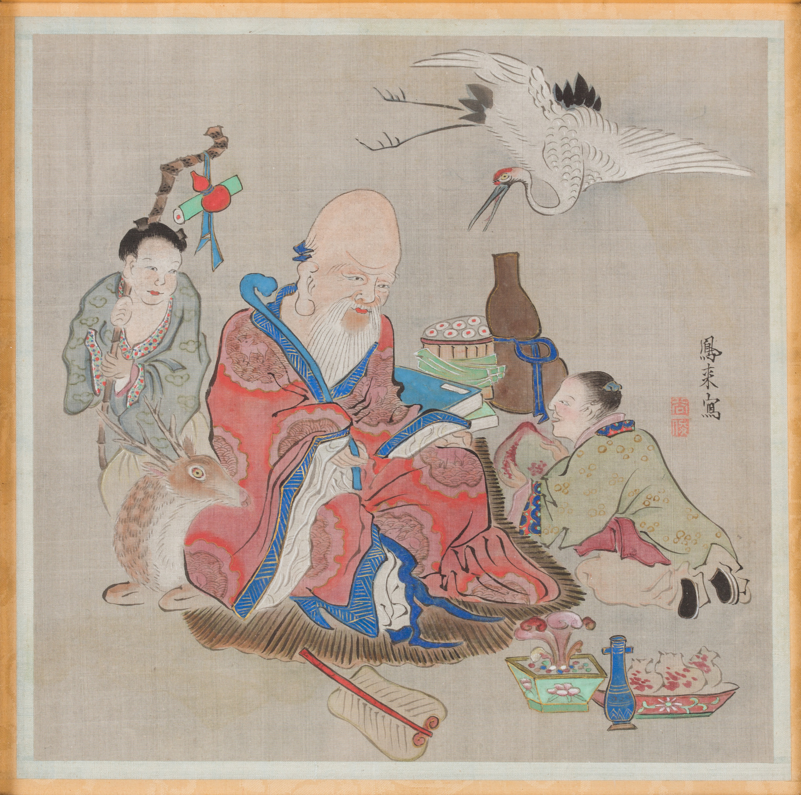 Cina, dinastia Qing, XIX secolo . -. Cm 27,00 x 27,00. Raffigurante Zhong-li Chuan, capo degli otto Immortali daoisti con il ventaglio che resuscitò le anime dei morti, e con la gru, simbolo di longevità.