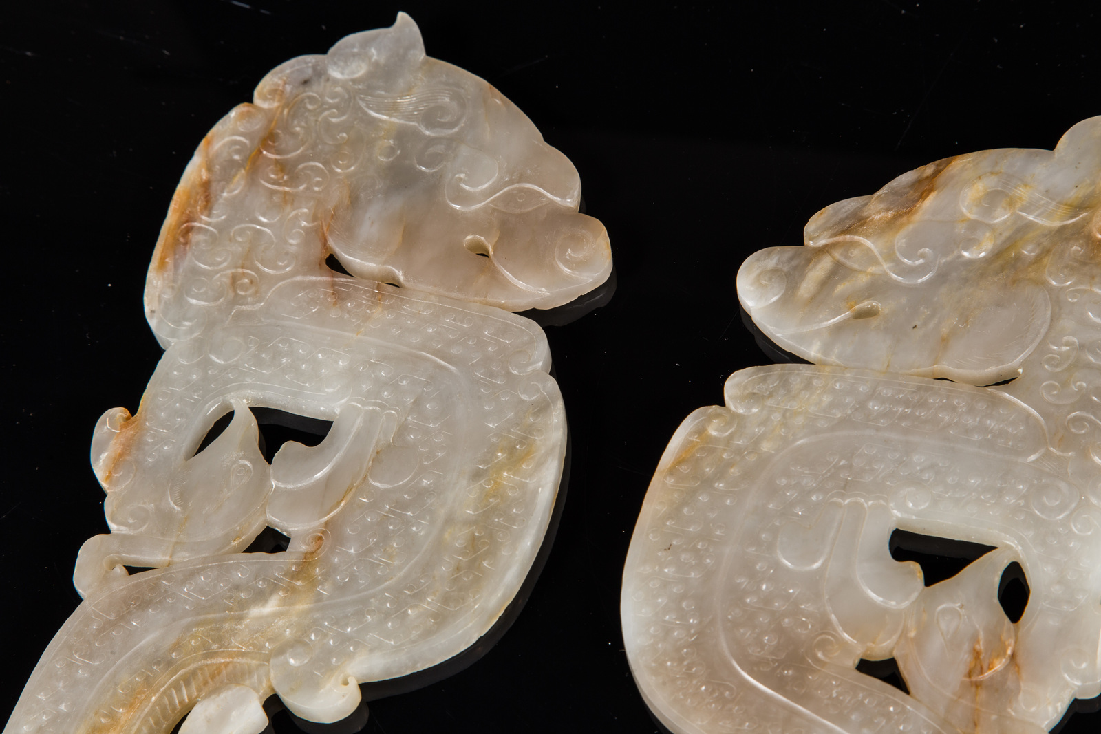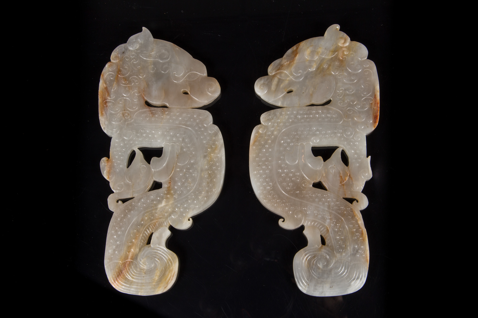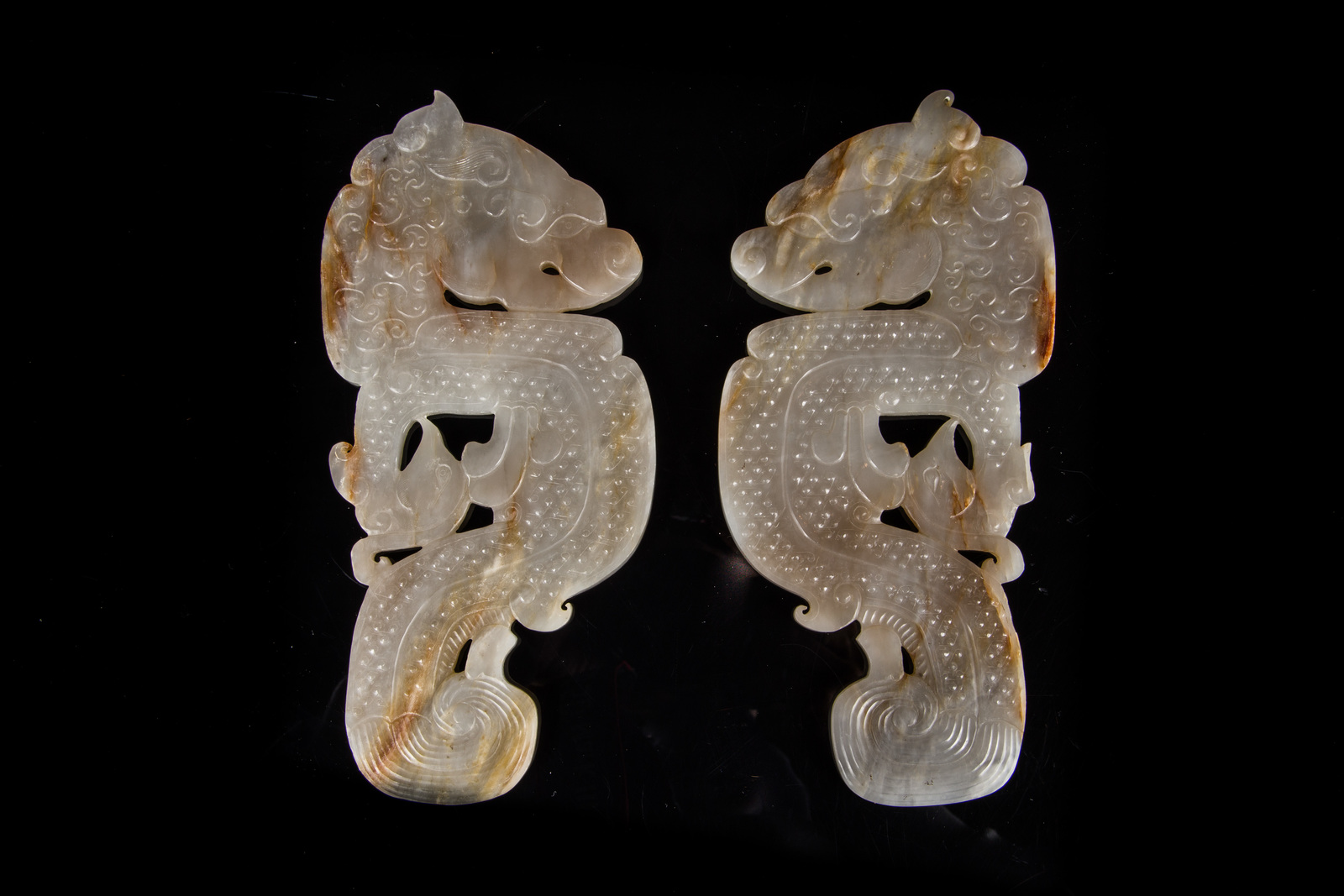 Arte Cinese Coppia di placche in giada intagliate in forma di chilong