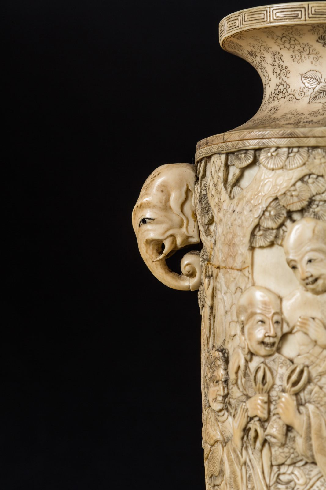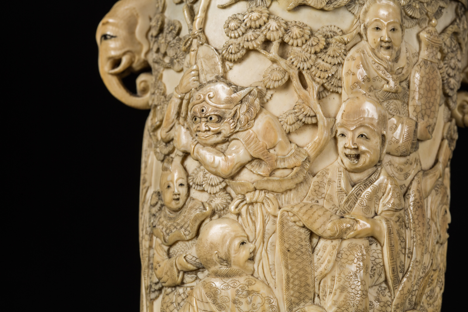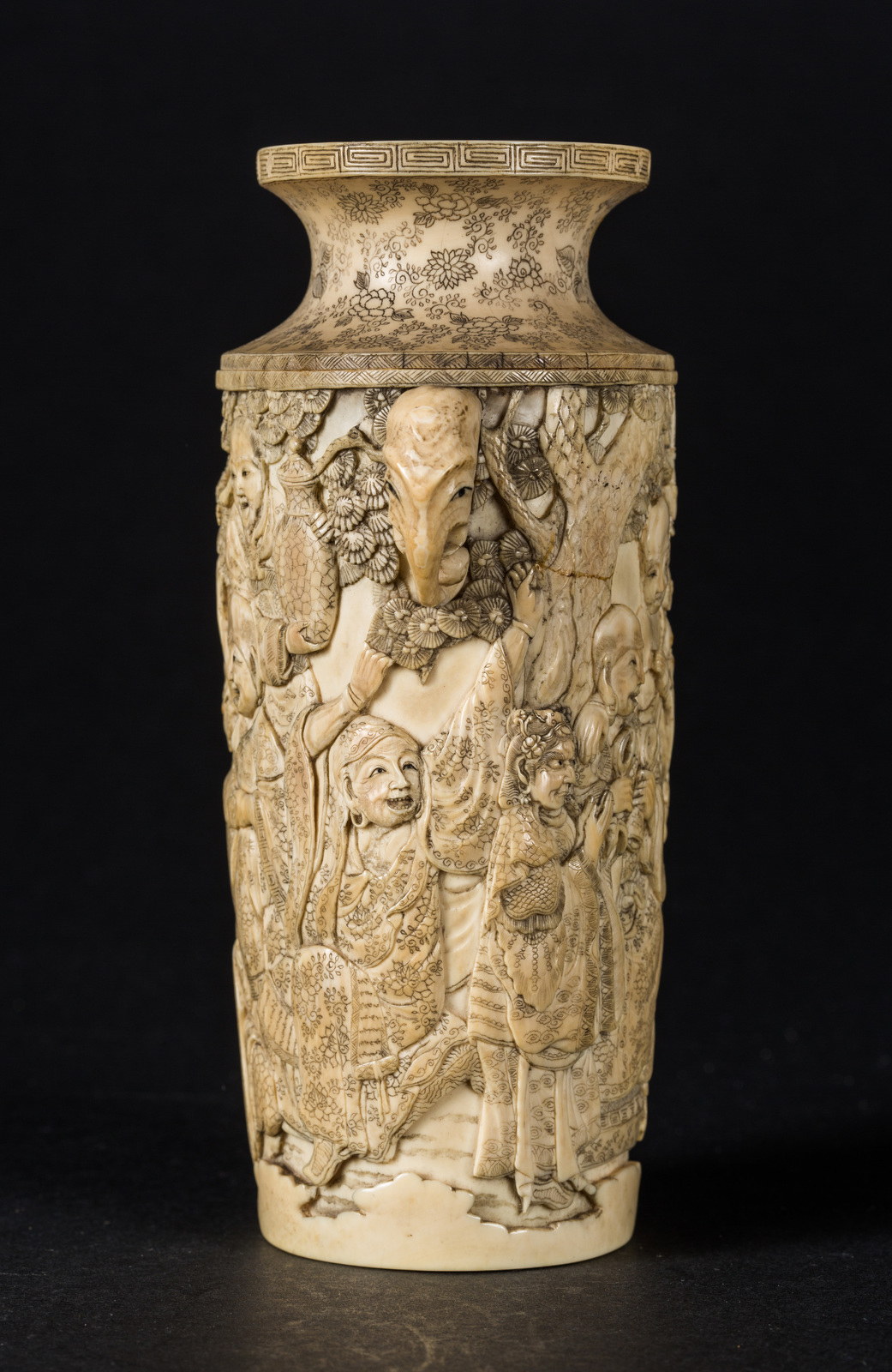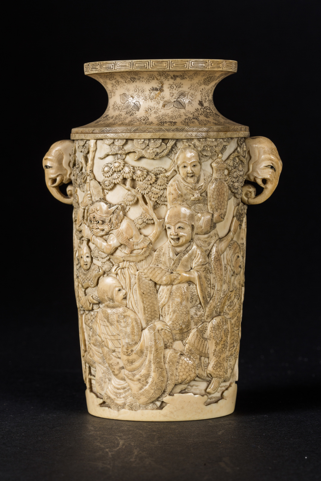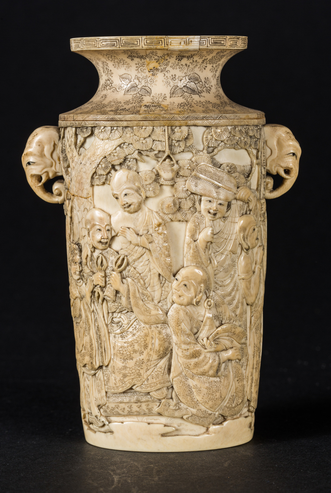 Japanese Art An ivory vase carved with characters at leisure under Chinese pines