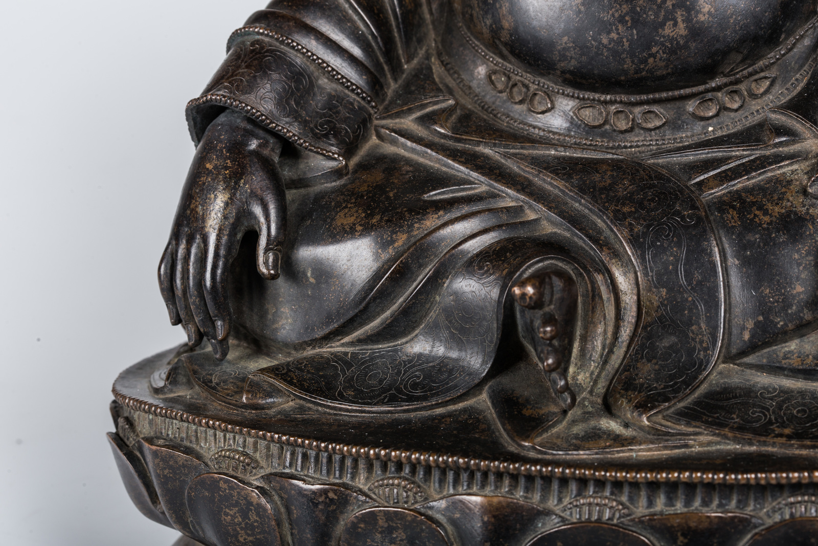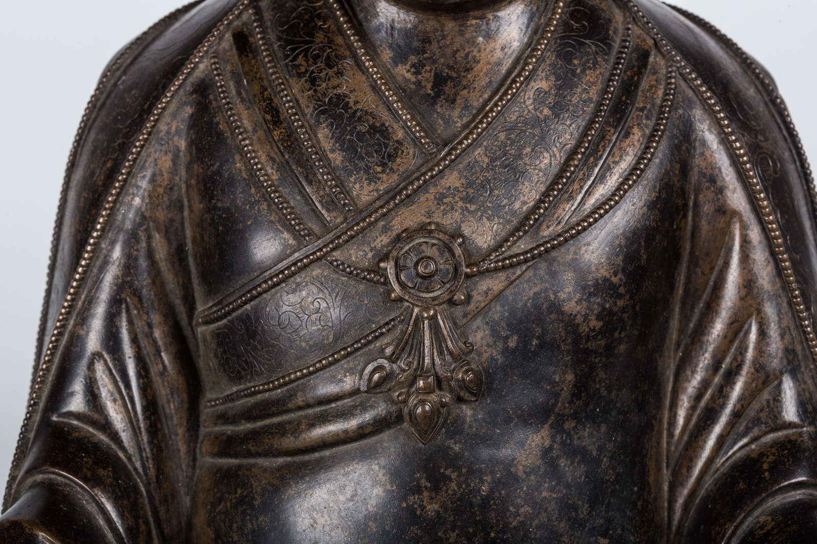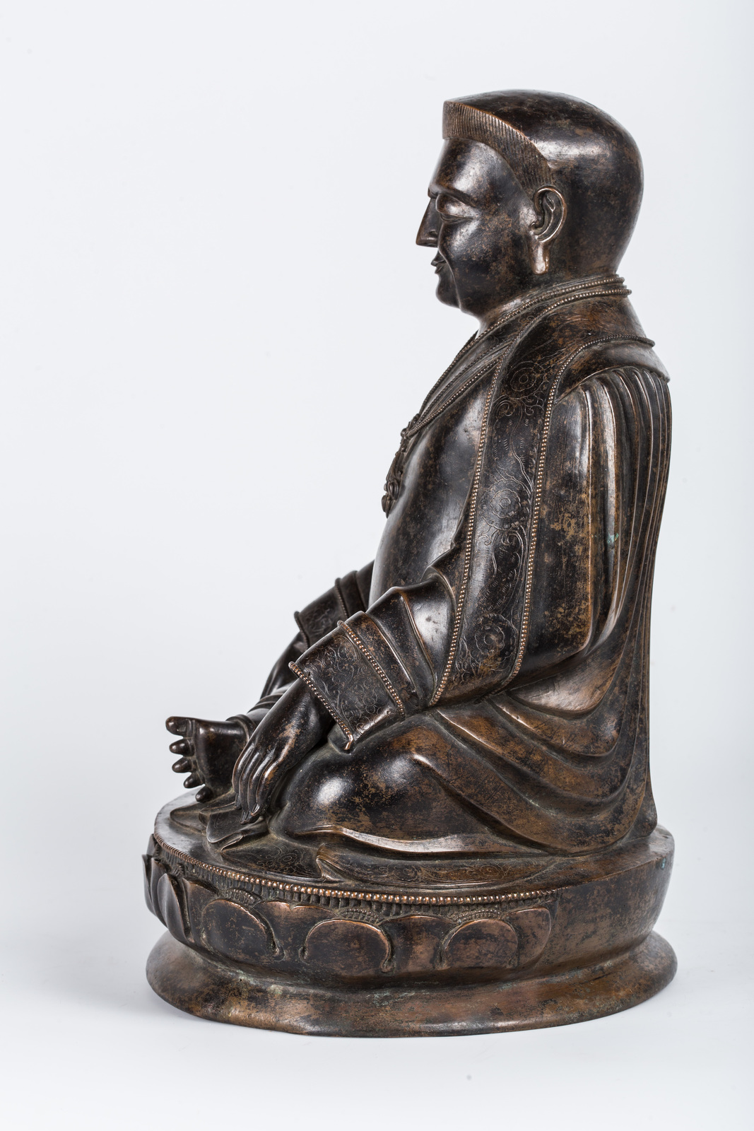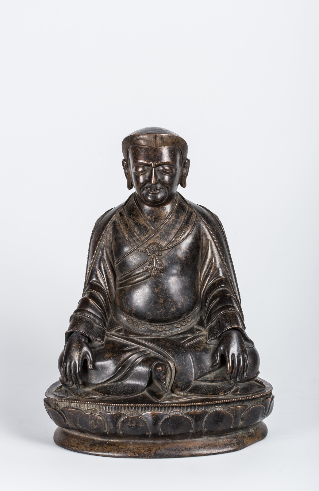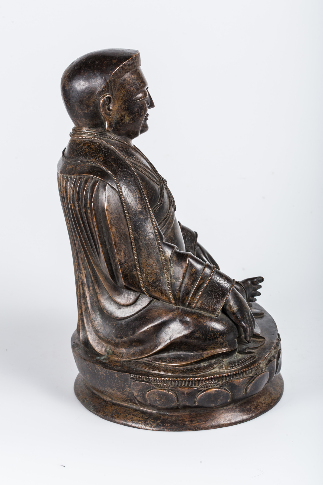 Sino/Tibet, 18th - 19th century . . Cm 30,00 x 38,50. Big dark bronze cast portraying the master Marpa Lotsawa (1012-1097). He is sitting on a single lotus flower base in the ardhaparyanka position, his left leg stretched outwards. Both his hands are resting on his knees in the bhumisparsamudra position, which is his exclusive characteristic. The face shows masculine, sharp traits, and is surrounded by short hair, characterizing him. The softly draped robe is enriched by fine floral decorations on the edges, by a cloak with ribbing and by jewels on the neck and the belt, which presents slots made to hold precious stones, now lost. Particularly impressive is the extremely fine quality of the cast of hands and feet.