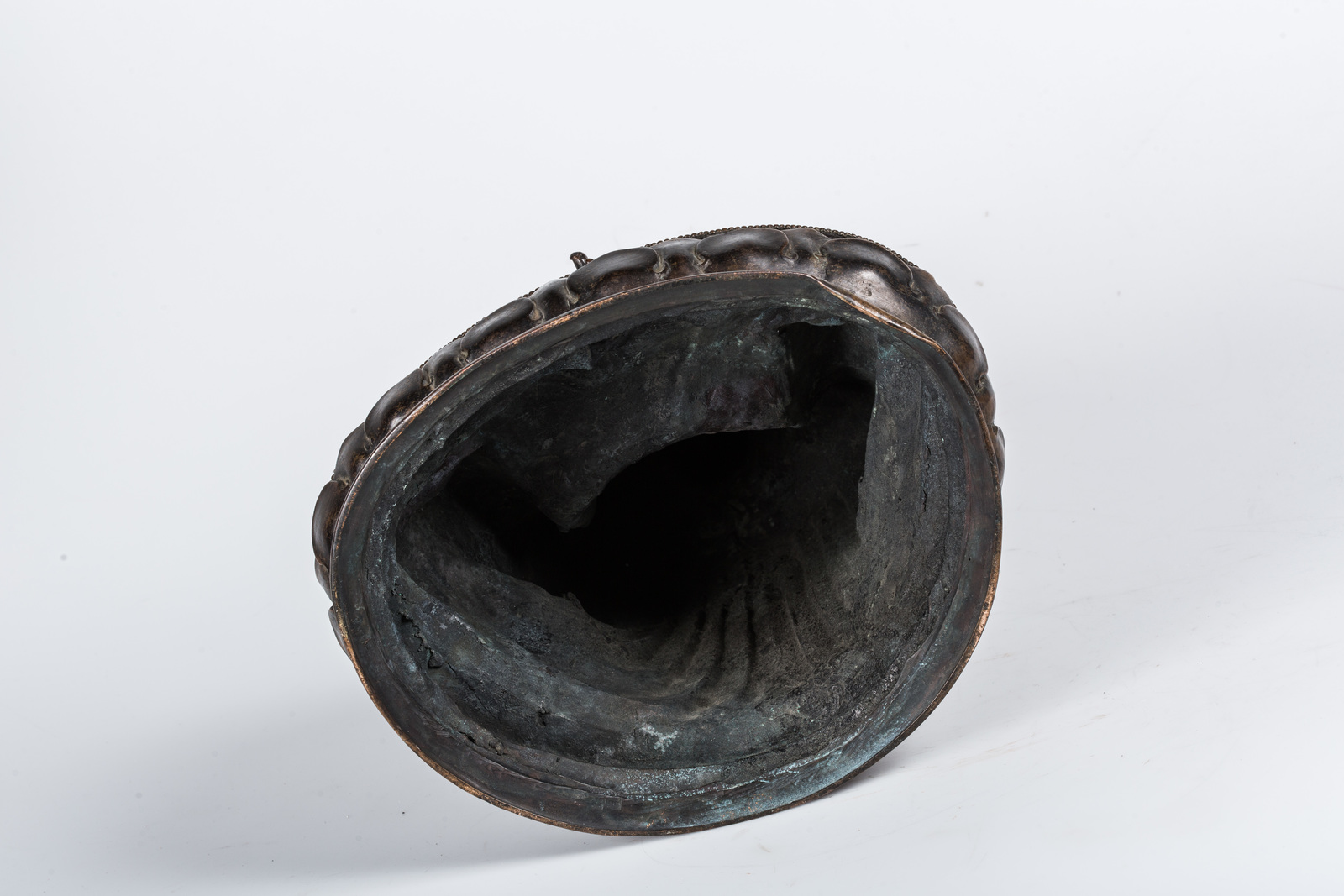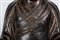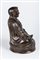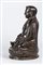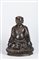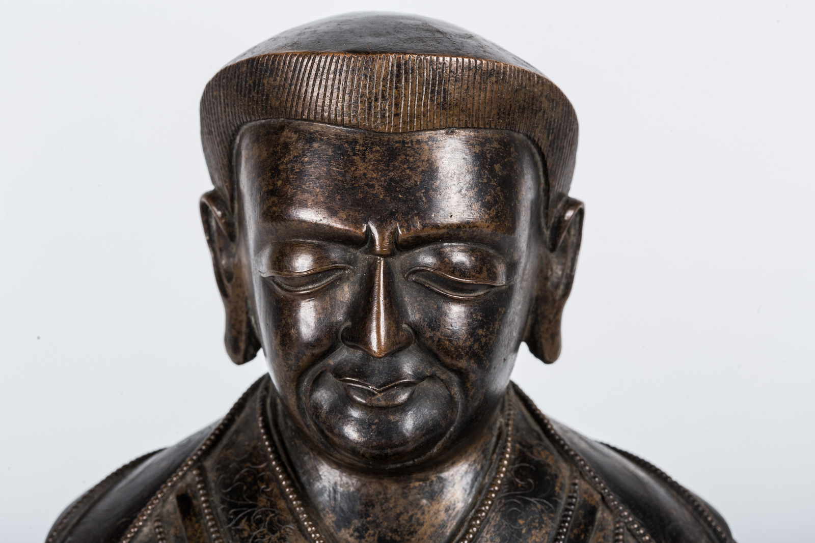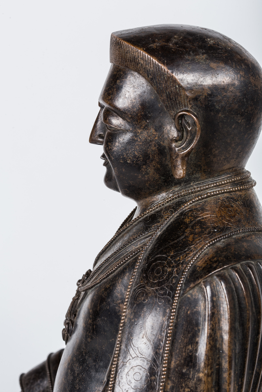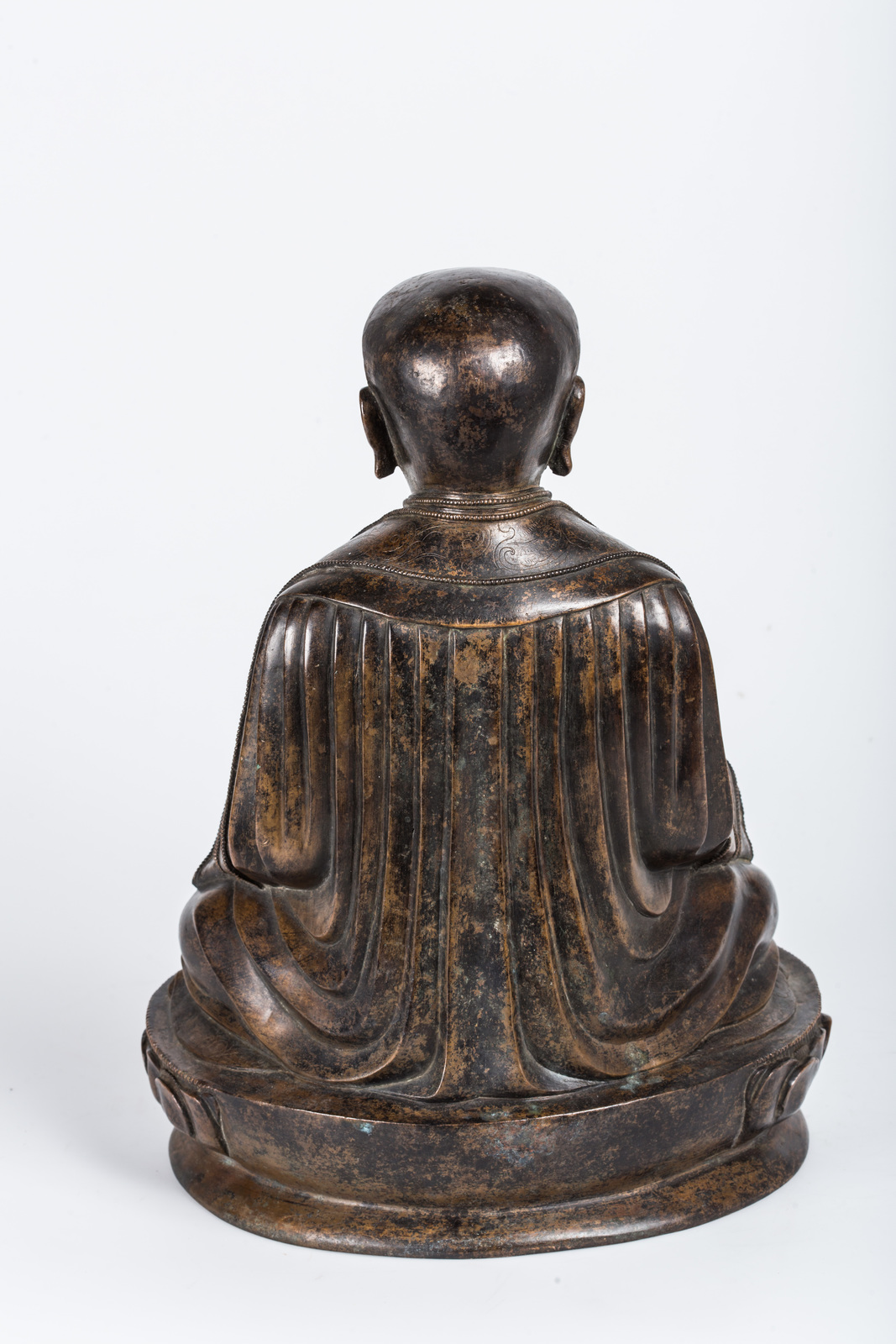 Sino/Tibet, 18th - 19th century . . Cm 30,00 x 38,50. Big dark bronze cast portraying the master Marpa Lotsawa (1012-1097). He is sitting on a single lotus flower base in the ardhaparyanka position, his left leg stretched outwards. Both his hands are resting on his knees in the bhumisparsamudra position, which is his exclusive characteristic. The face shows masculine, sharp traits, and is surrounded by short hair, characterizing him. The softly draped robe is enriched by fine floral decorations on the edges, by a cloak with ribbing and by jewels on the neck and the belt, which presents slots made to hold precious stones, now lost. Particularly impressive is the extremely fine quality of the cast of hands and feet.