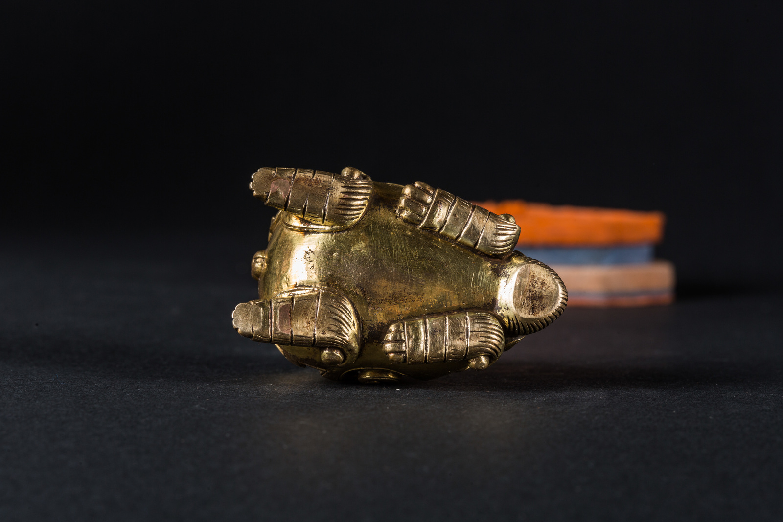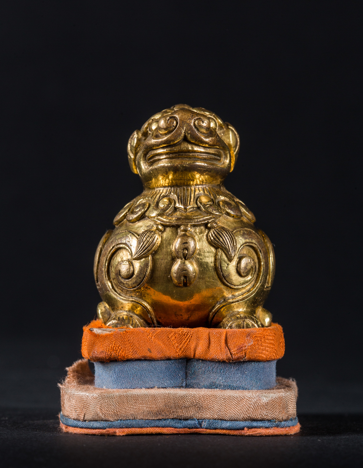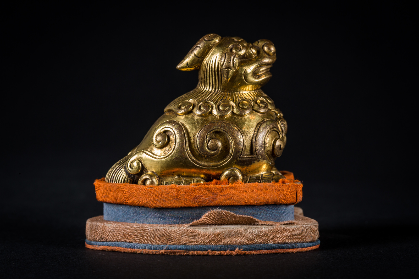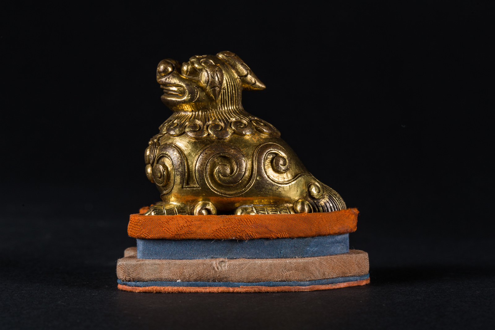 Cina, XIX secolo . -. Cm 6,00 x 5,00 x 3,50. Fusione raffigurante l'animale mitologico accucciato sulle quattro zampe, il corpo reca decorazioni a grande volute, il collo con criniera ed una collana rituale.