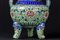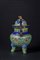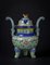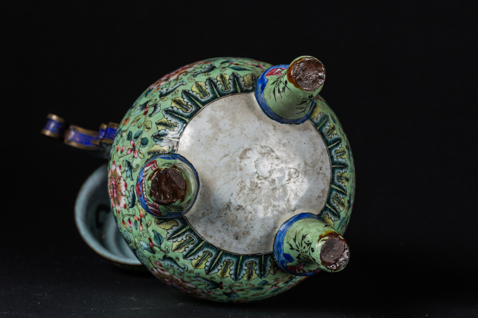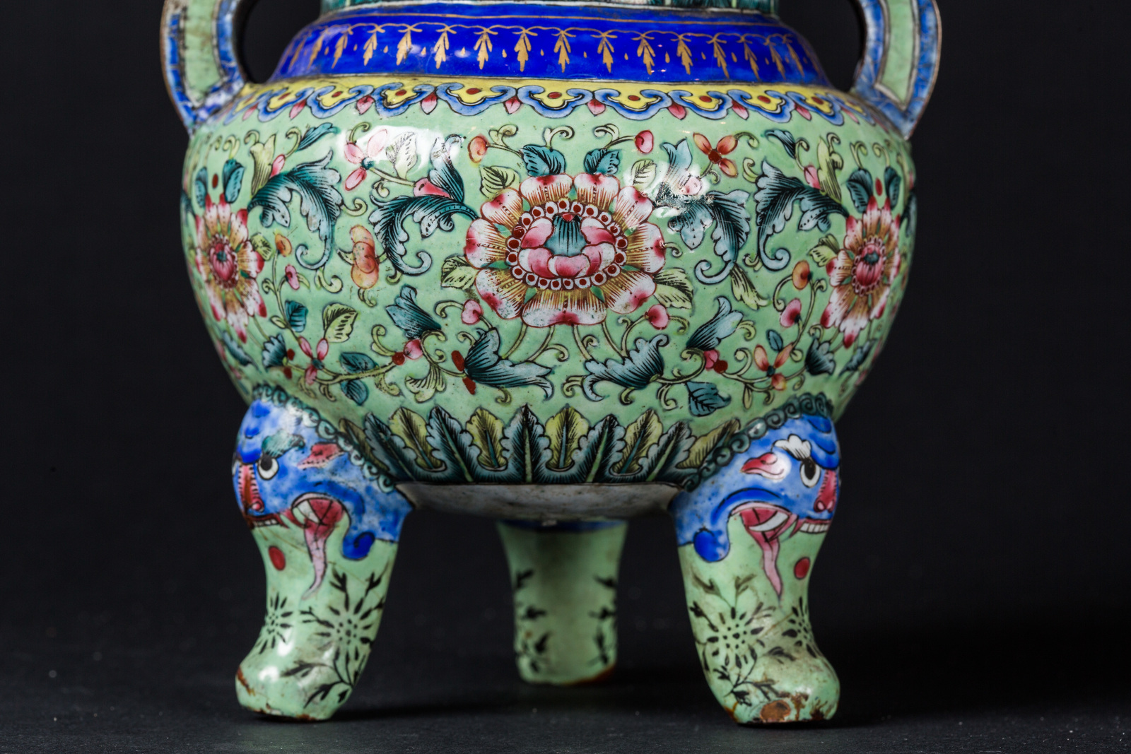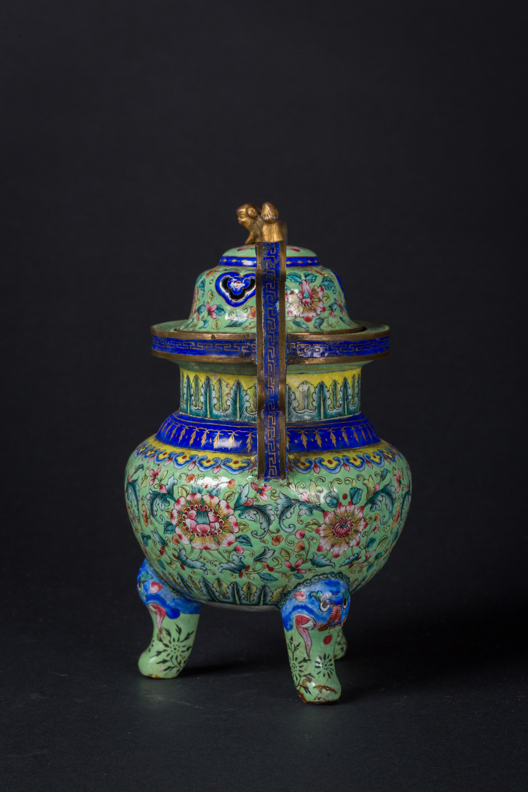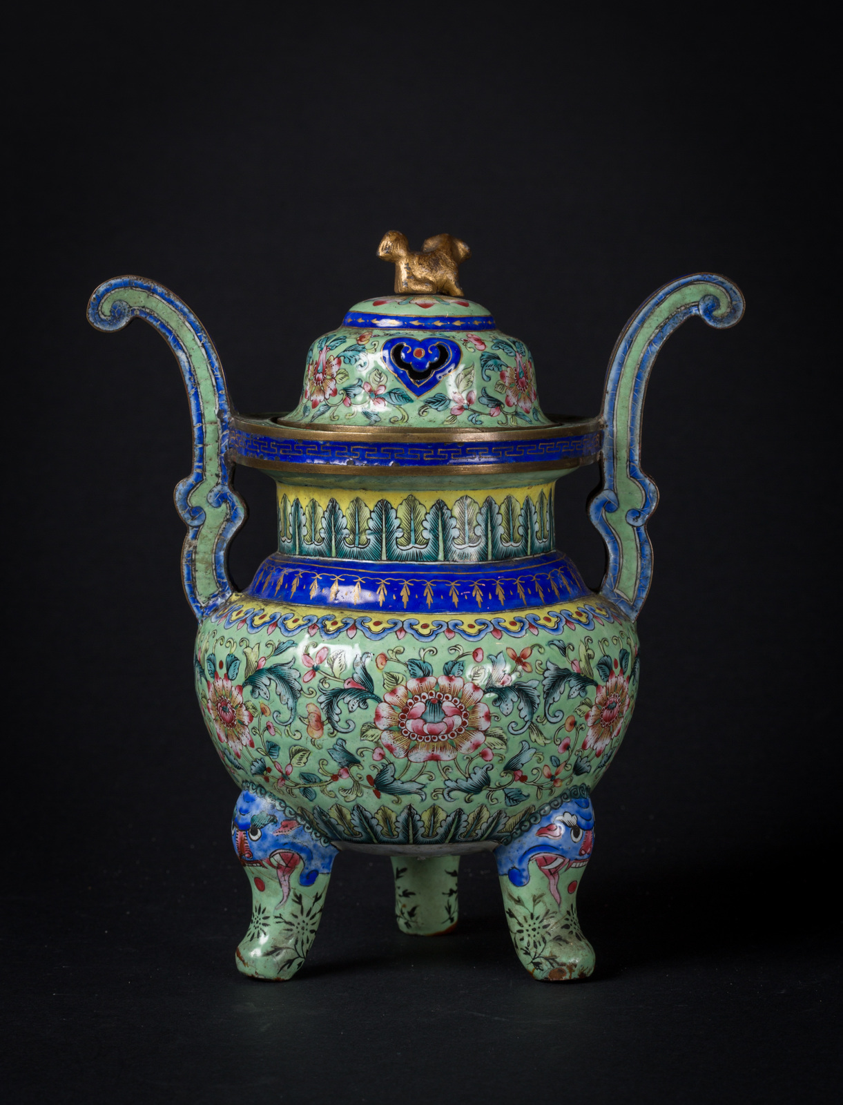 Cina, XIX secolo . -. Cm 17,50 x 20,00. Recipiente tripode con lunga doppia ansa, smaltato a motivo floreale su fondo verde acqua. Il coperchio termina con un'impugnatura a forma di cane di pho.