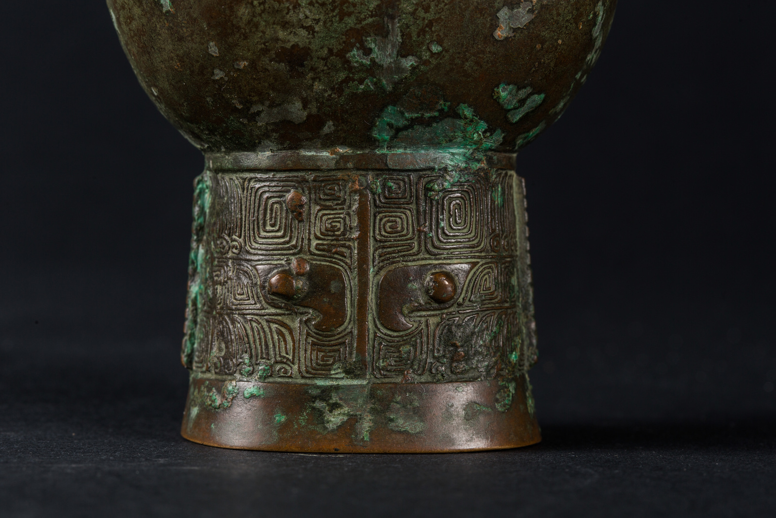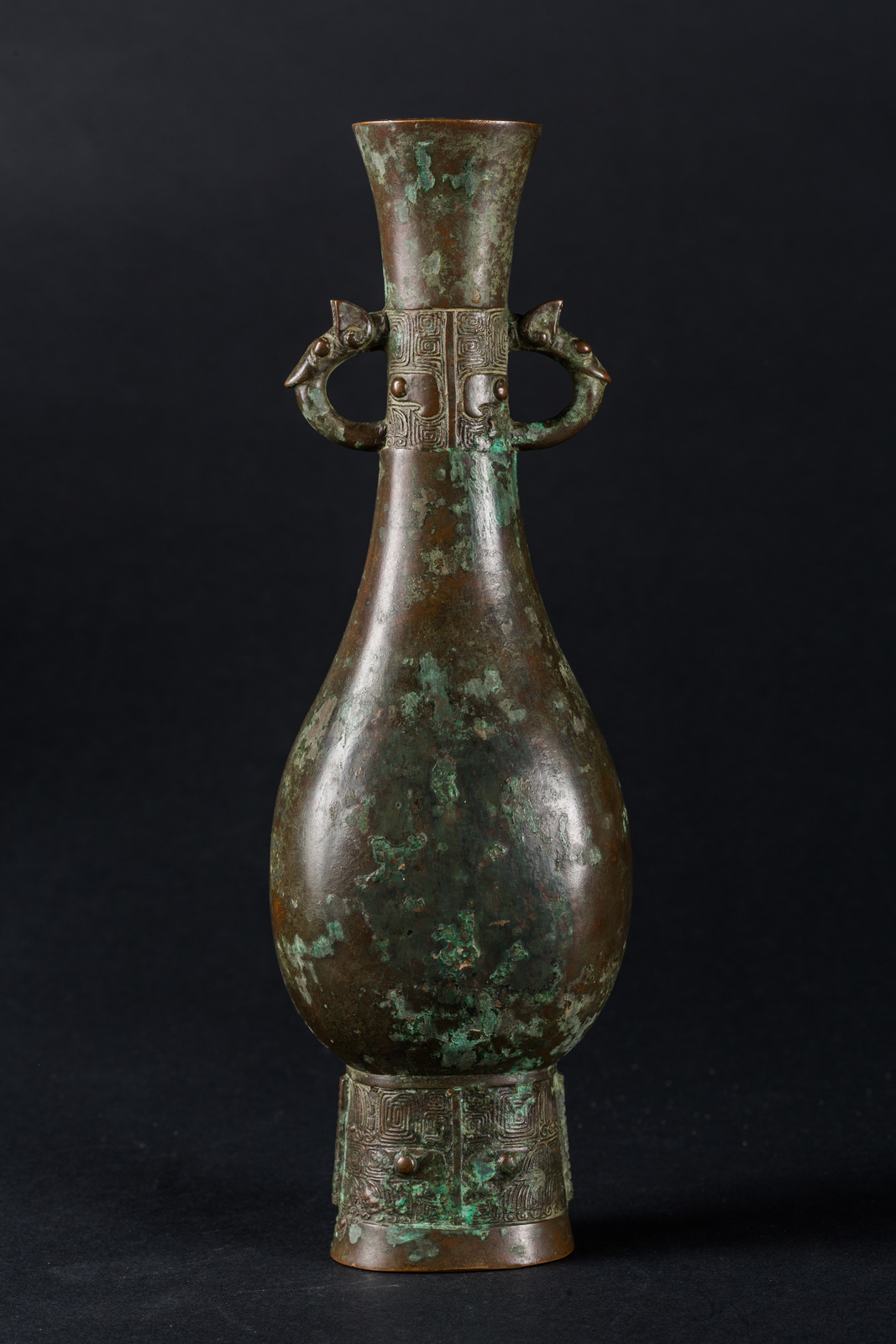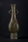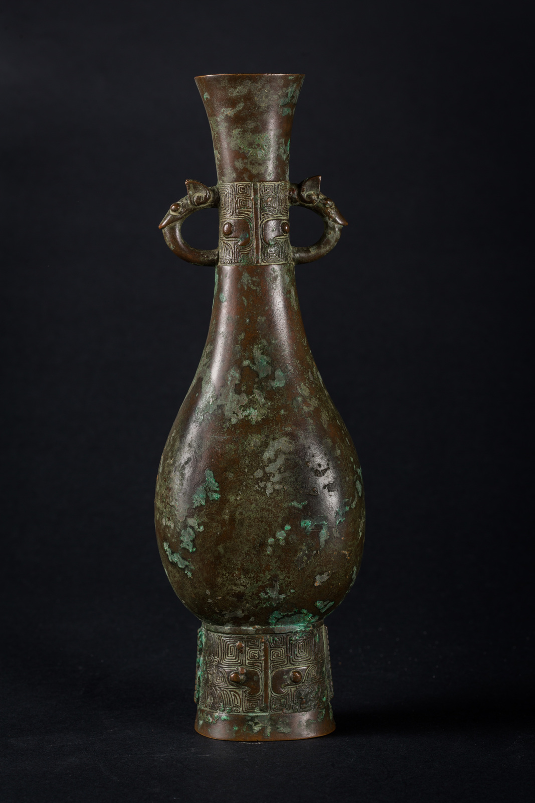 Cina o Giappone XVI secolo. -. Cm 27,50. Fusione in bronzo a patina verde poggiante su alto piede decorato con taotie, corpo piriforme, doppia ansa zoomorfa che si innesta su una seconda fascia decorativa con mascheroni arcaici e bocca svasata.