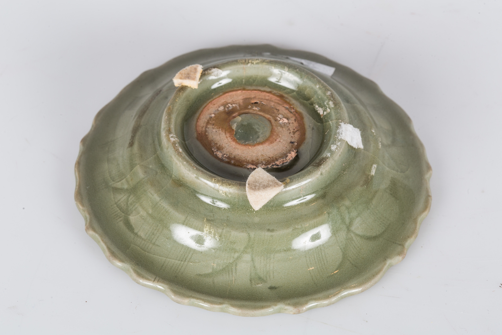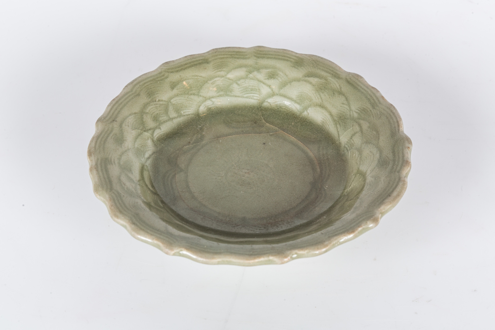 Arte Cinese A celadon glazed earthenware dish carved with flower and petals