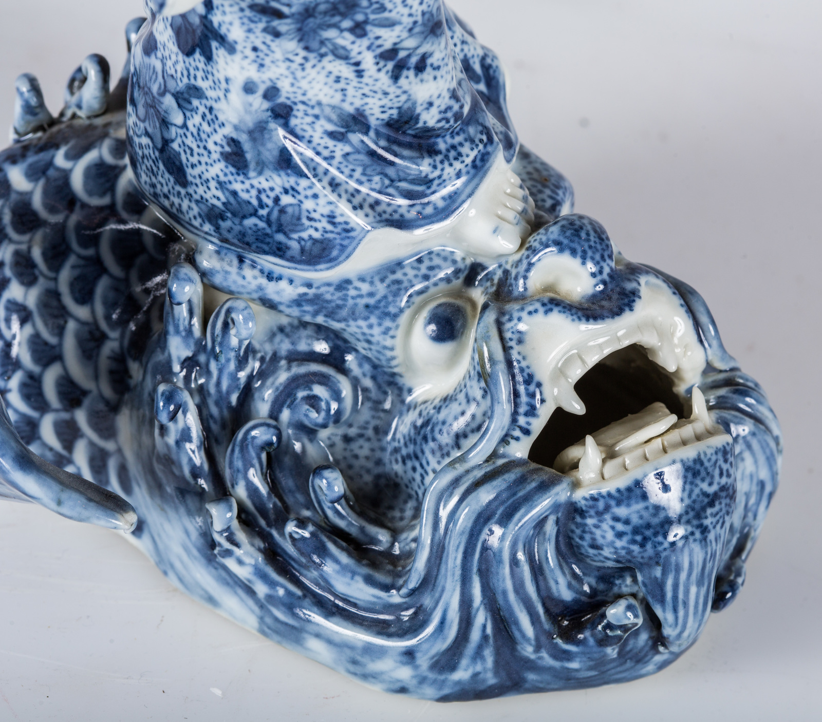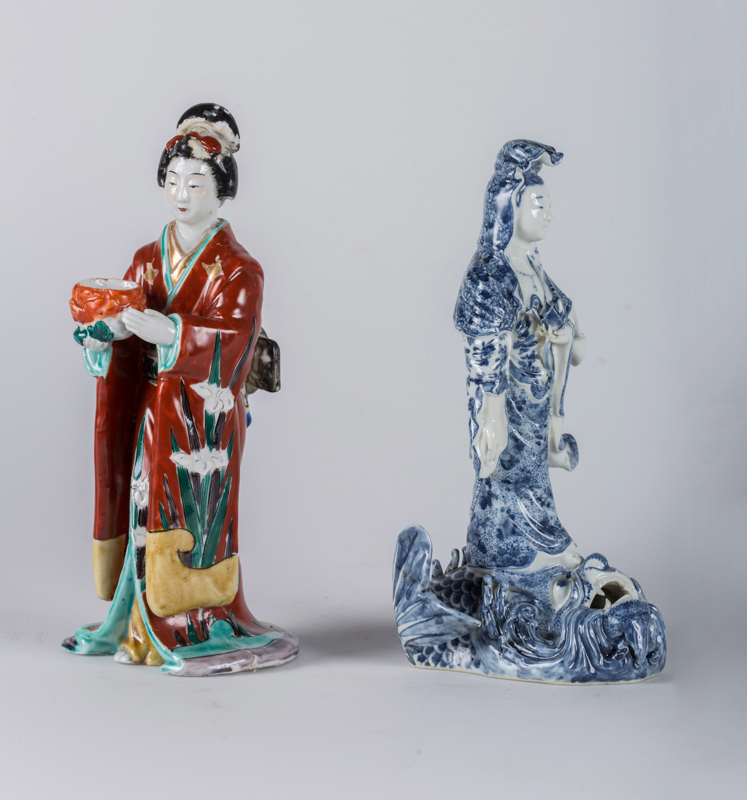 Giappone, XX secolo . -. Cm 26,50. Una figura di Geisha in ceramica smaltata (h. 26,5 cm) e figura di Kannon stante su un pesce in porcellana bianco/blu (h. 23,5 cm).