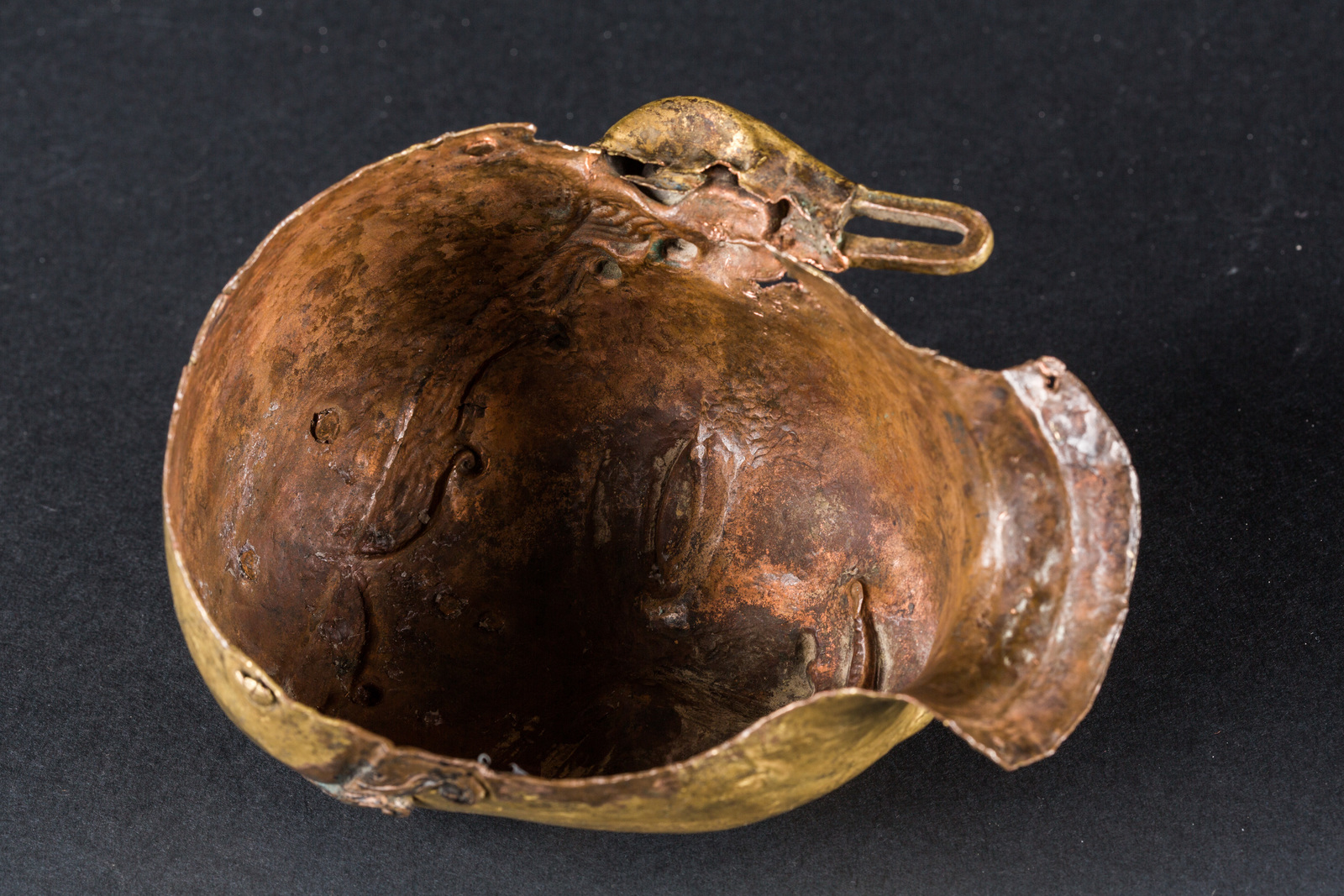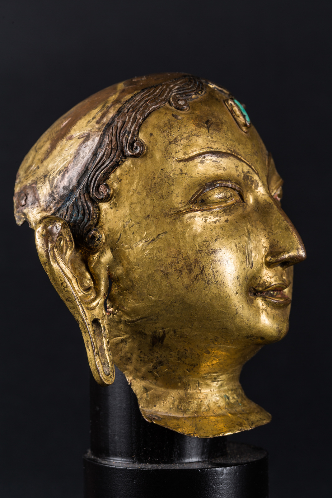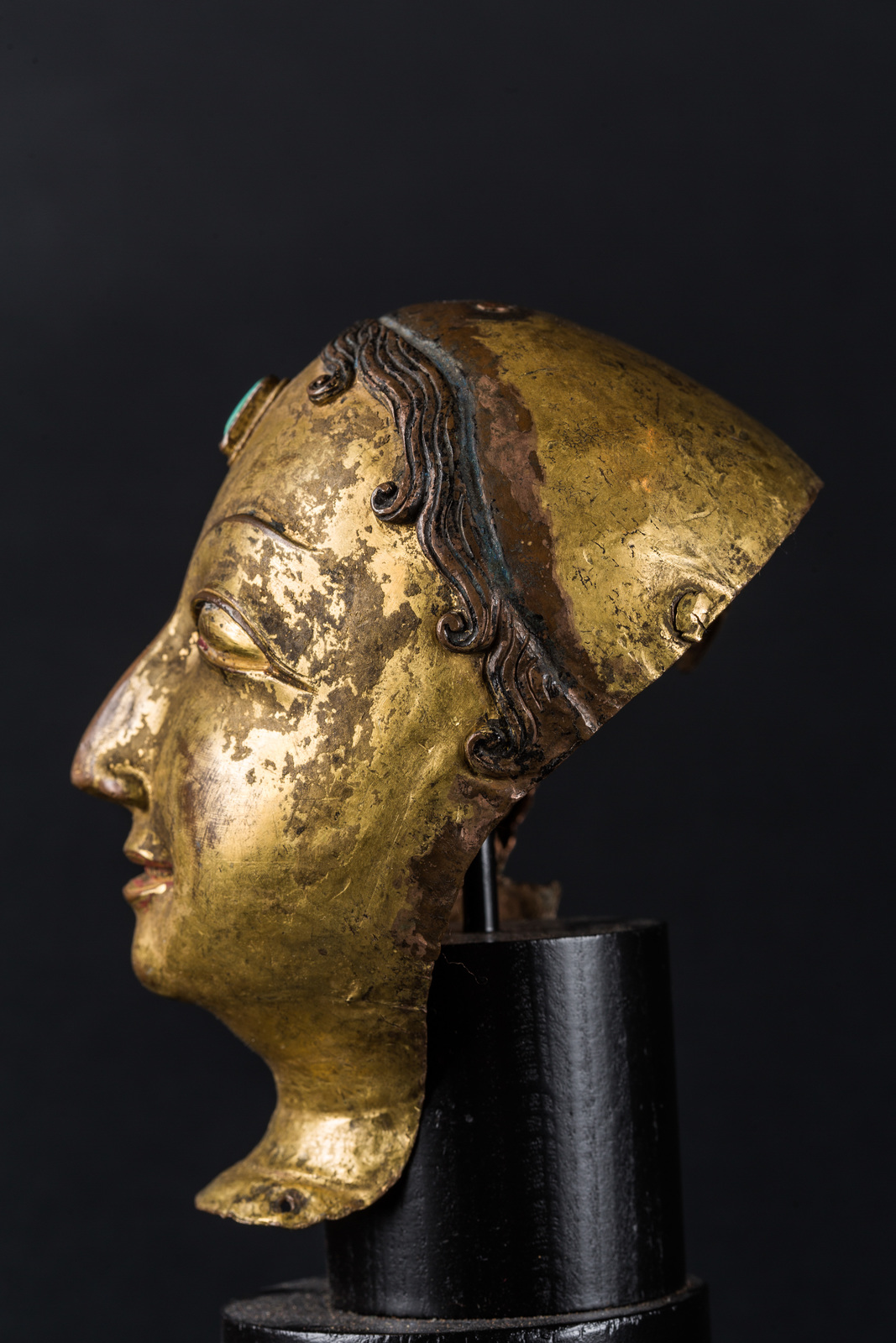 Tibet, XVII secolo . -. Cm 11,00 x 14,00. Testa finemente sbalzata, probabilmente raffigurante Tara Bianca. Su tutta la superficie dell'opera è presente una lamina d'oro e cospicue tracce policrome su occhi e bocca. L'opera è arricchita da una turchese incastonata sulla fronte, a rappresentare il terzo occhio. Da notare il fine lavoro della capigliatura e dei denti.