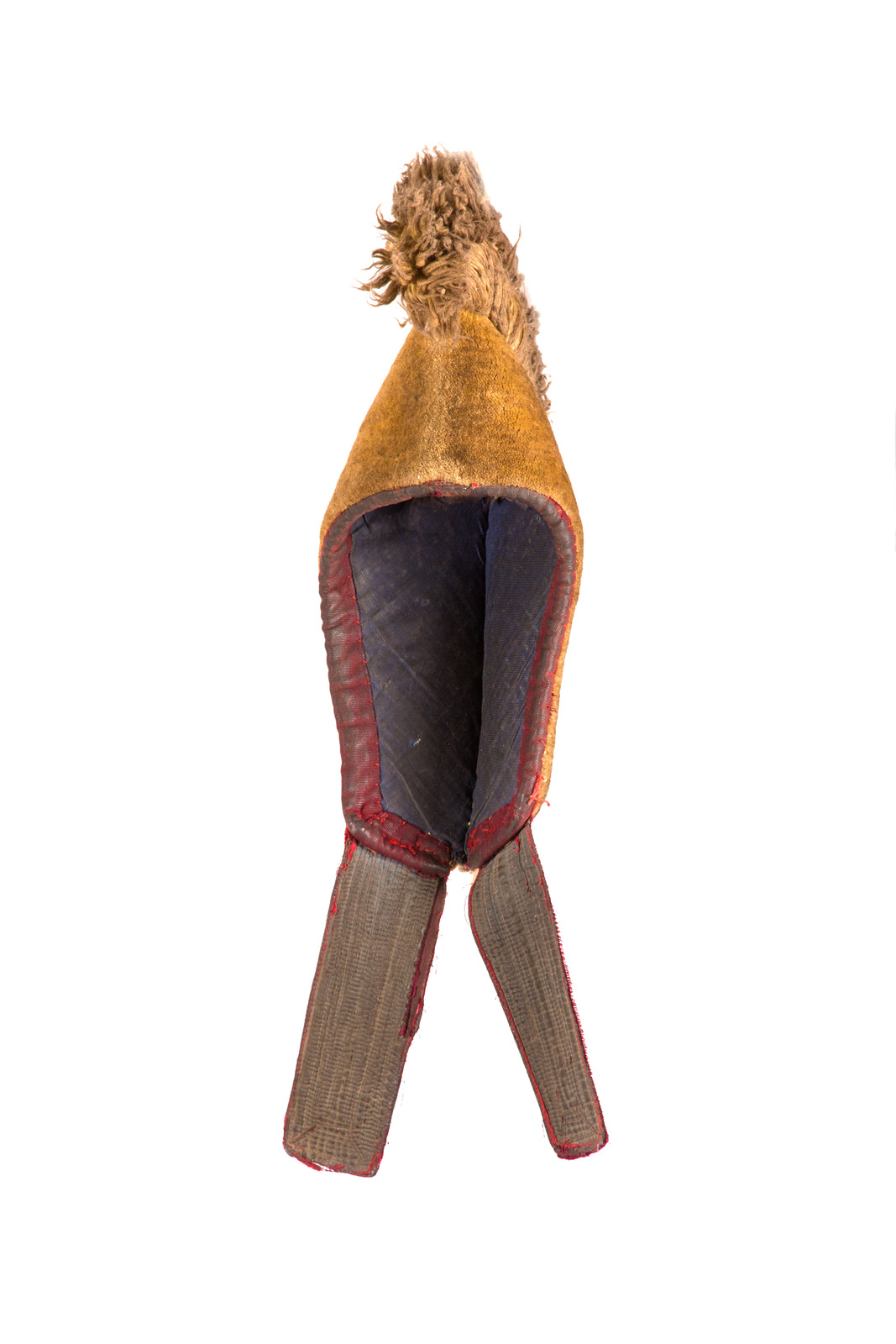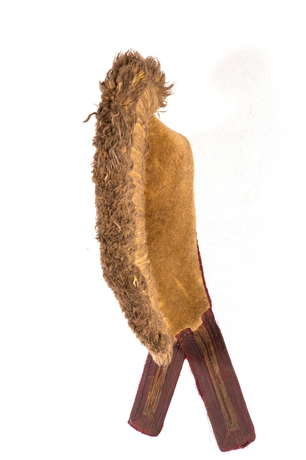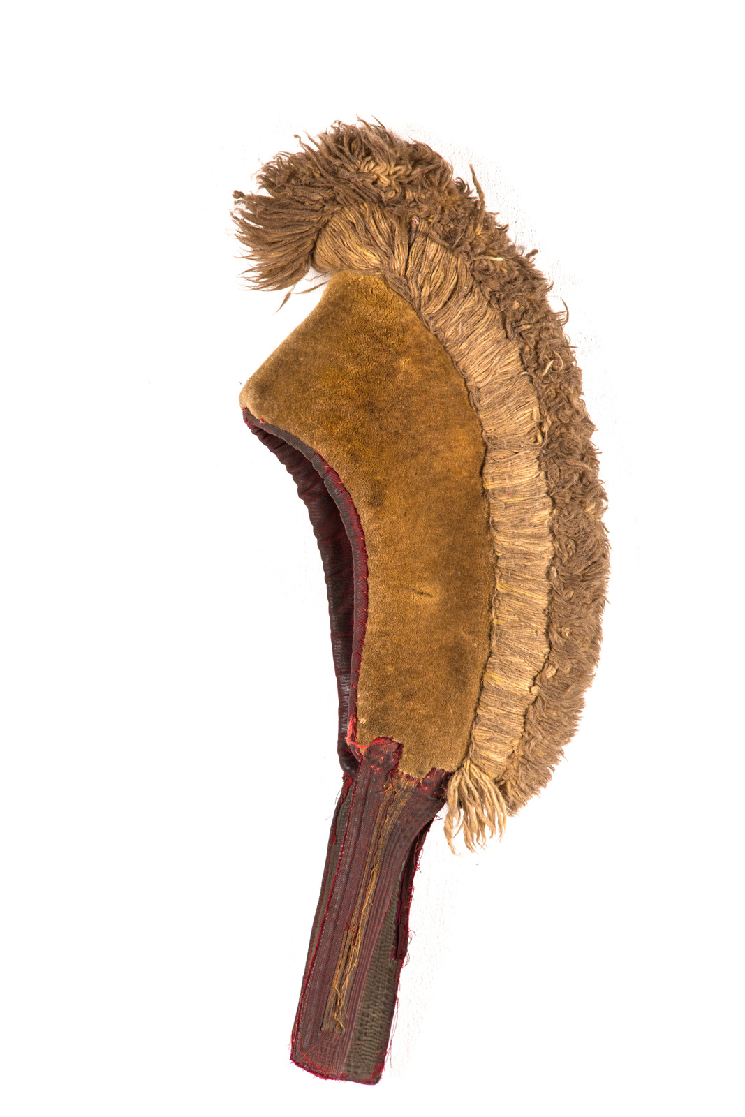 Tibet, XVIII - XIX secolo. -. Cm 36,00 x 52,00. Alto copricapo da cerimonia della scuola buddhista dei berretti gialli Gelugpa, intessuto in lana e rifinito con criniera.
