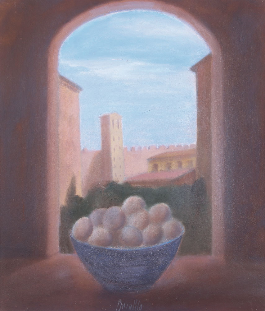 FRANCO BERALDO Meolo (Ve) 1944 Natura morta nel paesaggio, 1993 strappo d'affresco su tela cm. 70x60, firma in basso al centro, anno e firma al retro, dichiarazione d'autenticità e archivio dell'artista numero 71393 su foto.