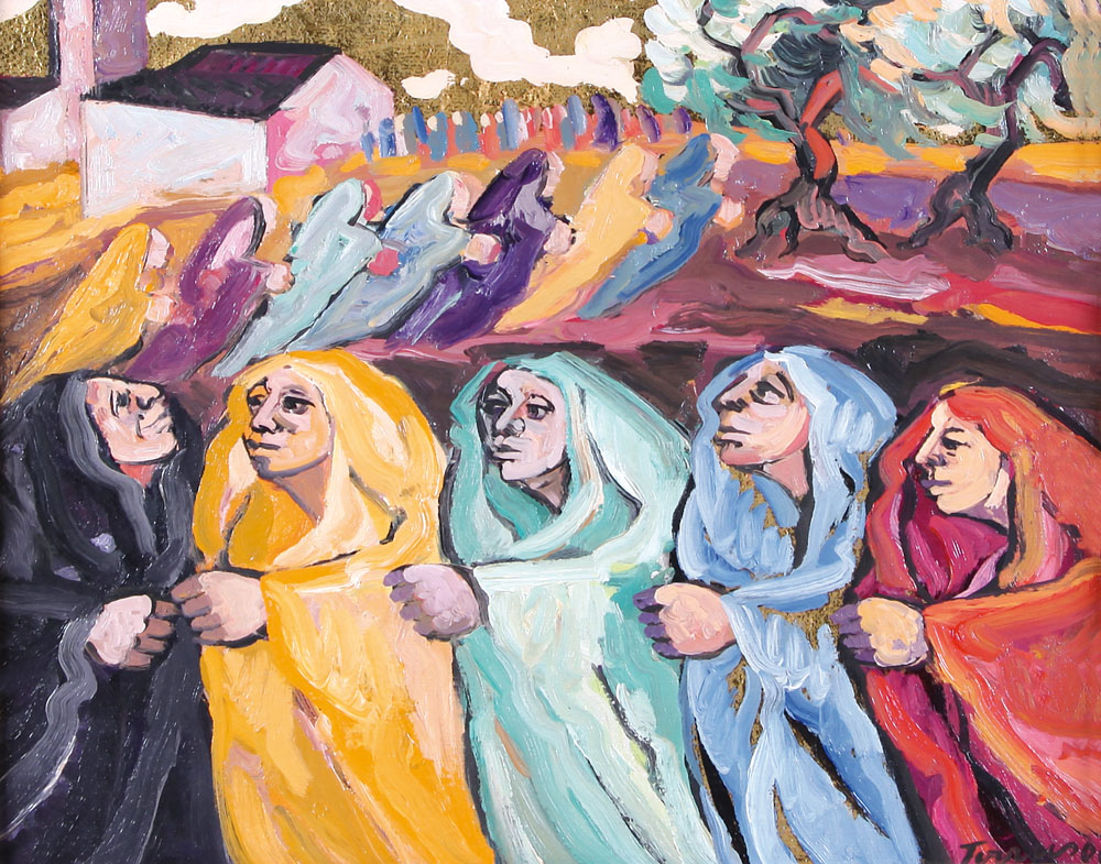 SAVERIO TERRUSO Monreale (Pa) 11/01/1939 - Milano 03/03/2003 Processione a Monreale olio su tela cm. 40x50, firma in basso a destra, titolo e firma al retro, timbro ad inchiostro ed a secco della Satena su foto.