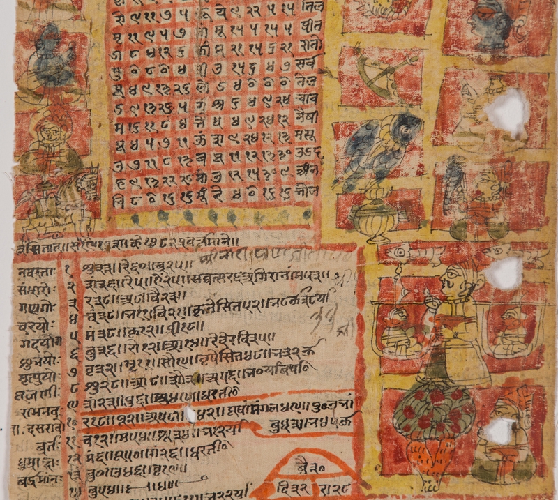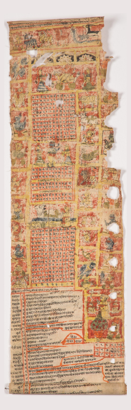 India, XVIII secolo . -. Cm 26,00 x 231,00. Lungo tessuto, parzialmente dipinto, con lunghe iscrizioni probabilmente riferibili a previsioni astrologiche.