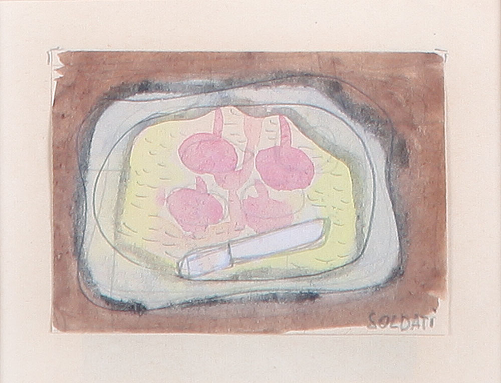 ATANASIO SOLDATI Parma 25/08/1896 - Parma 27/08/1953 Natura morta penna e acquerello su carta cm. 5,5x7,5; firma in basso a destra, timbro dell'Archivio Atanasio Soldati al retro.