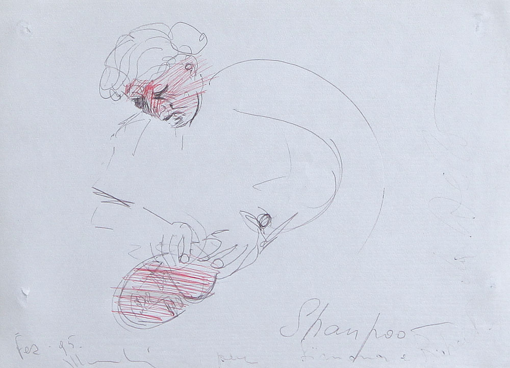 ALDO MONDINO Torino 04/10/1938 - 10/03/2005 Shampo, 1995 tecnica mista su carta cm. 24,5x33,5; firma e anno in basso a sinistra, titolo in basso a destra, dedica ad personam in basso, dichiarazione d'autenticità dell'artista su foto.
