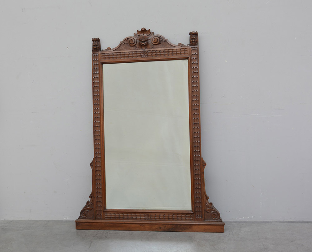 Specchiera rettangolare con cimasa sagomata e intagliata con mascheroni e motivi vegetali (cm 163x120)